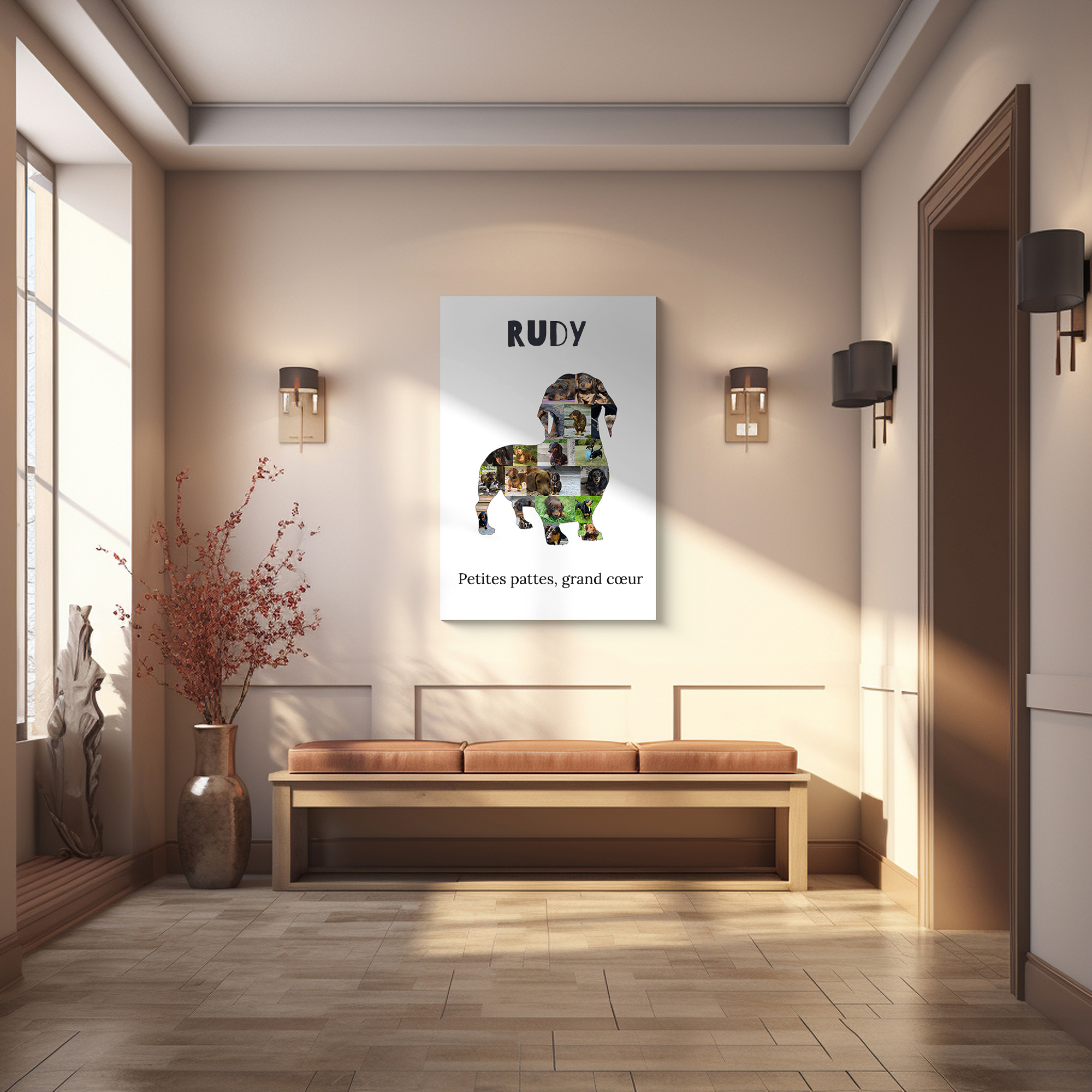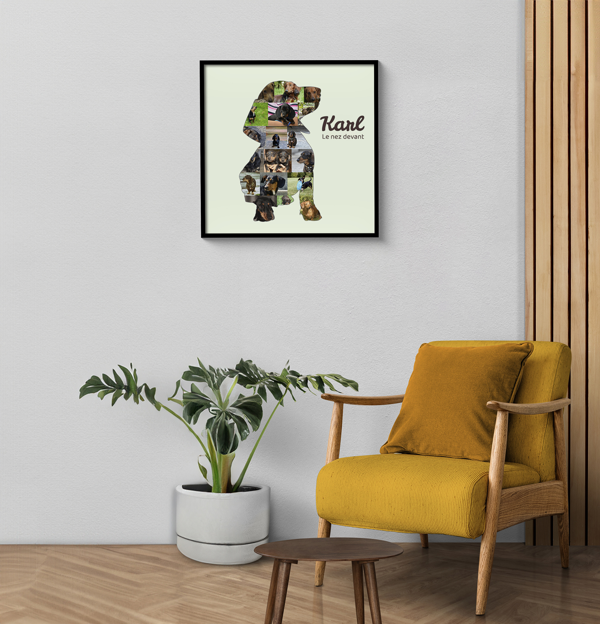 Personnaliser ta collage n'a jamais été aussi simple. Choisis la silhouette du teckel, télécharge tes photos directement sur notre application web intuitive et ajuste chaque image pour qu'elle s'intègre parfaitement. En un rien de temps, ta création est prête à être admirée sur tes murs.