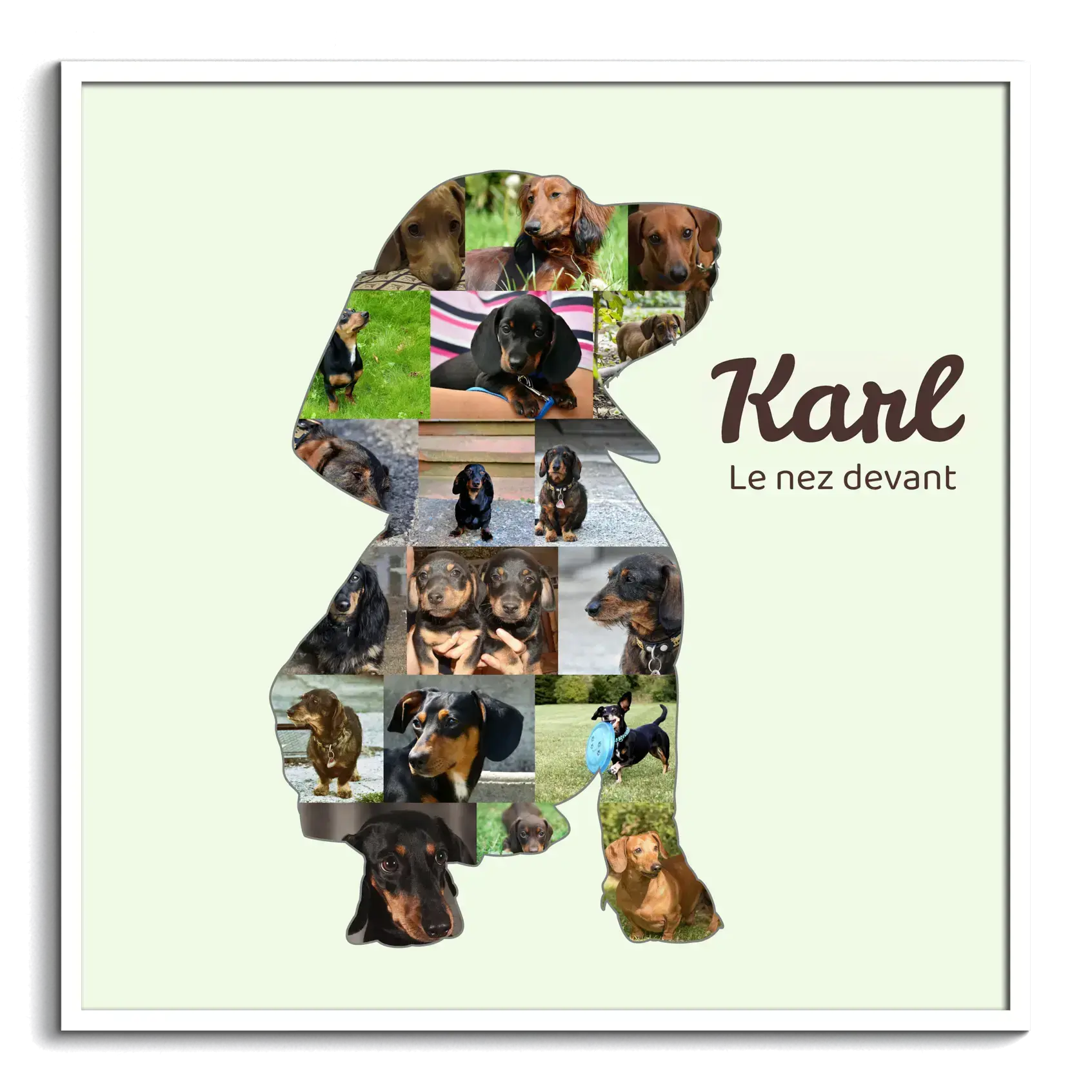 Crée ta propre œuvre d'art personnalisée avec notre collage photo unique, conçu spécialement pour les propriétaires de chiens. Imprime ton amour pour ton fidèle compagnon grâce à notre silhouette de teckel que tu peux remplir avec 15 à 20 de tes photos préférées. Ajoute une touche personnelle avec des textes comme "avec le museau devant" ou "petites pattes, grand cœur".