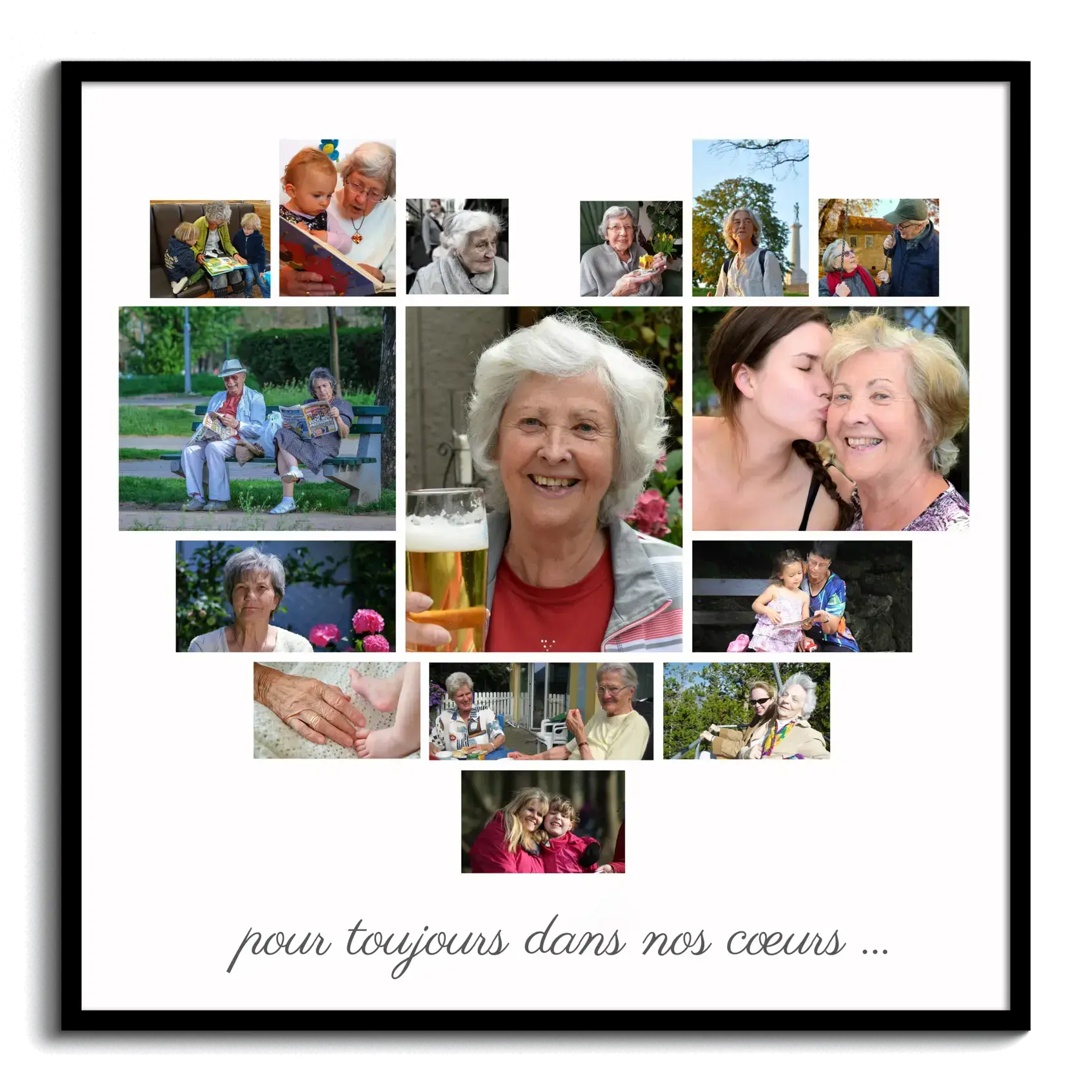 Hommage émotive : collage en cœur de 15 photos, "pour toujours dans le cœur."