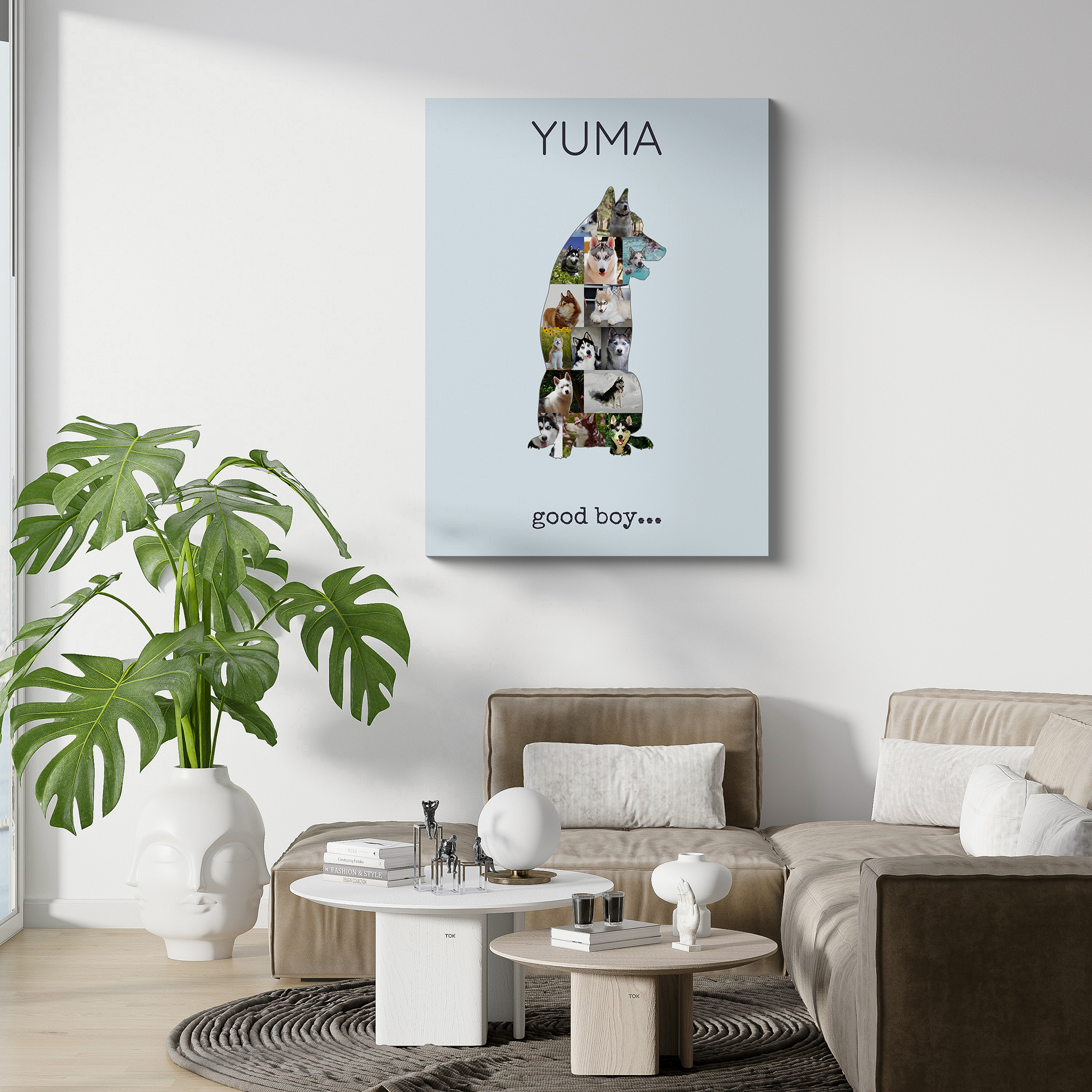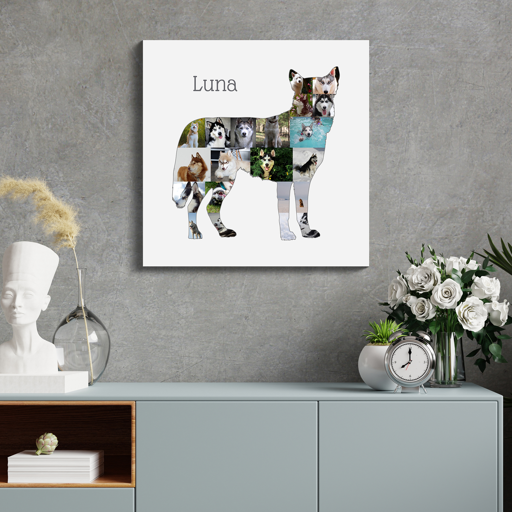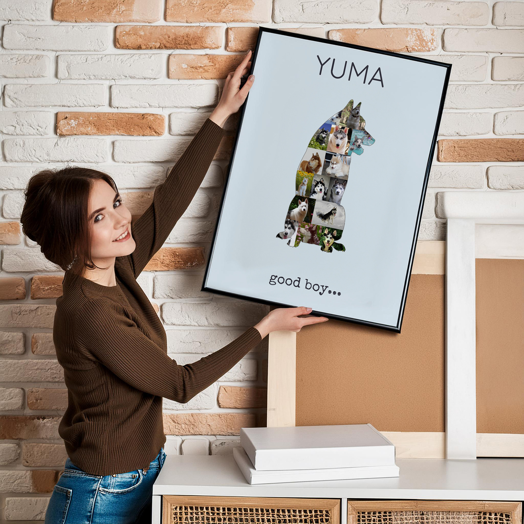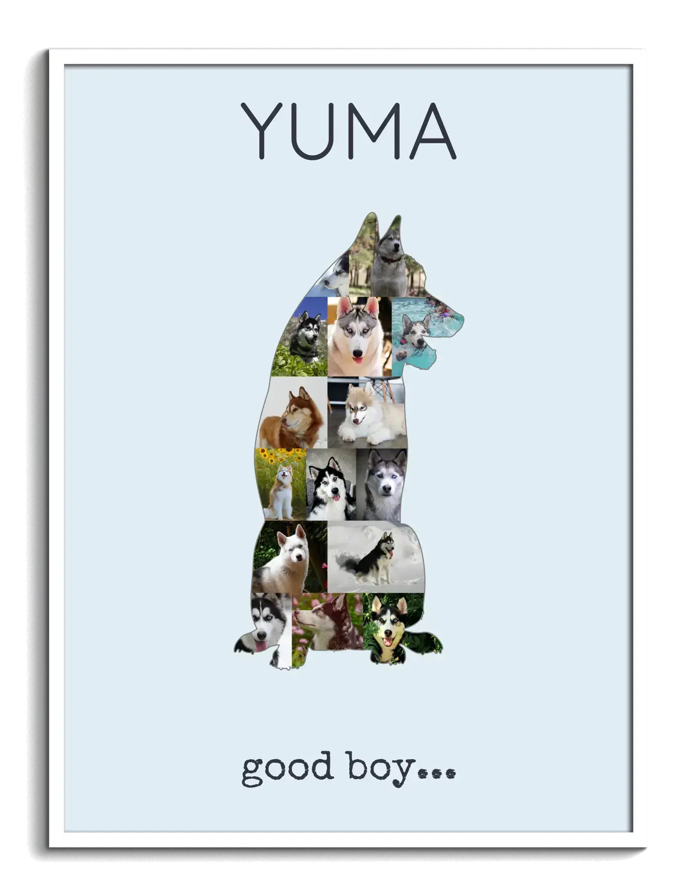 Créez votre propre collage photo personnalisé avec notre produit unique conçu spécialement pour les propriétaires de chiens. Imaginez la silhouette d'un Siberian Husky assis ou debout, magnifiquement remplie de 15 à 20 de vos propres photos. Ajoutez-y votre texte personnel, comme "good boy". Cette création est le cadeau parfait pour les amoureux des chiens qui souhaitent conserver une mémoire artistique de leur compagnon à quatre pattes.