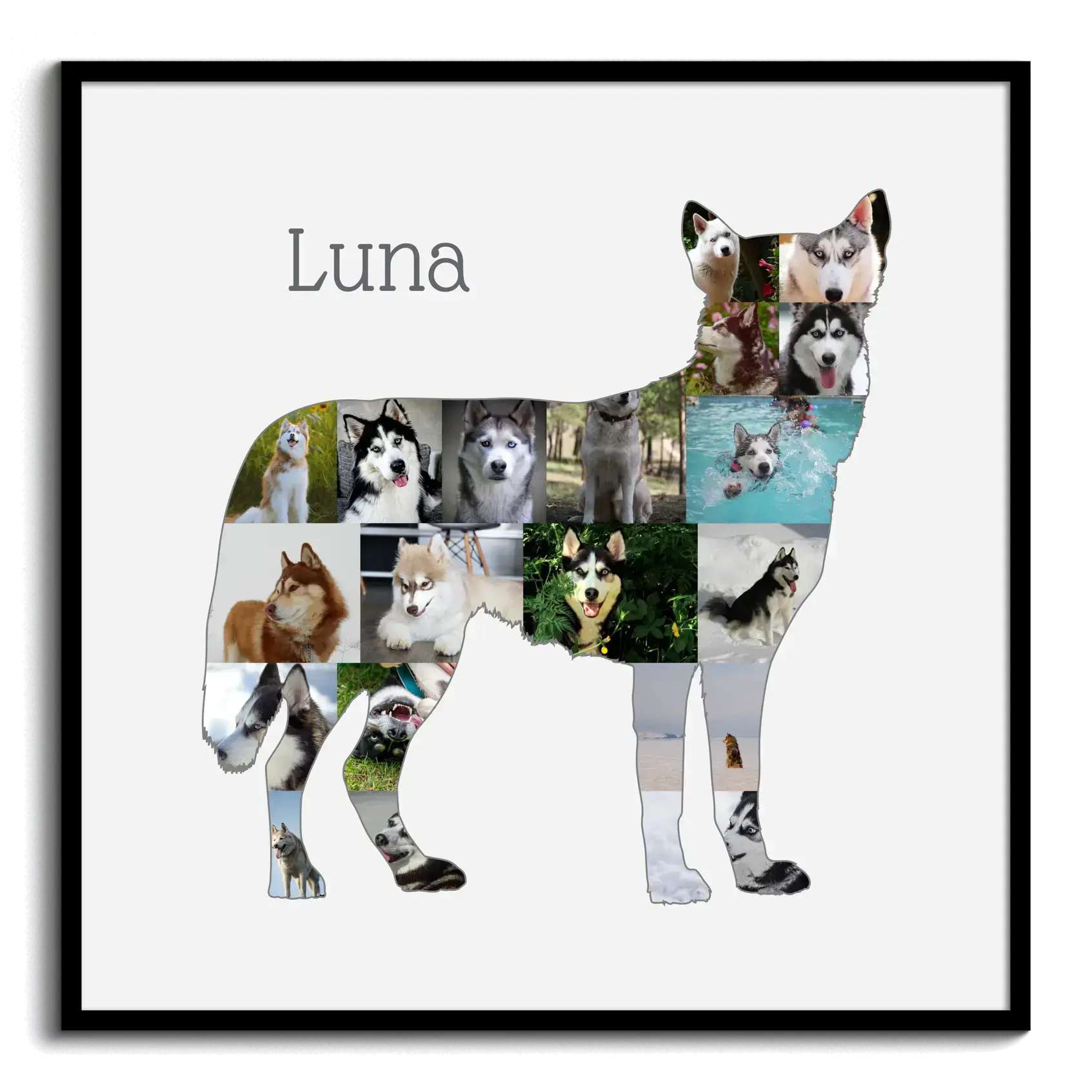Pour créer votre collage, sélectionnez simplement une silhouette de Husky et téléchargez vos photos préférées. Personnalisez la mise en page avec notre outil en ligne intuitif, sans besoin de logiciel supplémentaire. Ajoutez un texte personnalisé et modifiez les couleurs selon vos envies. Lorsque vous êtes satisfait, placez votre commande en quelques clics.