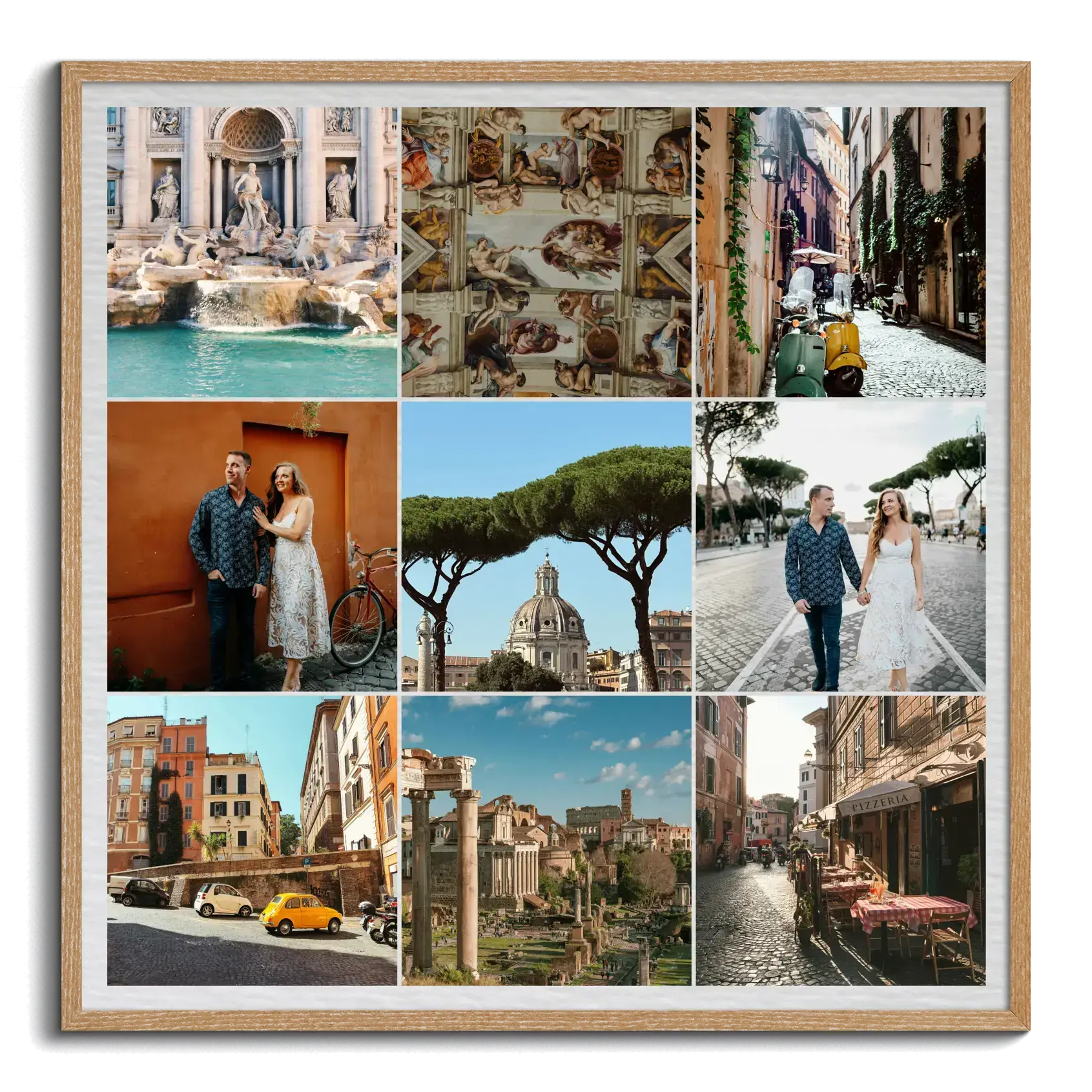 La personnalisation laisse une grande liberté. Différentes tailles sont proposées, avec un nombre d’images variable selon la composition souhaitée. Les photos de voyage peuvent être disposées dans un style épuré ou plus vivant, avec fond uni, fond texturé ou passe-partout rond, et avec ajout d’un titre, d’un lieu, d’une date ou d’un court texte. Chaque image peut être repositionnée et recadrée individuellement.