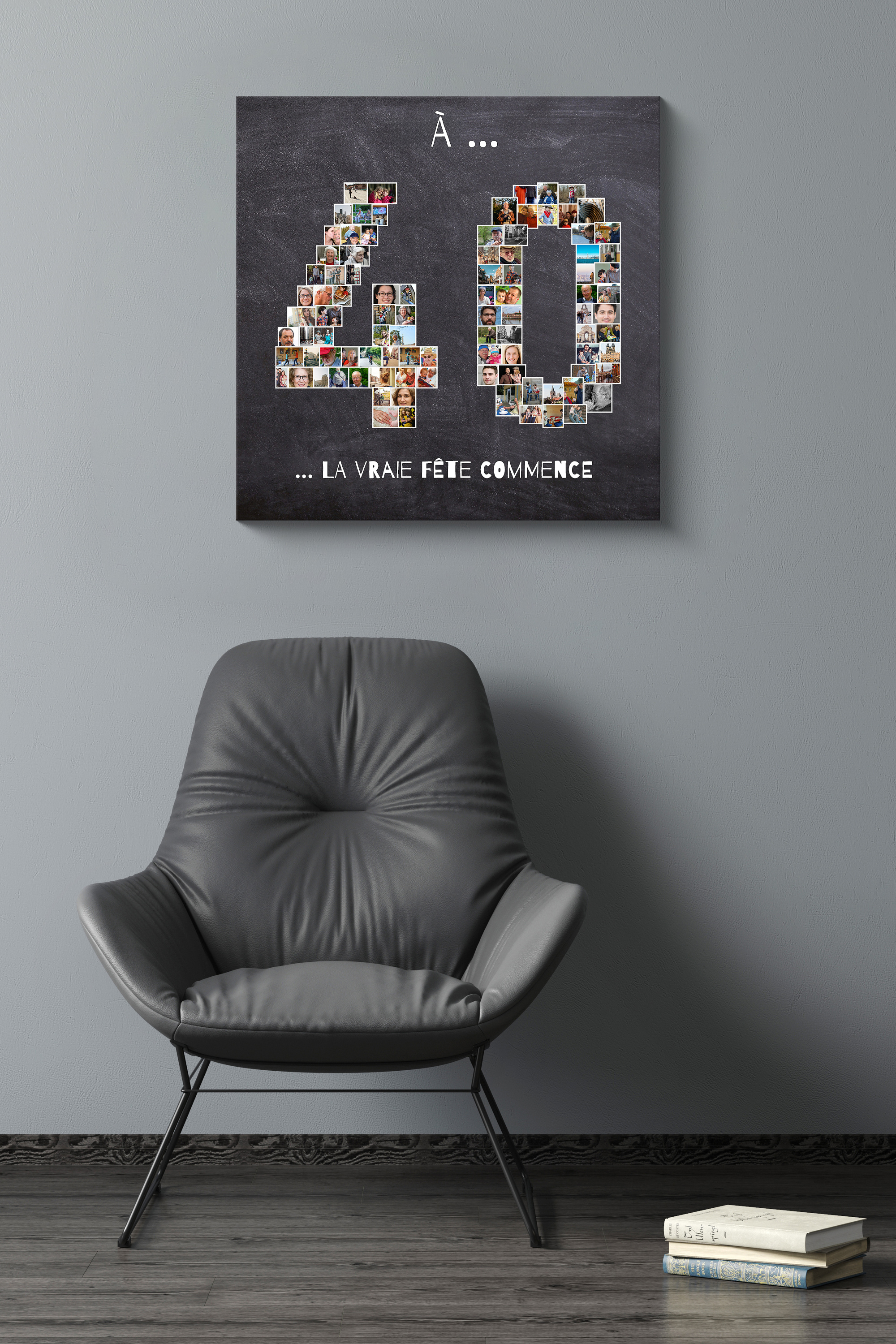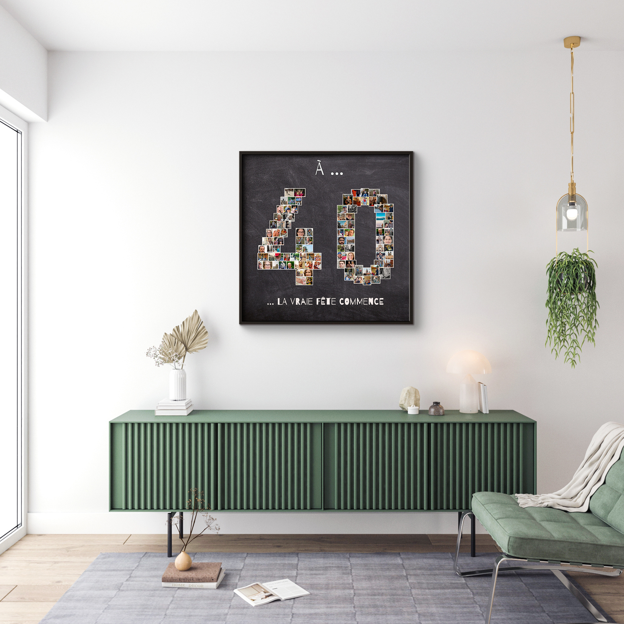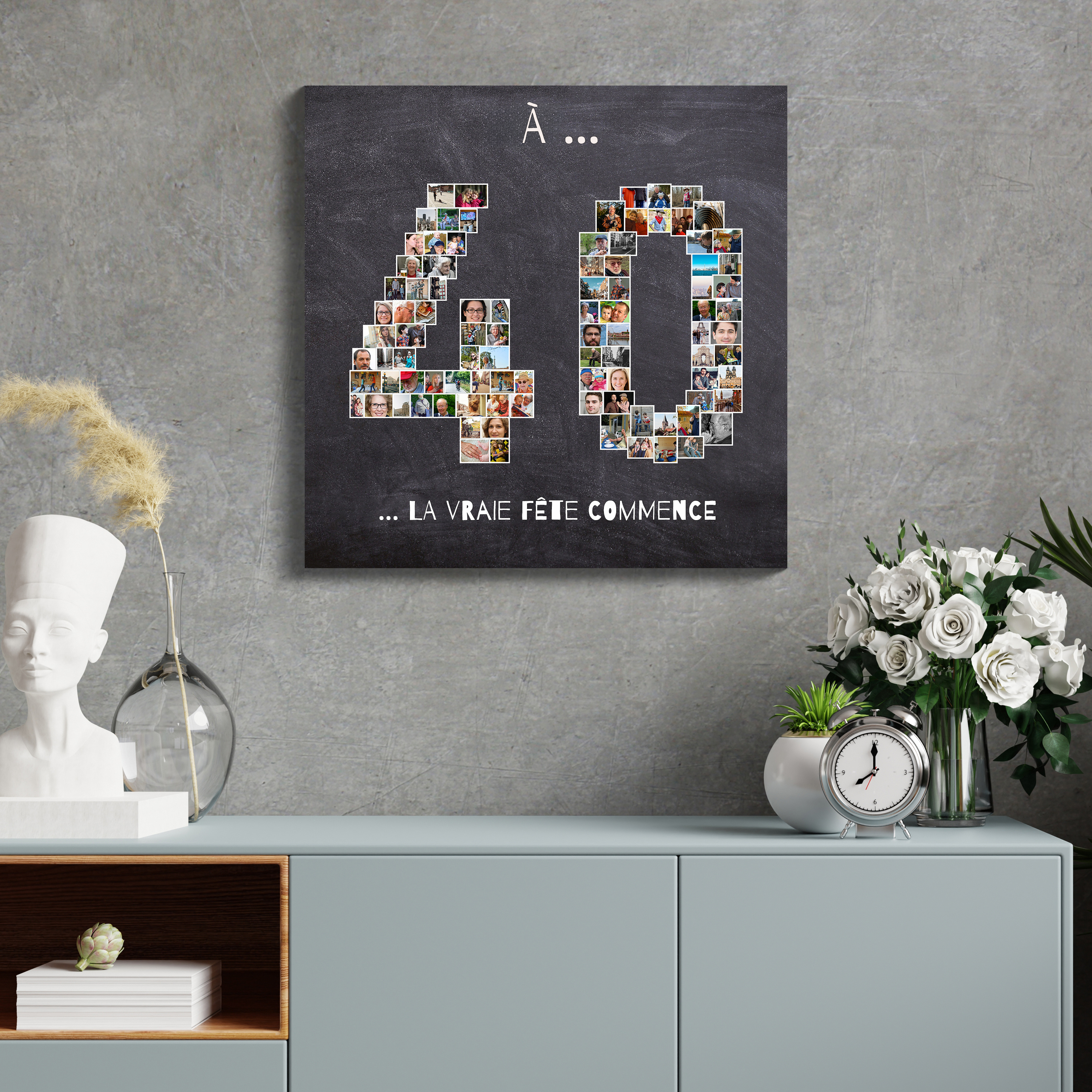 Créez une magnifique photo-collage pour un anniversaire spécial directement depuis notre site. Imaginez le nombre "40" formé par vos précieuses photos, accompagné d'une phrase humoristique. Personnalisez-la avec vos propres images et textes pour un cadeau unique ou une décoration parfaite pour la fête d'anniversaire.
