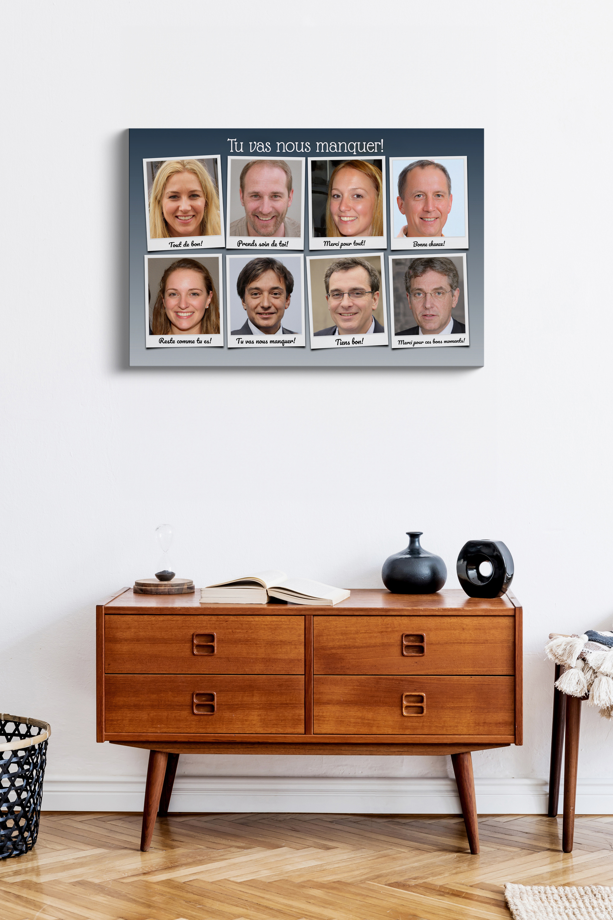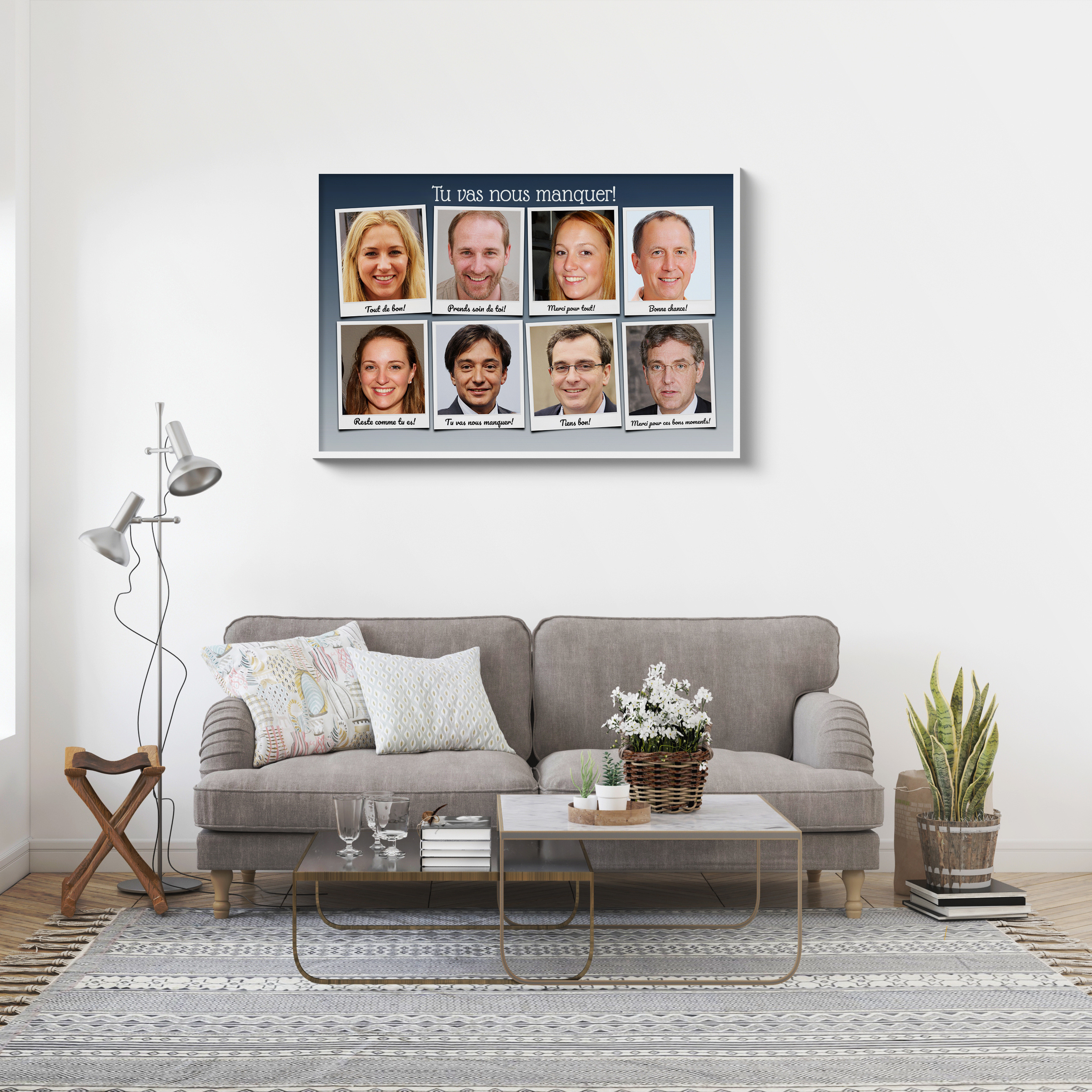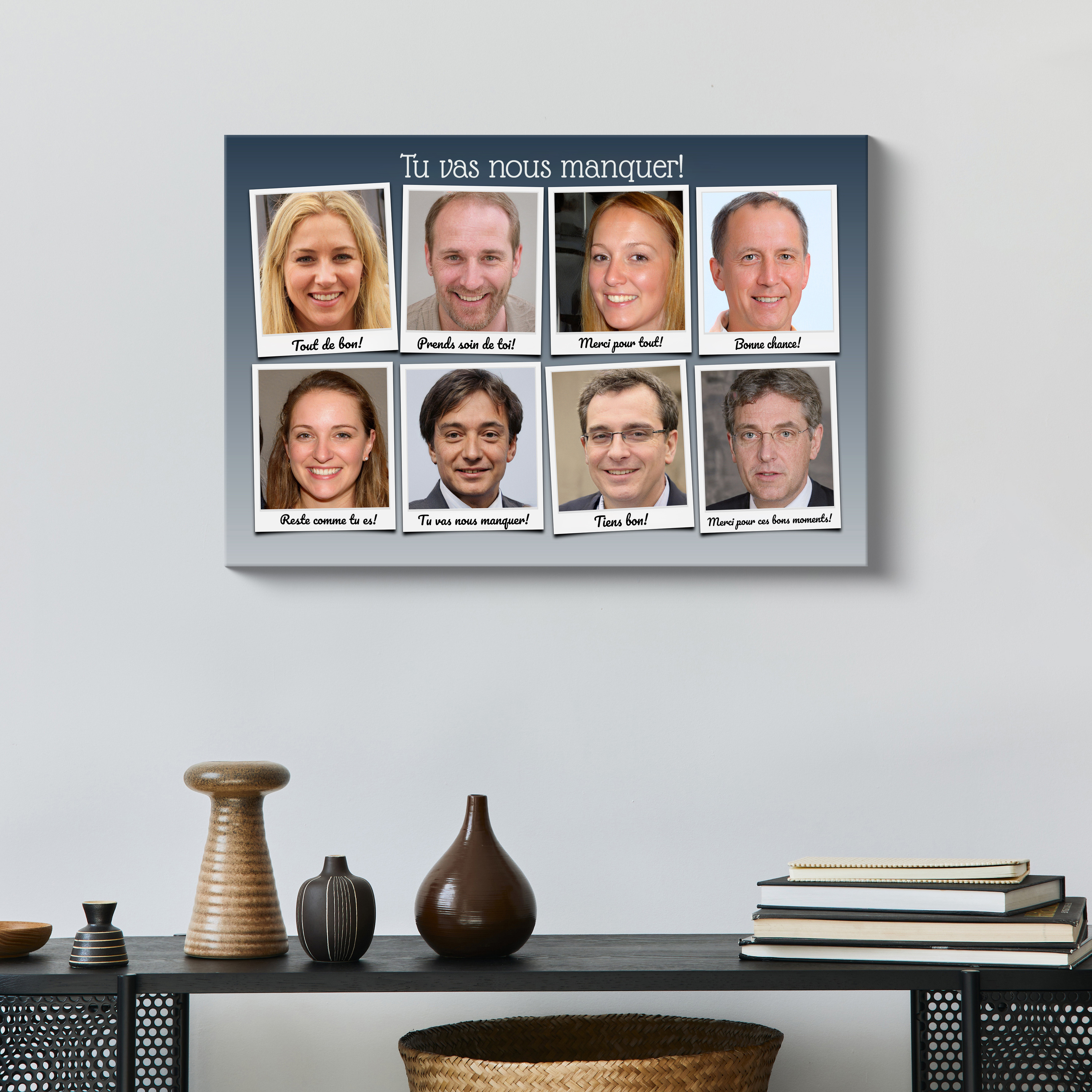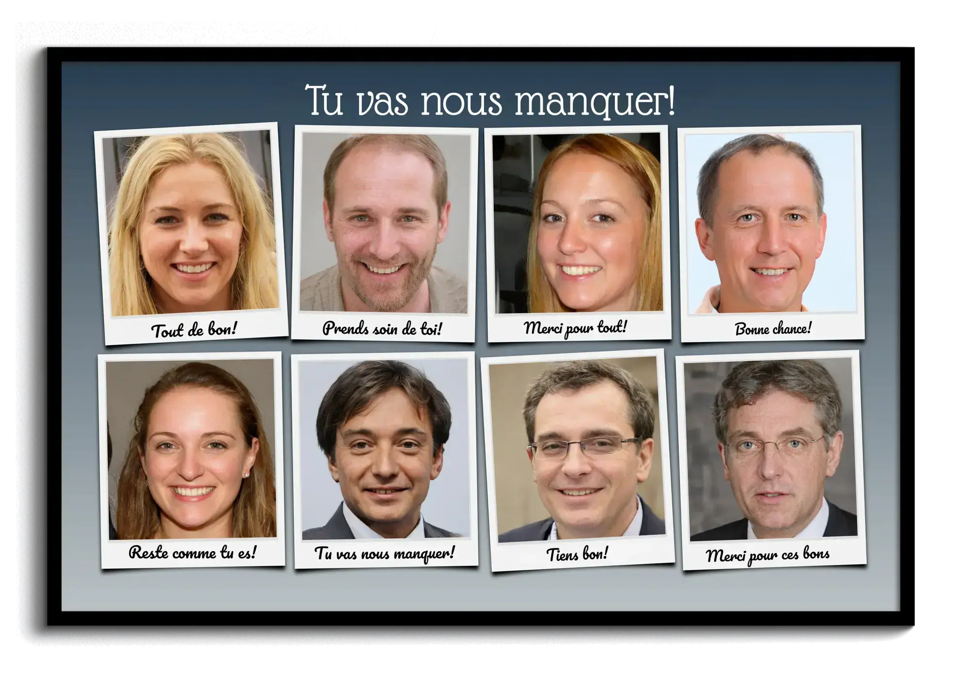 Créez dès maintenant votre propre souvenir inoubliable. Imaginons une collage photographique au style Polaroid, parfaite comme cadeau d'adieu ou d'anniversaire de votre groupe. Chaque photo de vos collègues est accompagnée d'un petit mot d'adieu, le tout surmonté d'un texte émouvant comme "nous allons te manquer". Personnalisez-la avec vos propres images et messages.