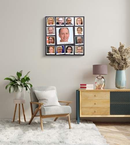 Créez votre propre chef-d'œuvre personnalisé avec notre produit de collage photo. Imaginez offrir une magnifique mosaïque de souvenirs, parfaite comme cadeau d'adieu pour une retraite ou un jubilé. Avec des photos individuelles accompagnées de leurs noms, et une image centrale avec une citation spéciale, notre collage "20 ans... mais qui compte" est façonné selon vos désirs.