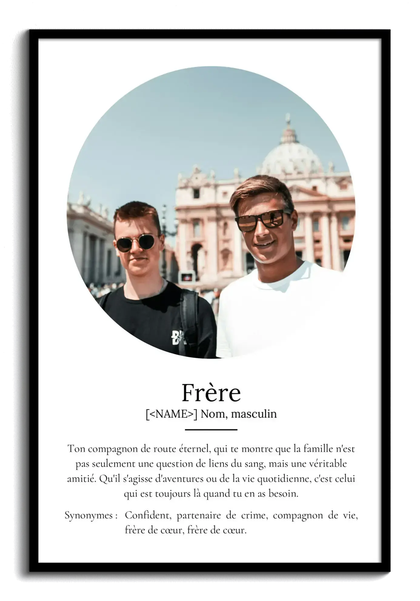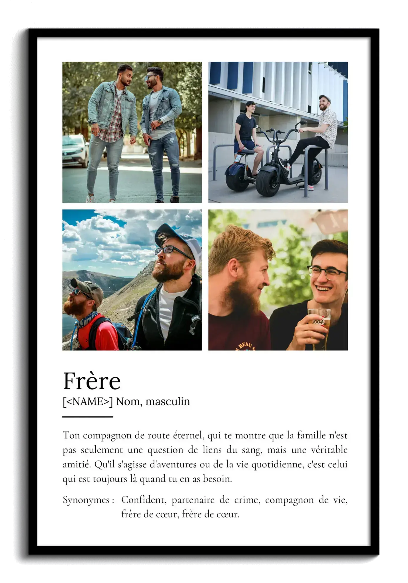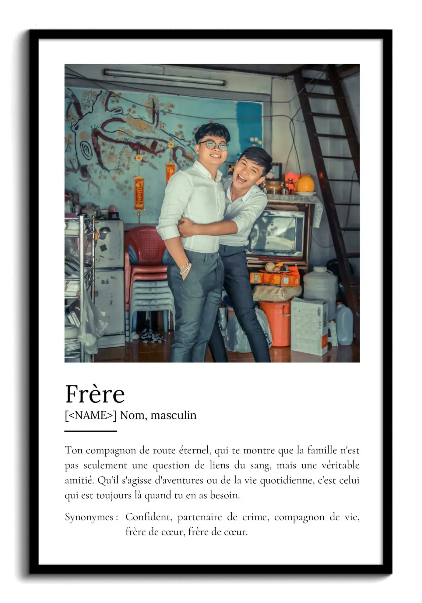 Offrez ce poster de définition "Frère" pour d'innombrables occasions : anniversaires, événements familiaux, remises de diplômes, ou simplement pour partager des moments d’émotion avec vos proches. C’est un cadeau qui captive par son authenticité et touche par sa personnalisation.
