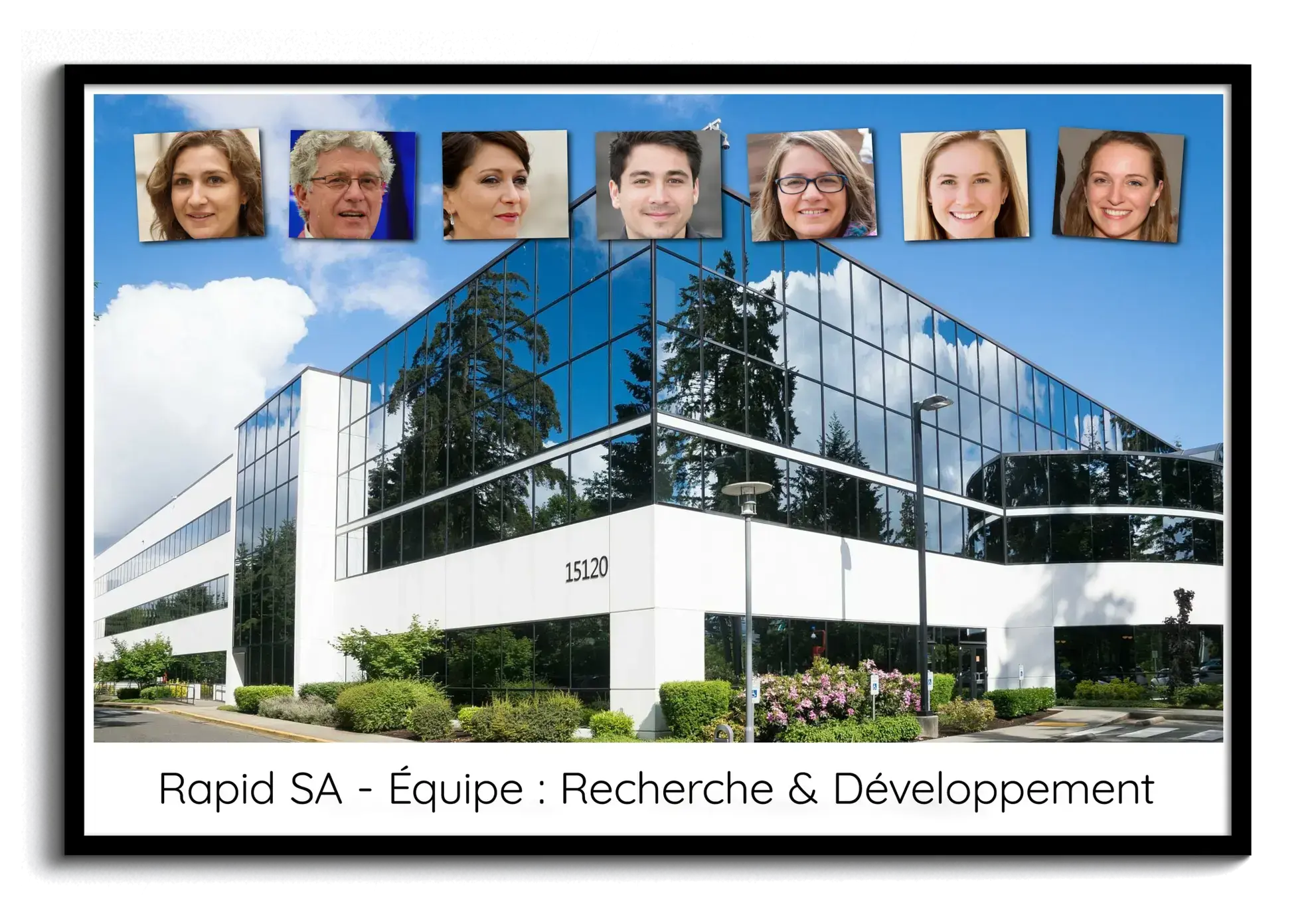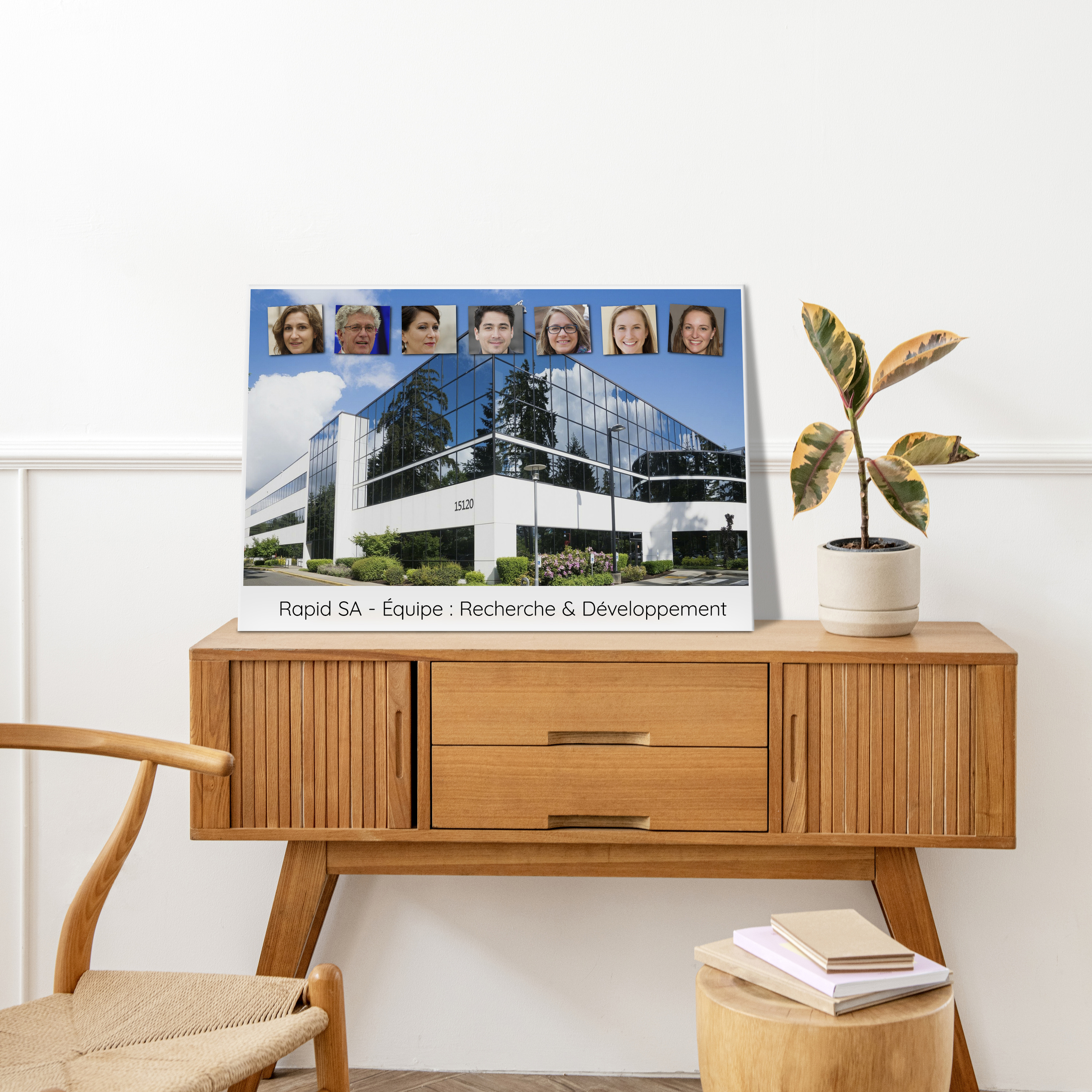 Créez votre propre souvenir unique avec notre collage photo personnalisable. Parfait pour embellir votre bureau d'entreprise ou offrir en souvenir à vos collègues, ce produit permet de mettre en avant votre photo de groupe ou votre bâtiment emblématique, entouré de portraits individuels de votre équipe. Personnalisez la légende pour capturer l'essence de votre département, tel que 'Rapid AG - Équipe : Recherche & Développement'.
