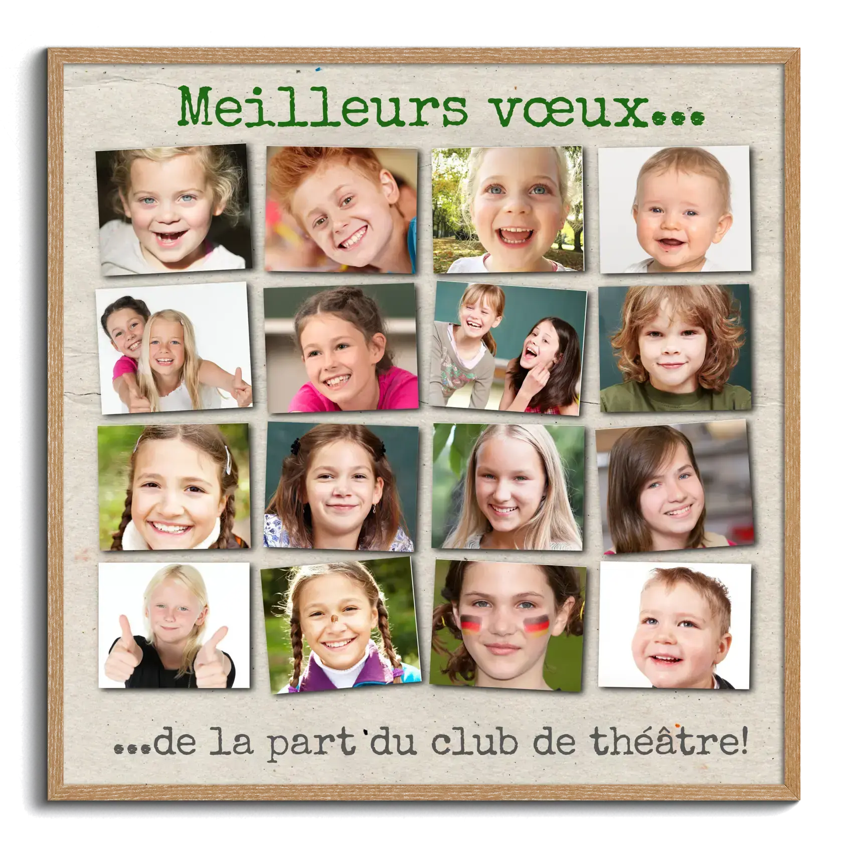 Créez votre propre collage photo unique et personnalisez-le selon vos envies ! Imaginez une création rassemblant les meilleurs moments de votre groupe scolaire, avec 16 photos d'élèves agencées en grille, accompagnées d'un message inspirant de votre choix : "Tout le meilleur de la part du club théâtre". Idéal à offrir à un enseignant, à exposer dans la salle d'activité ou à garder en souvenir pour les enfants et les parents. Chaque élément, des images aux couleurs et au texte, peut être personnalisé.