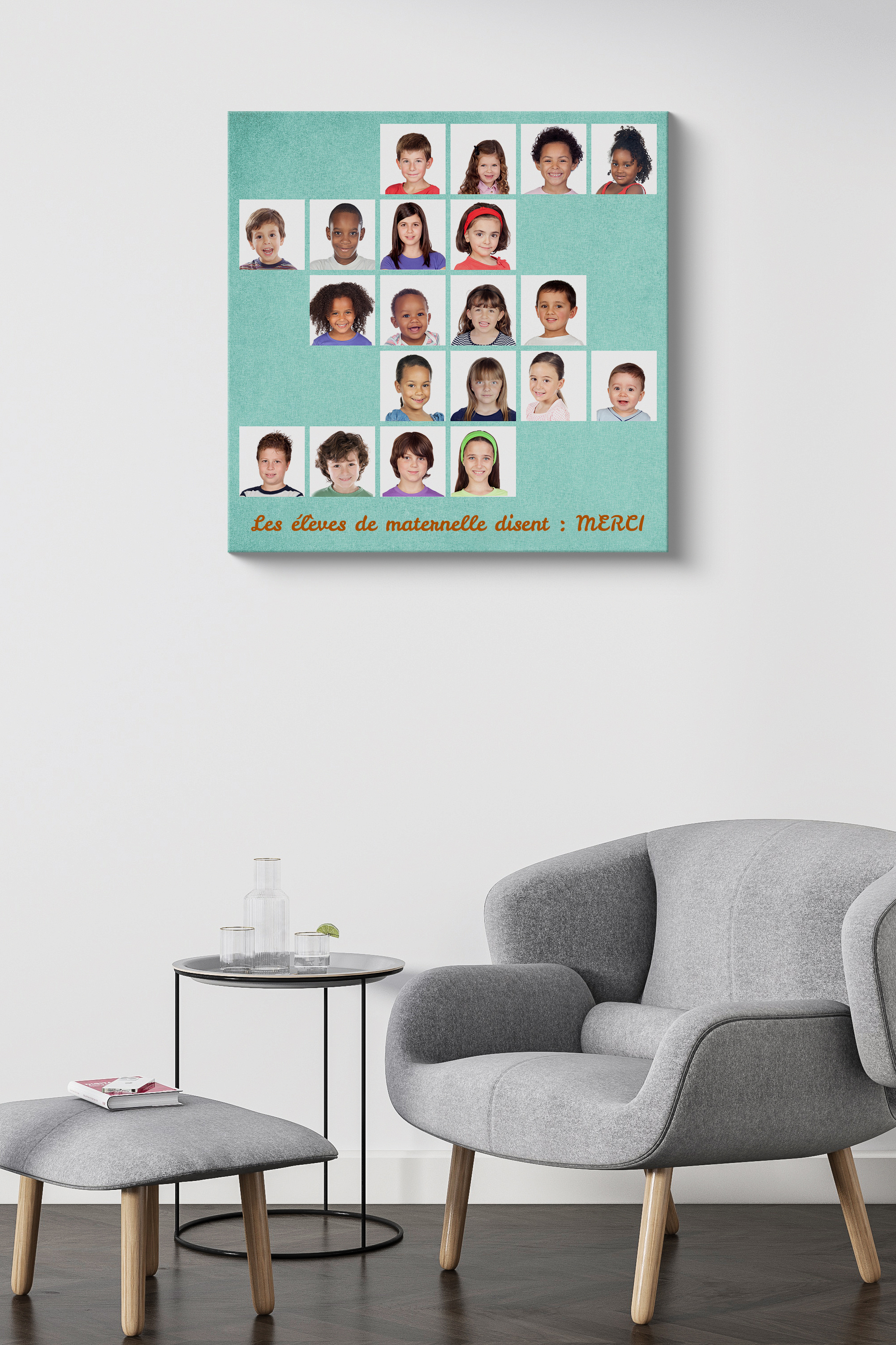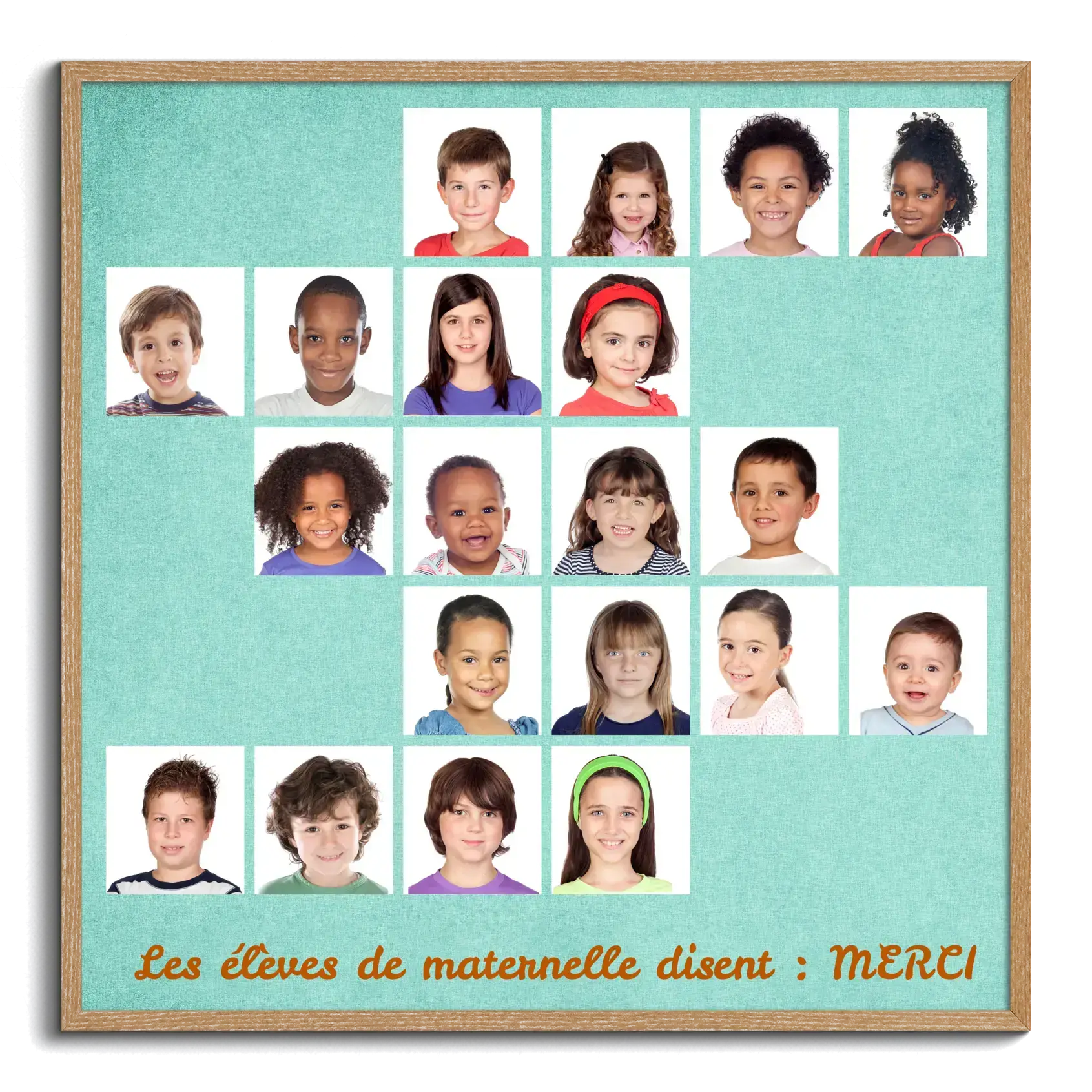 Créez une magnifique photo-collage personnalisée pour un cadeau d'adieu aux enfants de la maternelle ! Imaginez les enfants de votre groupe, disposés de manière ludique en cinq rangées de portraits sur un fond menthe. Un texte émouvant en dessous : Les grands disent : MERCI. C'est le cadeau idéal pour les enseignants, un bel affichage en classe ou un souvenir précieux pour les parents. Personnalisez chaque détail à votre goût, des photos au texte en passant par les couleurs de fond et la mise en page.