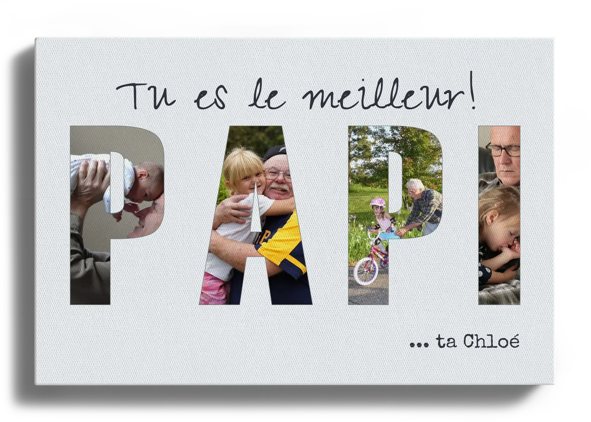 Parfait pour un anniversaire, la fête des grands‑pères, Noël, la fête des pères, une retraite ou simplement pour dire merci. Par exemple PAPI en trois photos avec un message personnel, prénoms et date, pour un souvenir tendre qui trouvera sa place au salon, au bureau ou dans une chambre d’enfant.