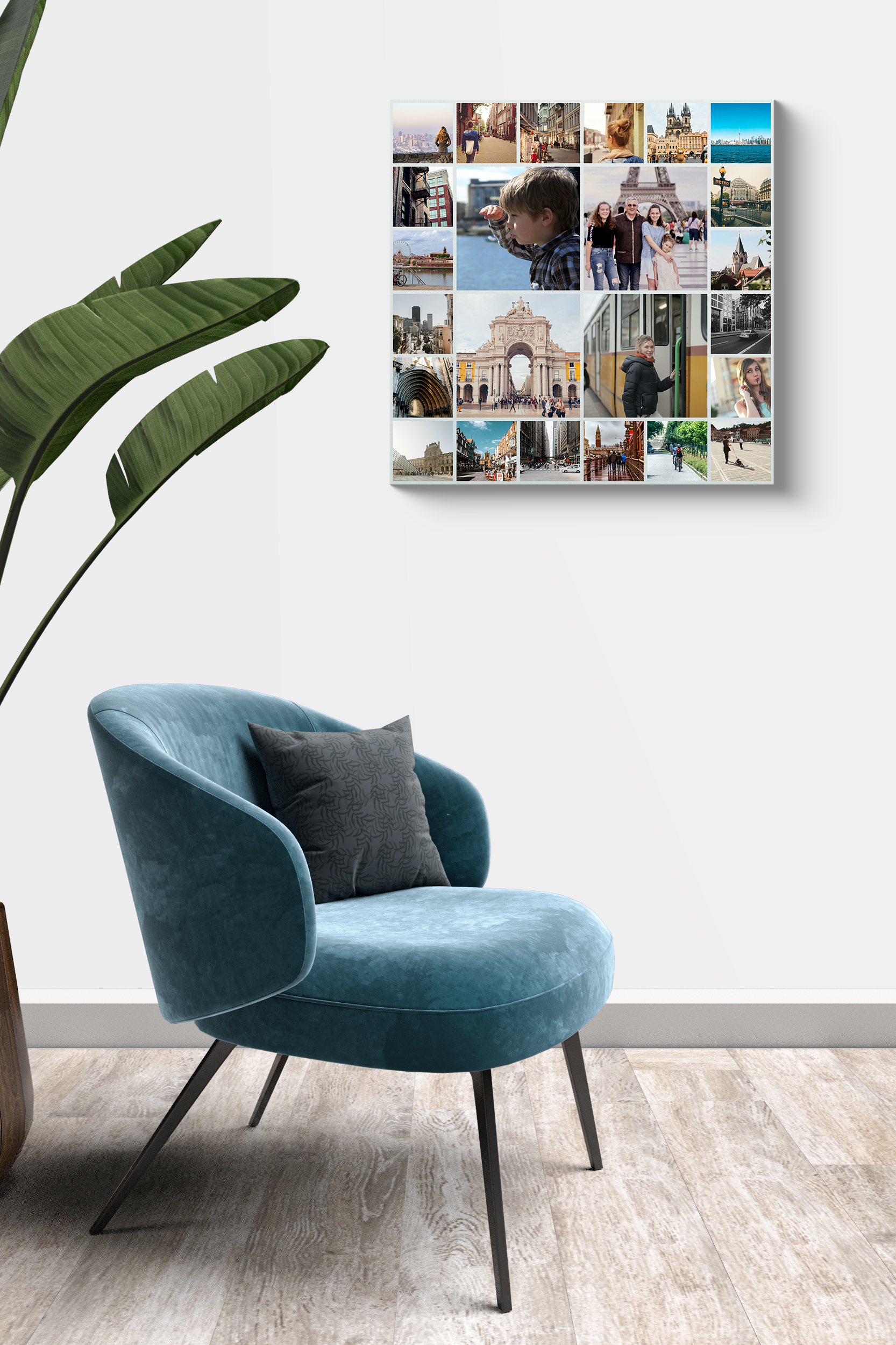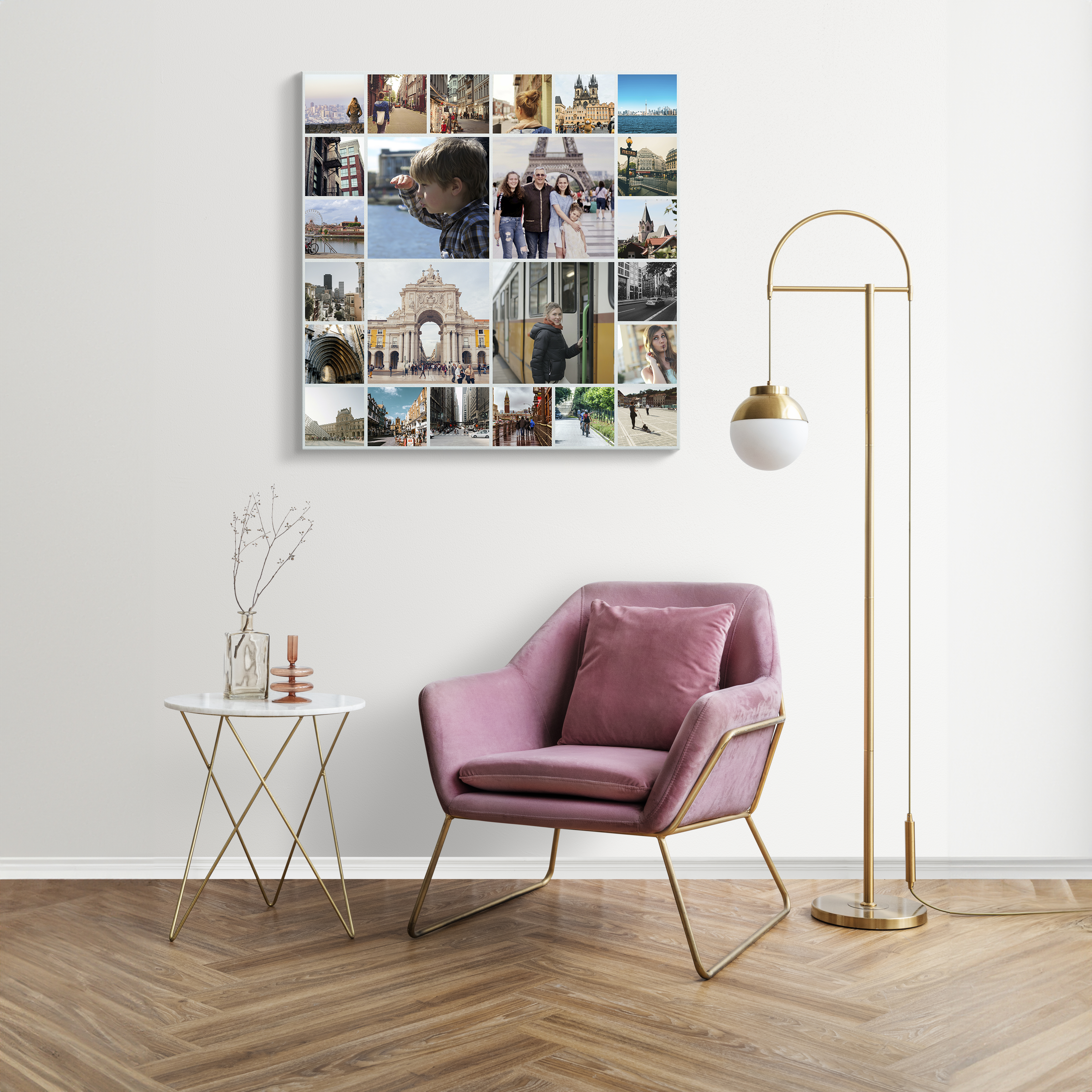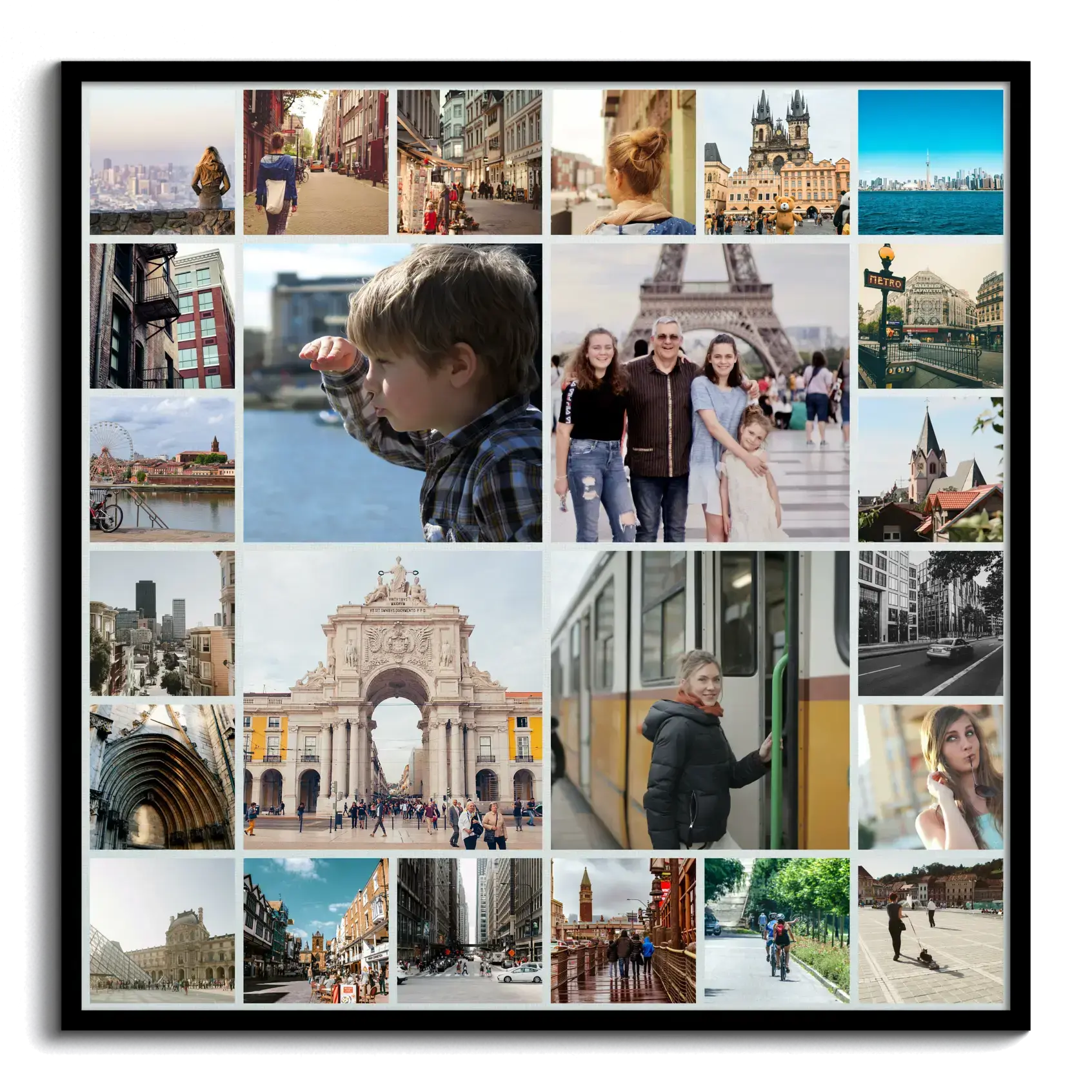 Collage carrée moderne sur Alu-Dibond, idéale pour les souvenirs de voyage et décoration intérieure.