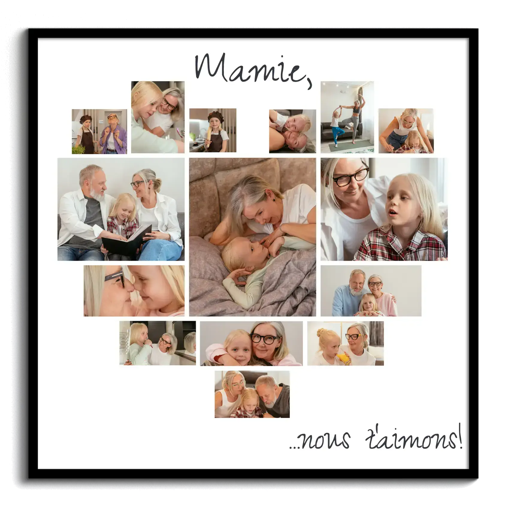 Créez votre propre chef-d'œuvre avec notre collage photo personnalisable en forme de cœur, imprimé en haute qualité sur fond blanc et en format carré. Cette création présente de nombreuses petites photos formant ensemble un cœur, avec une image centrale agrémentée d'un texte touchant : "Mamie, nous t'aimons". Parfait pour exprimer votre amour à des êtres chers comme votre grand-mère, ce design est idéal comme pièce décorative pour la maison ou en cadeau pour des anniversaires ou des jubilés. Chaque élément, des photos au texte en passant par la police et le fond, est entièrement modifiable selon vos préférences.