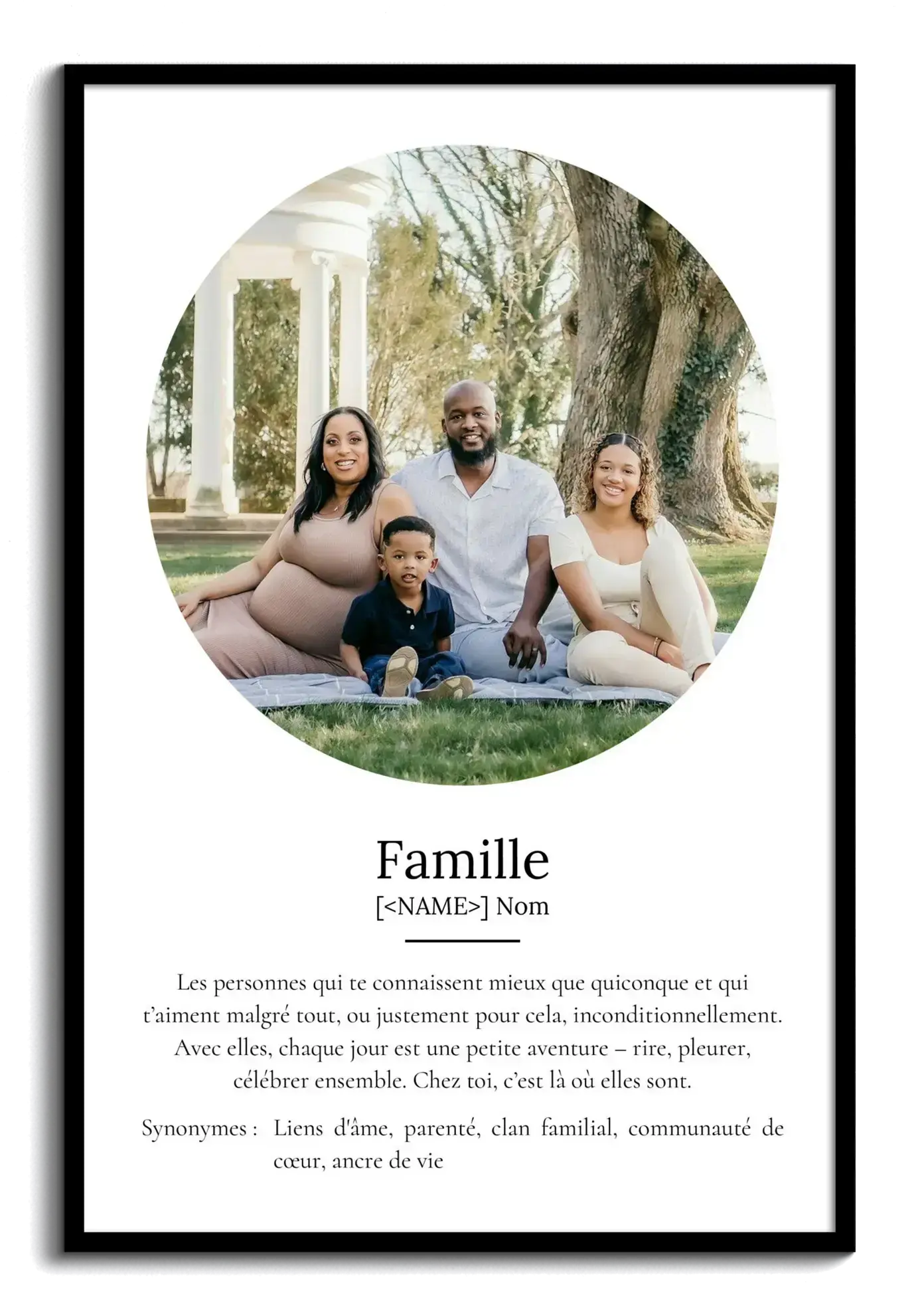 Créez votre propre poster définition de la famille avec nos outils en ligne intuitifs. Personnalisez ce cadeau unique en intégrant jusqu'à 9 de vos photos préférées. Ajoutez une touche personnelle avec le texte de définition : Les gens qui vous connaissent profondément et vous aiment inconditionnellement. Personnalisez chaque détail pour un résultat vraiment unique.