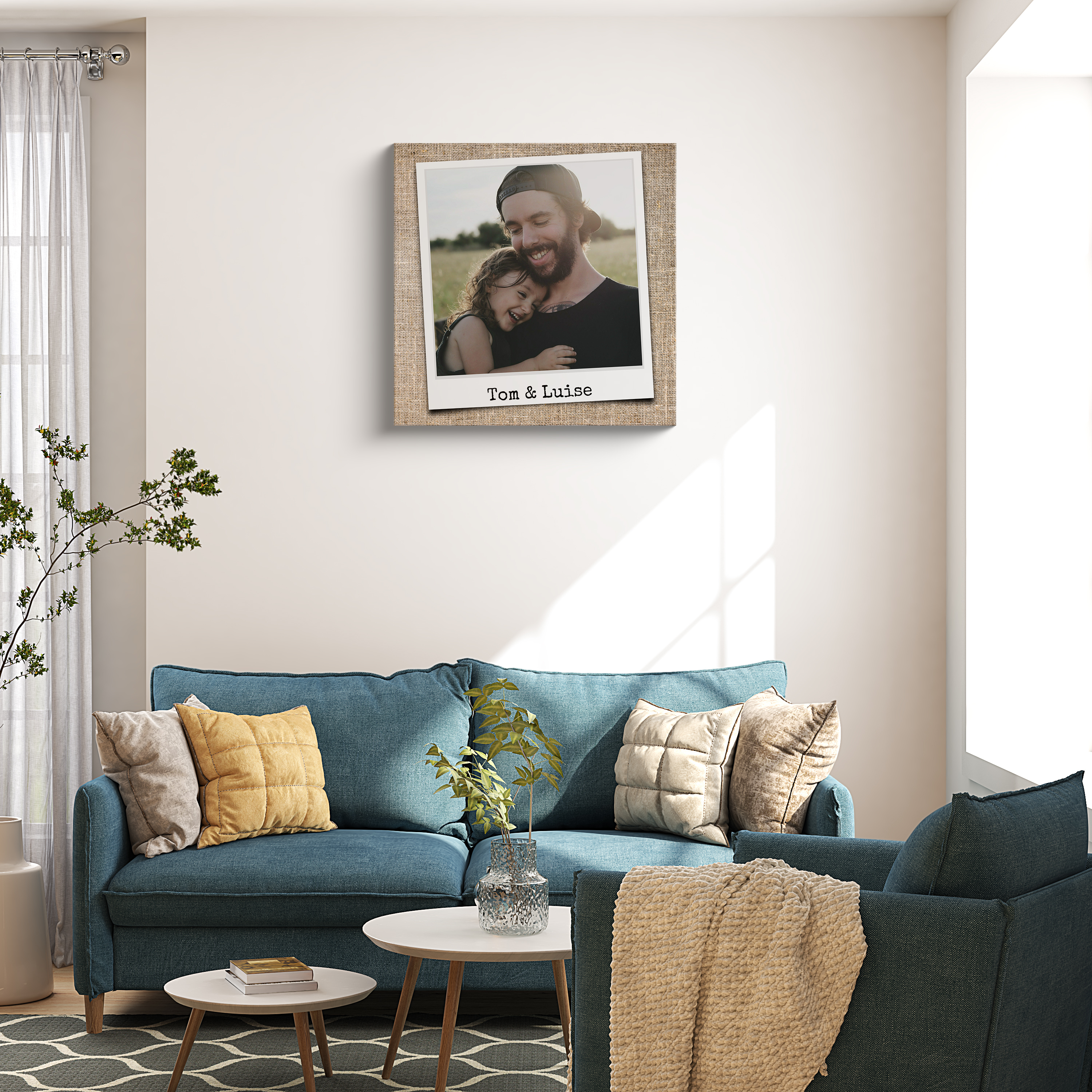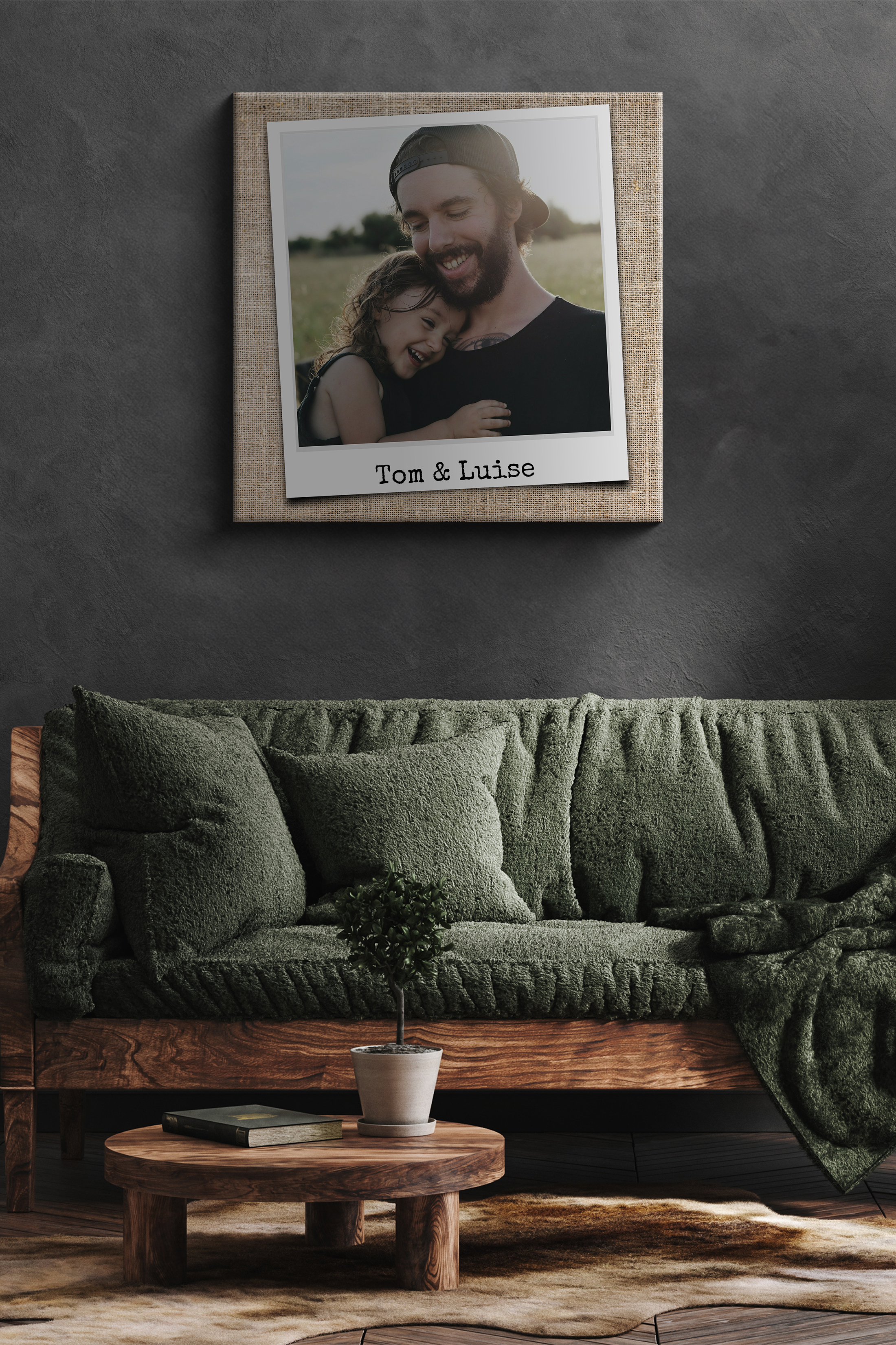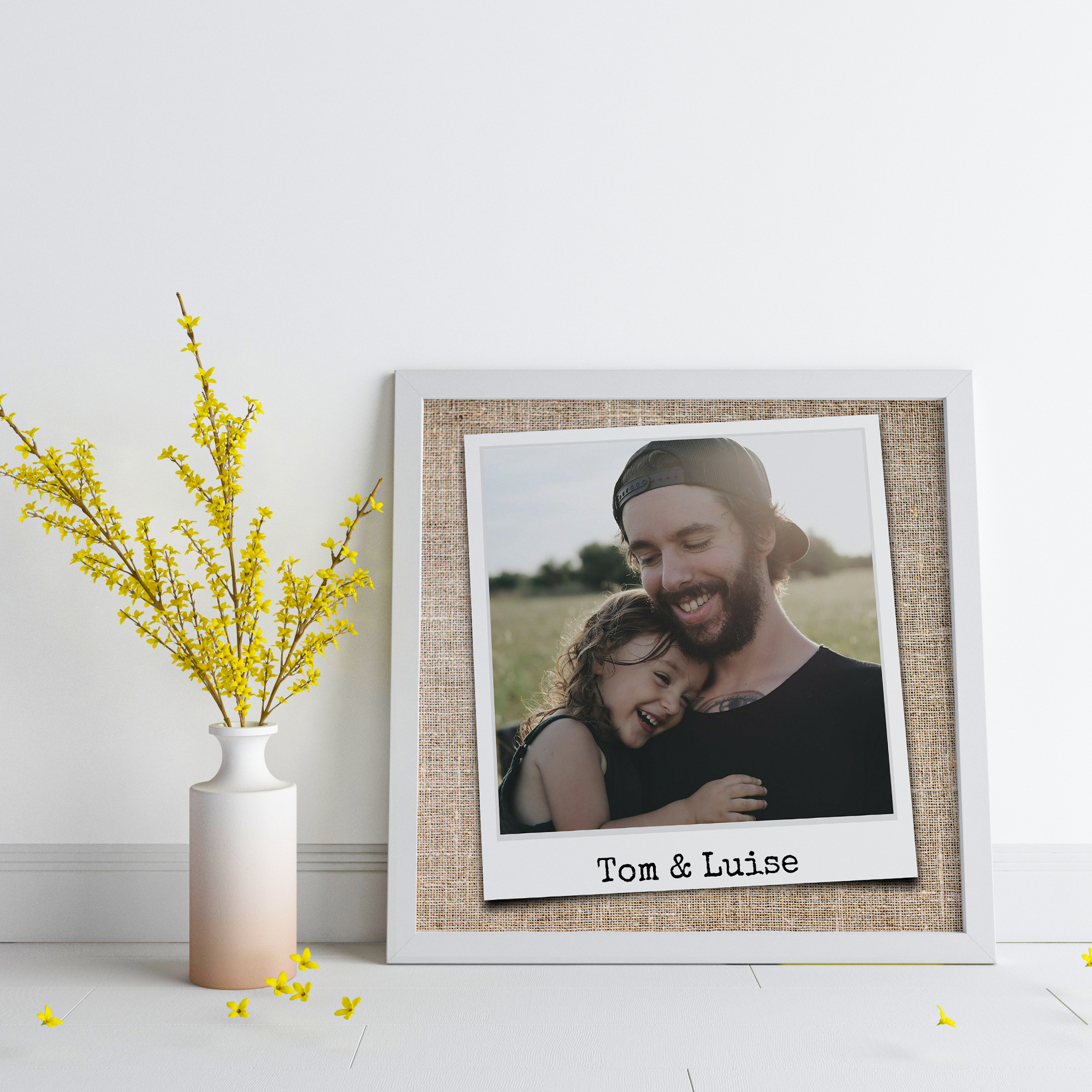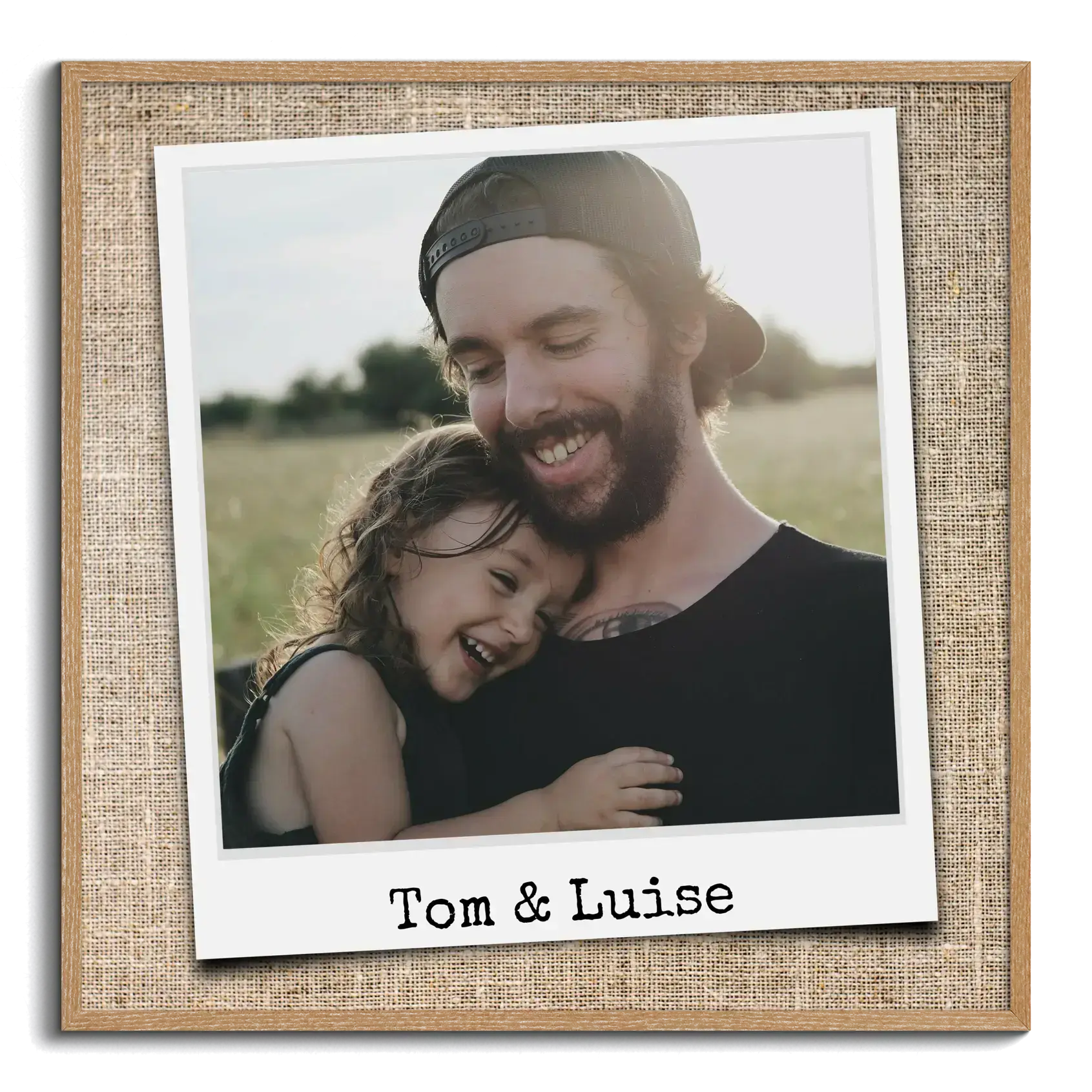 Créez une œuvre d'art unique avec votre propre collage photo personnalisé. Imaginez un magnifique poster photo au style Polaroid, capturant un moment précieux entre un père et sa fille, légèrement incliné, avec une légende personnalisée "Tom & Luise". Idéal pour les familles voulant préserver leurs souvenirs avec style ou offrir un cadeau émouvant aux parents ou enfants.