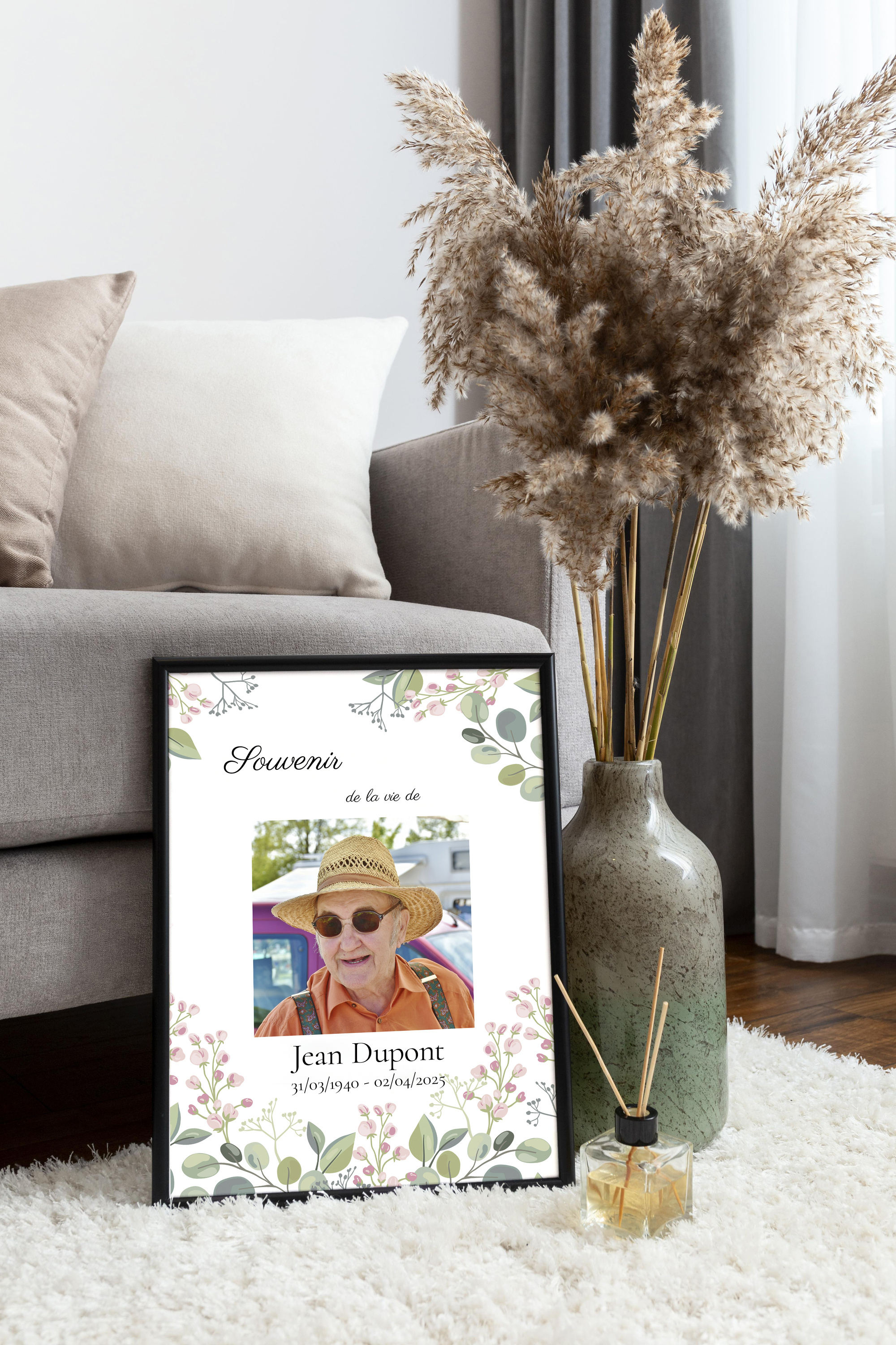 Découvrez notre magnifique collage photo personnalisable, un moyen touchant et élégant de se souvenir de vos proches. Que ce soit pour un hommage lors d'une cérémonie ou comme un chaleureux souvenir chez soi, créez une image unique d'une personne chère avec un décor floral subtil et des textes personnalisés tels que le nom, les dates et un tendre message.