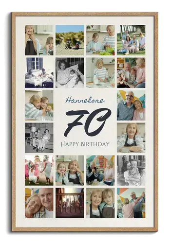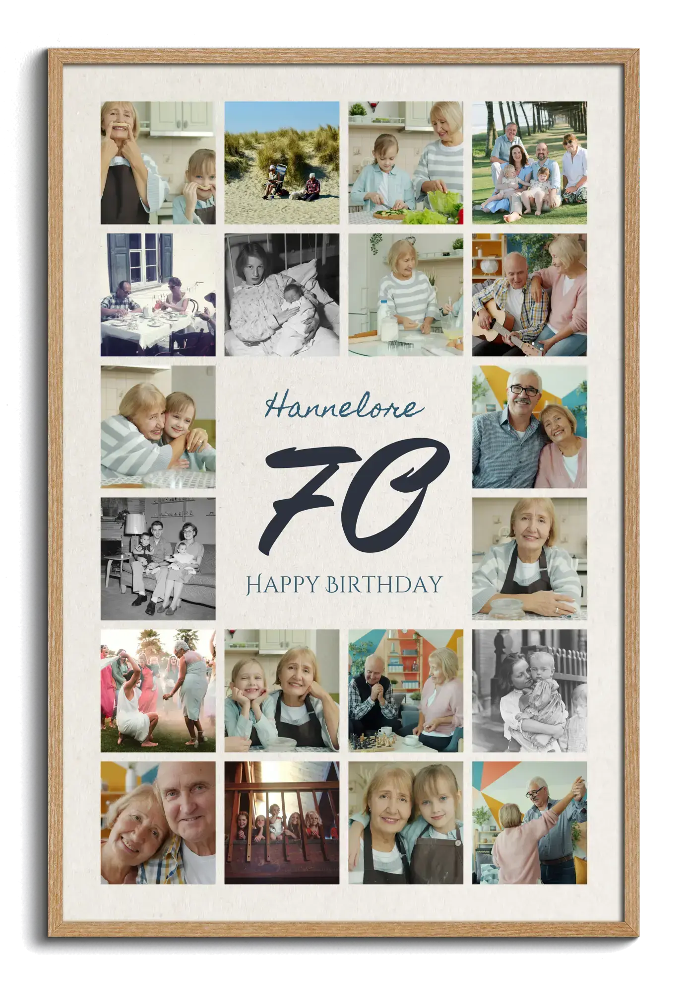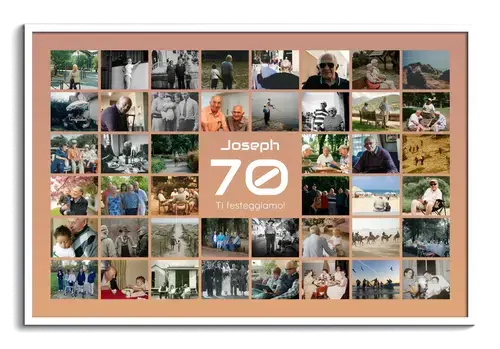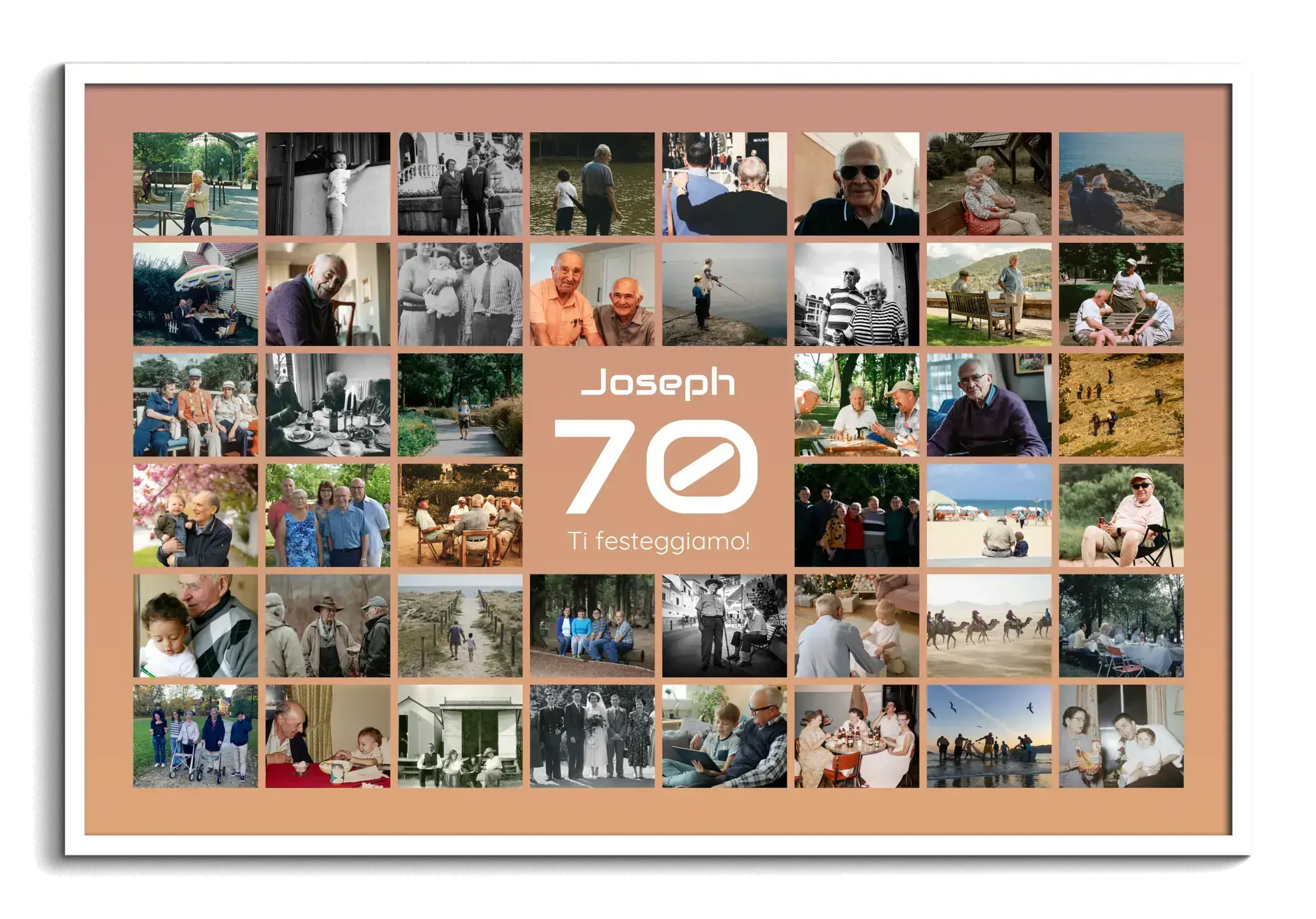 Collage 70 personalizzato: nome, dedica, 20–80 foto; idea regalo per 70° compleanno o anniversario.