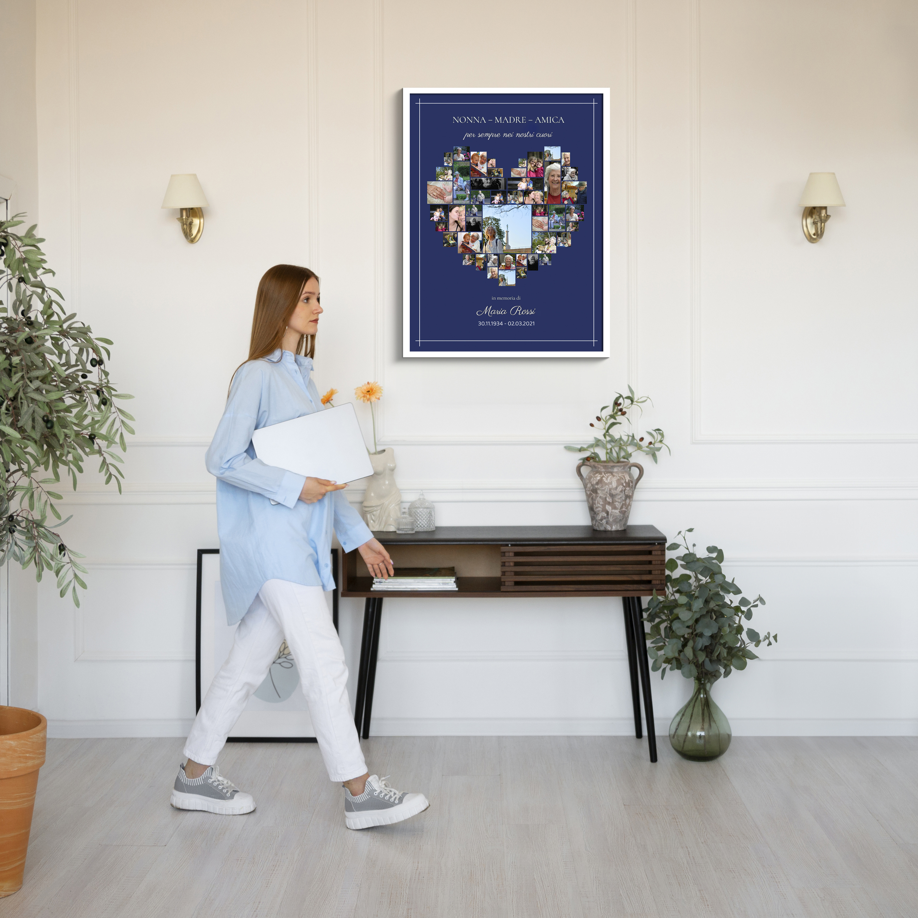 Crea la tua fotocollage personale e trasformala in un emozionante ricordo. Con il nostro prodotto, puoi realizzare una raffinata collage di lutto in forma di cuore su una pregiata tela premium. Le tue foto personali si uniranno a formare un cuore, con un'immagine centrale in risalto. Il testo Oma - Mutter - Freundin e in ricordo di, insieme al nome Rosemarie Schulz e le date di nascita e morte, completeranno questo tributo commovente. Il design semplice, con uno sfondo blu scuro e linee bianche che incorniciano il tutto, rende la collage perfetta per famiglie e amici che desiderano un ricordo personale.