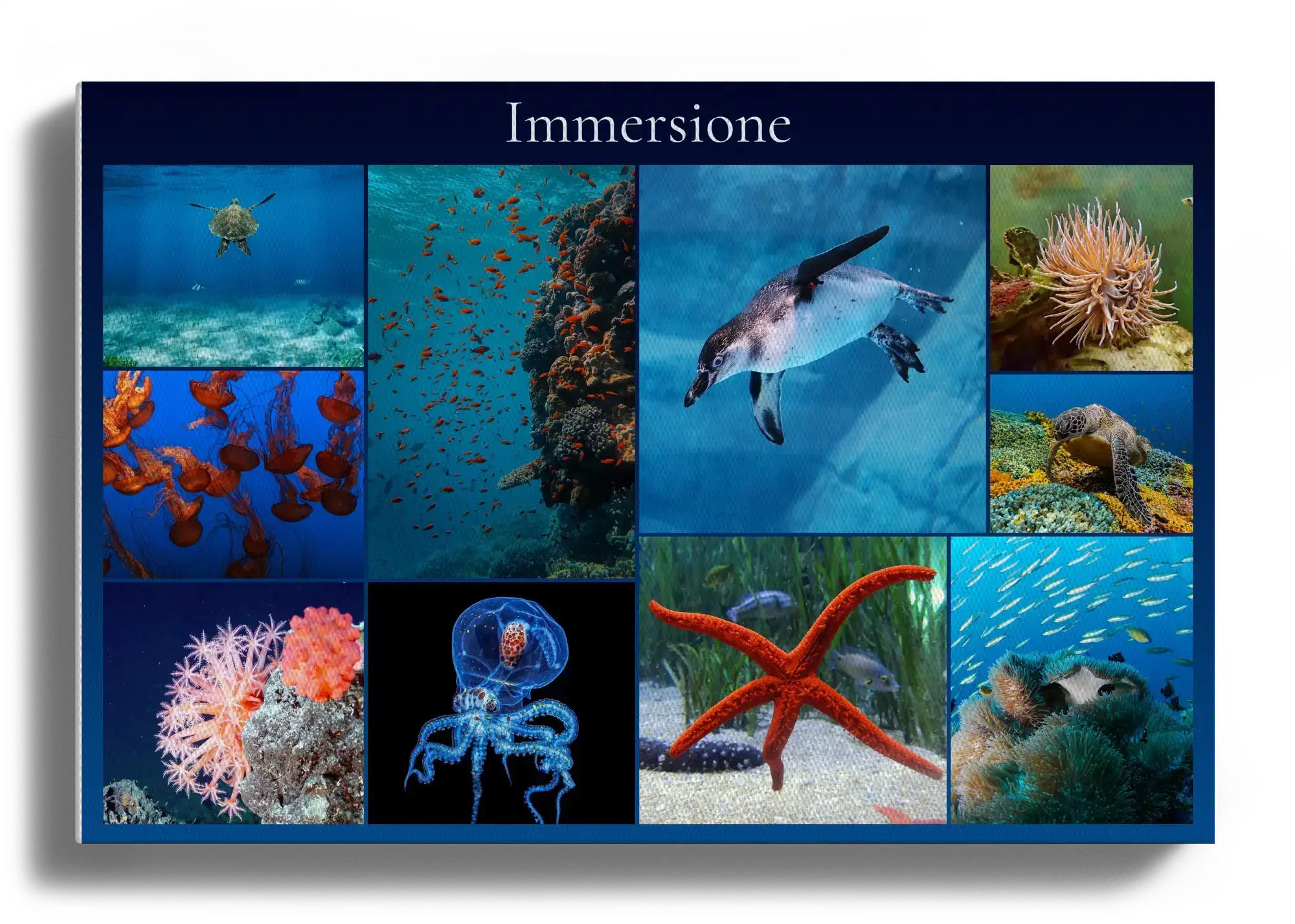 Crea ora la tua stampa personalizzata a tema Natura: Animali in libertà. In questo esempio puoi valorizzare la vita subacquea in un collage: pesci e coralli variopinti, squali in controluce, pinguini agili, tartarughe eleganti, meduse e delfini curiosi, momenti di immersione e snorkeling, dal blu profondo ai riflessi di superficie, con resa di stampa premium.
