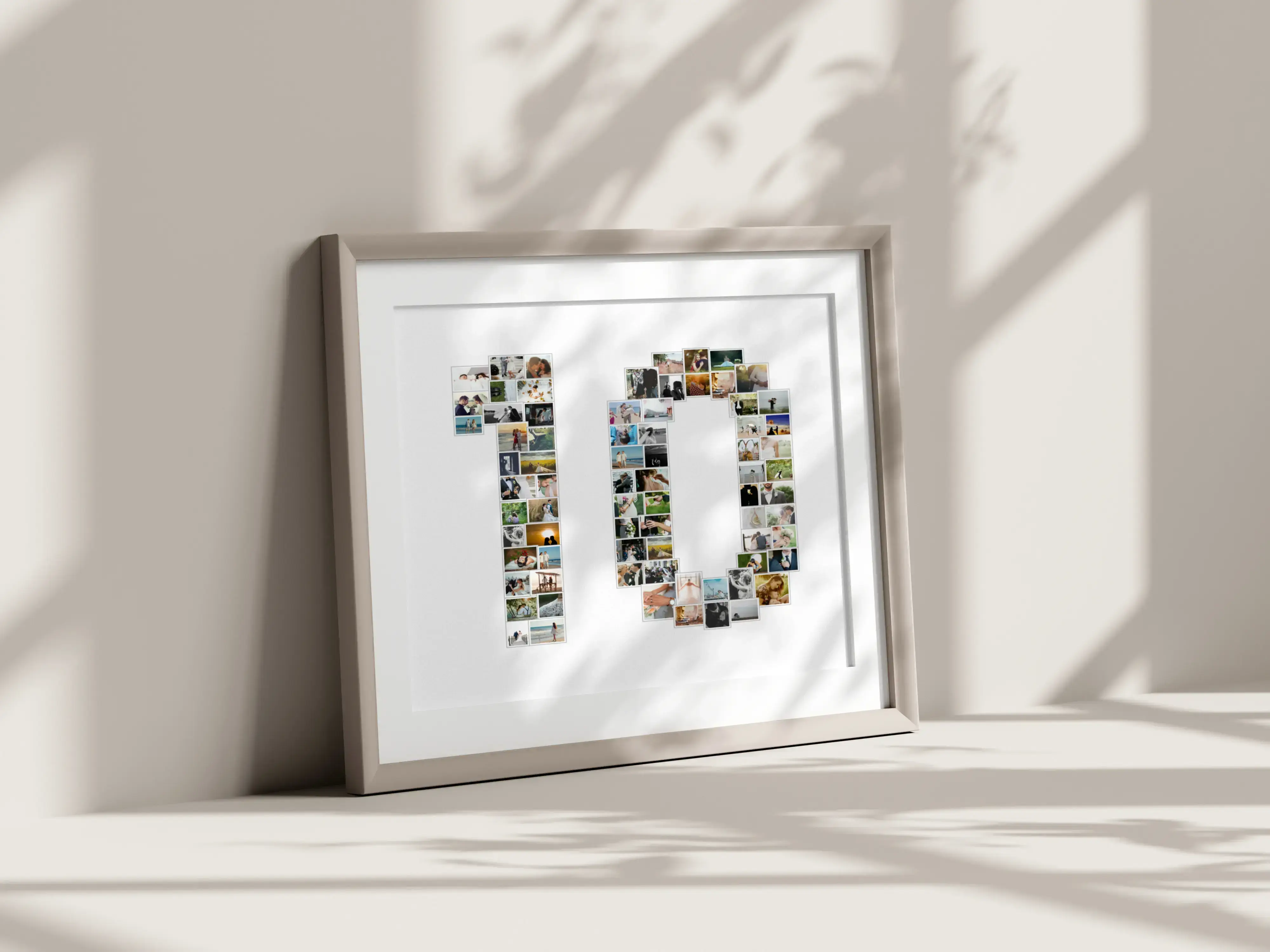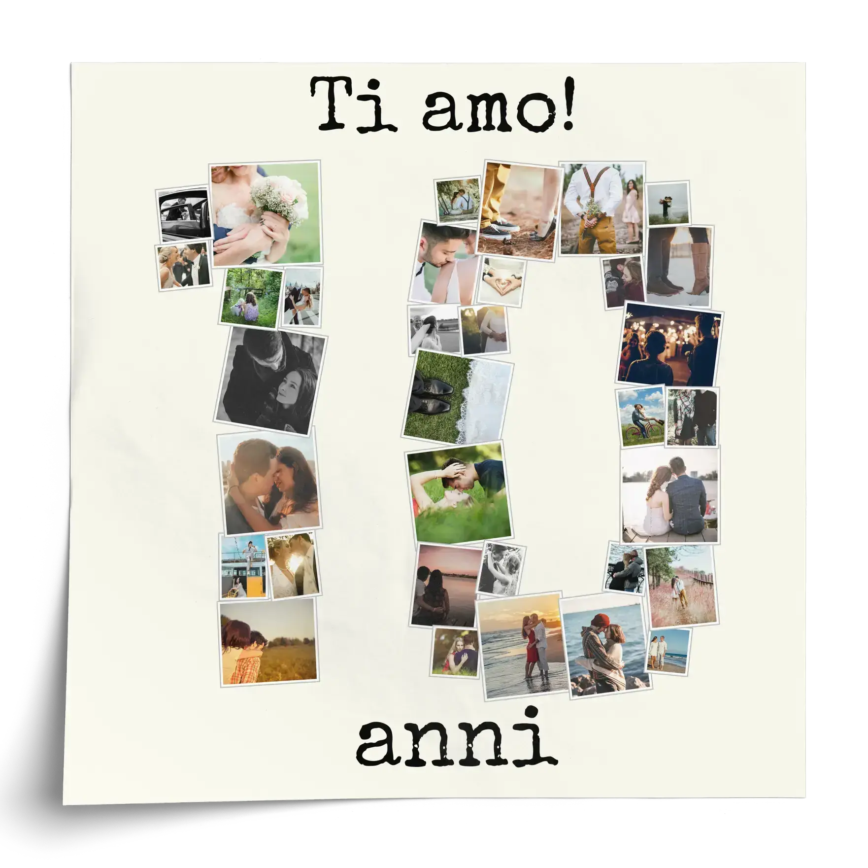 Crea una splendida fotocollage personalizzata per te o da regalare. Immagina di celebrare il decimo anniversario di matrimonio o il decimo anno di attività della tua azienda con una fantastica fotocollage a forma di numero 10. Puoi selezionare fino a 100 foto per comporre la tua storia e far rivivere quei momenti speciali in maniera unica.