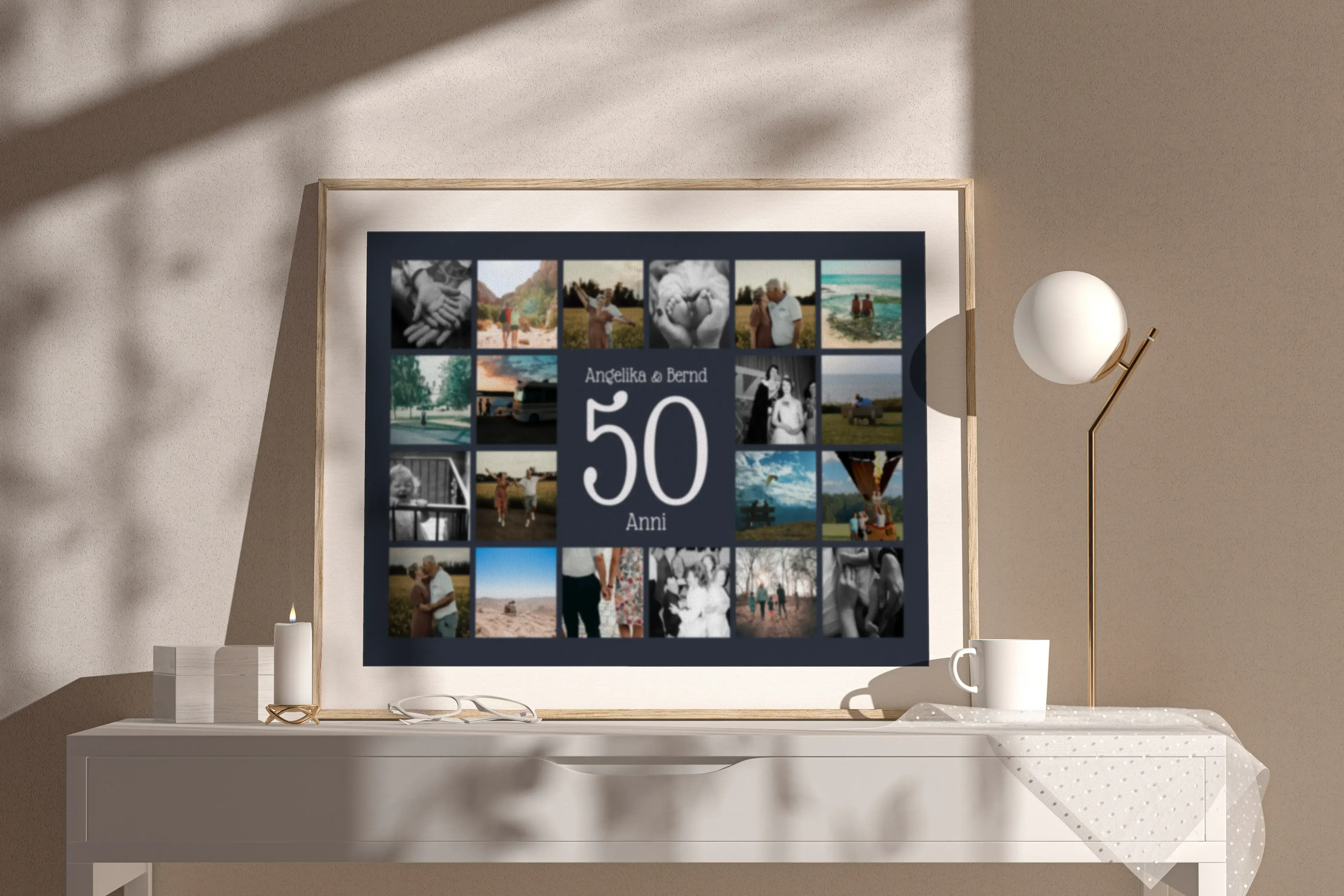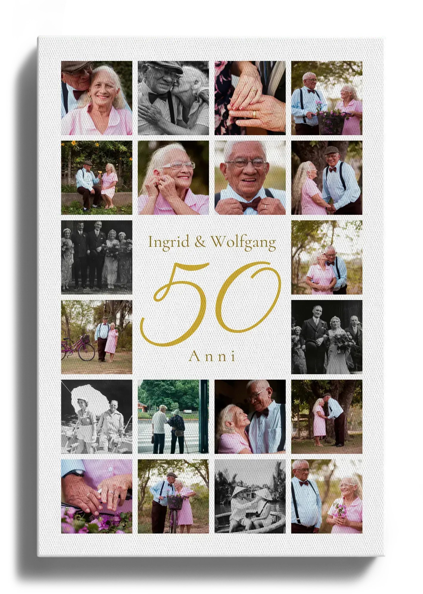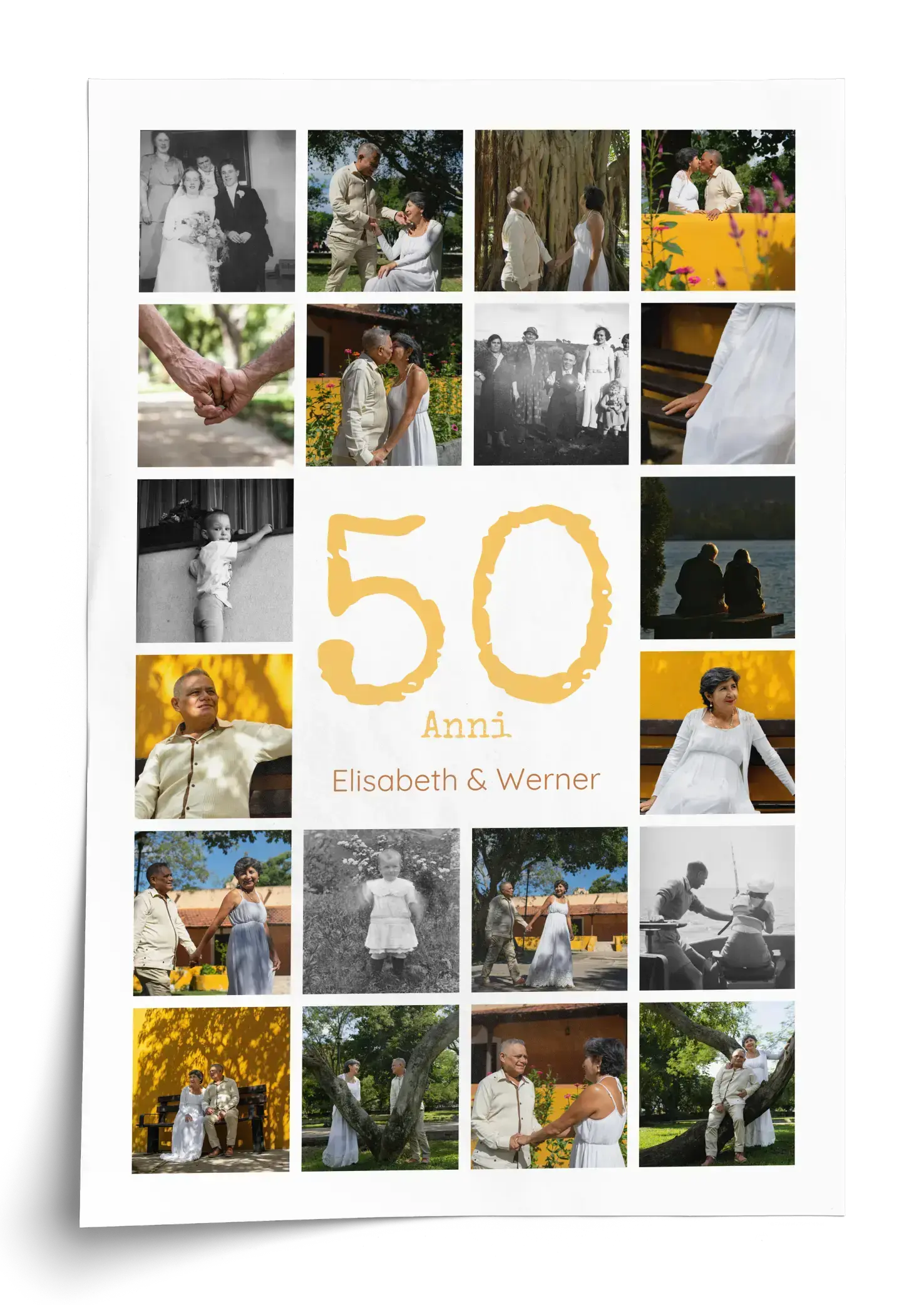Collage per le nozze d’oro: grande numero centrale, nomi, testo e 20–80 foto in griglia, su misura.