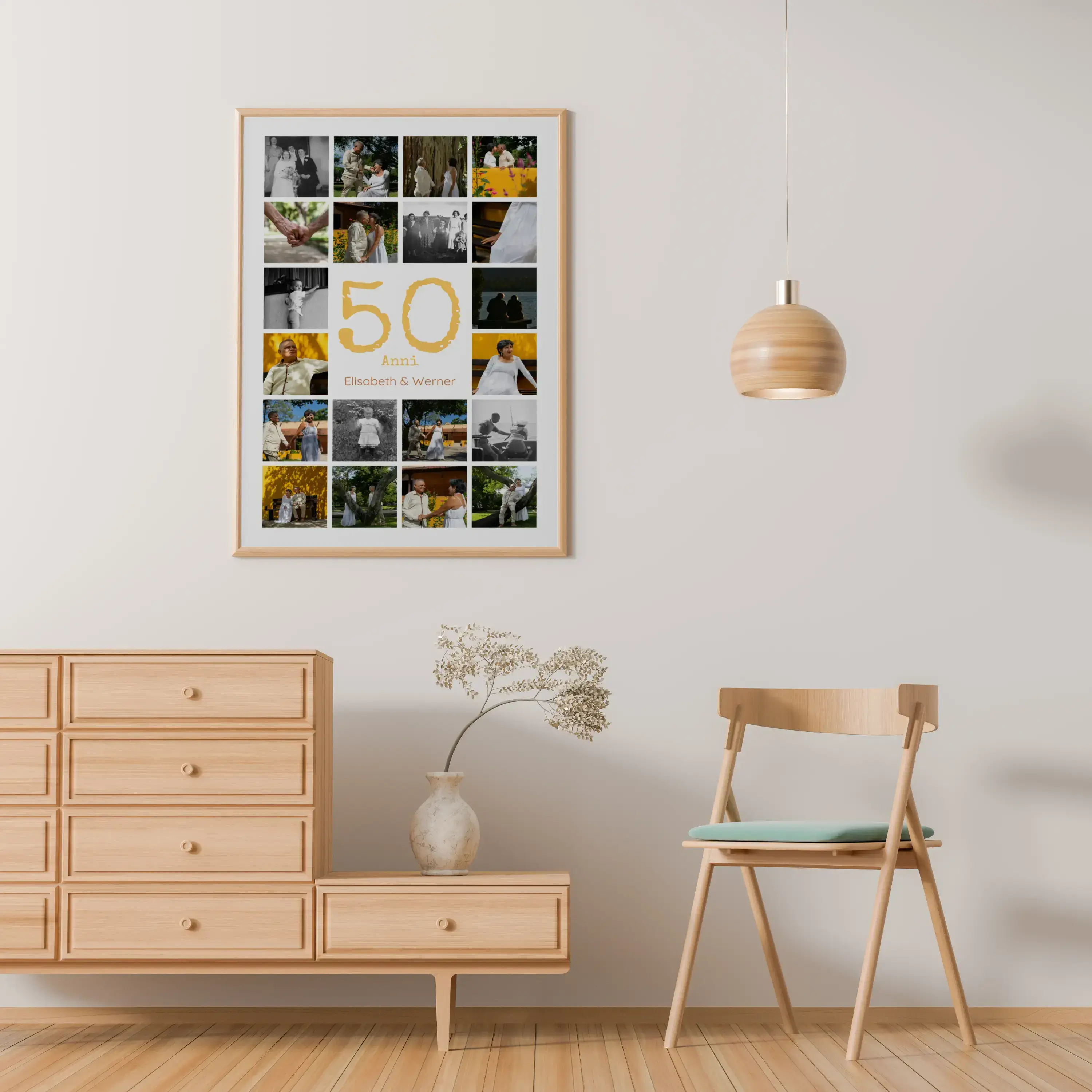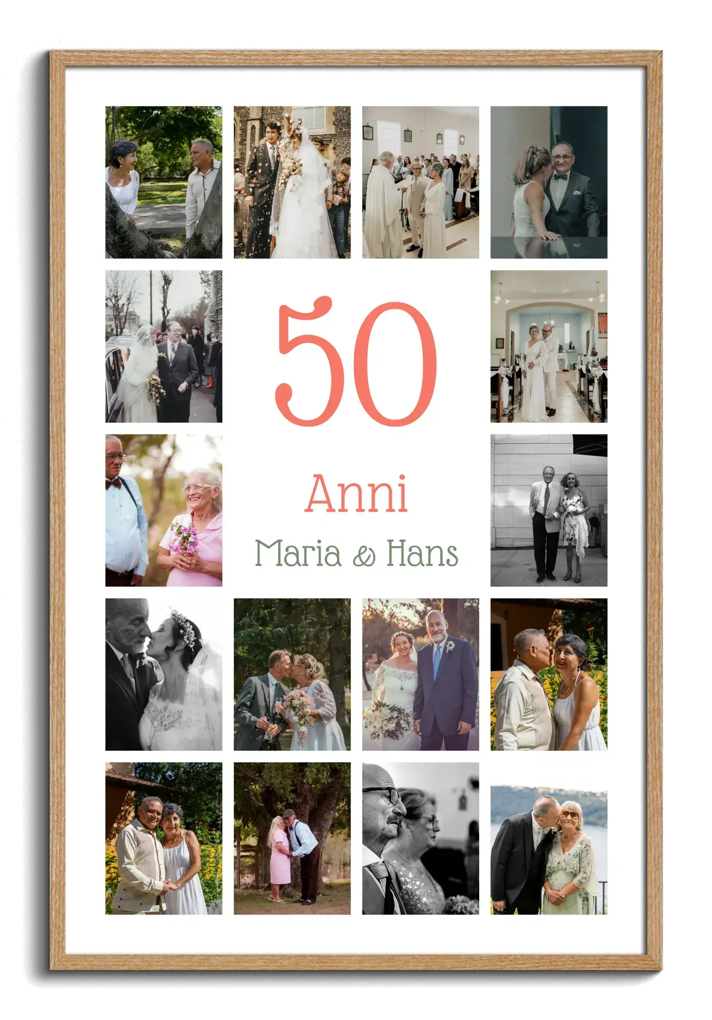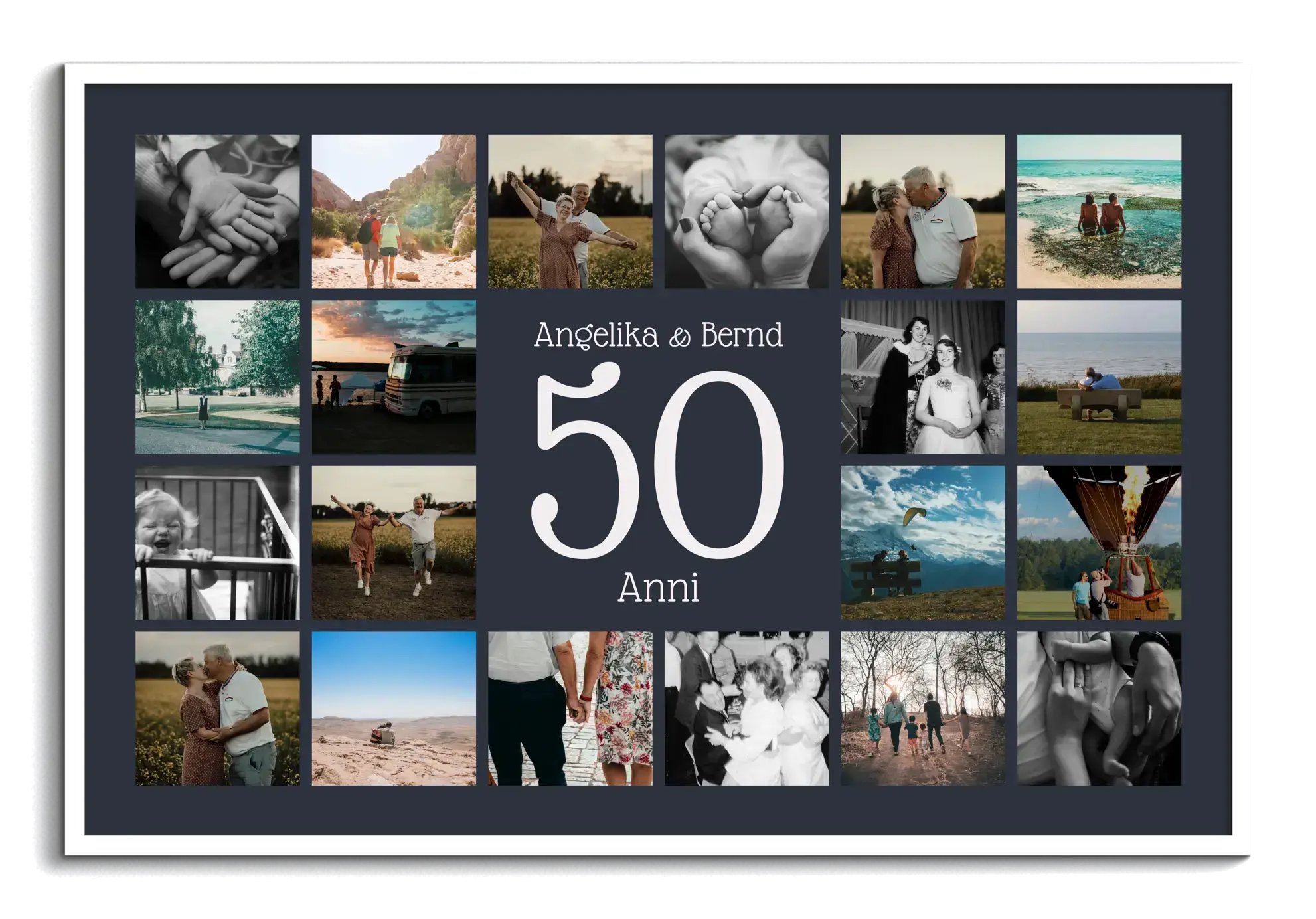 Collage per le nozze d’oro: grande numero centrale, nomi, testo e 20–80 foto in griglia, su misura.