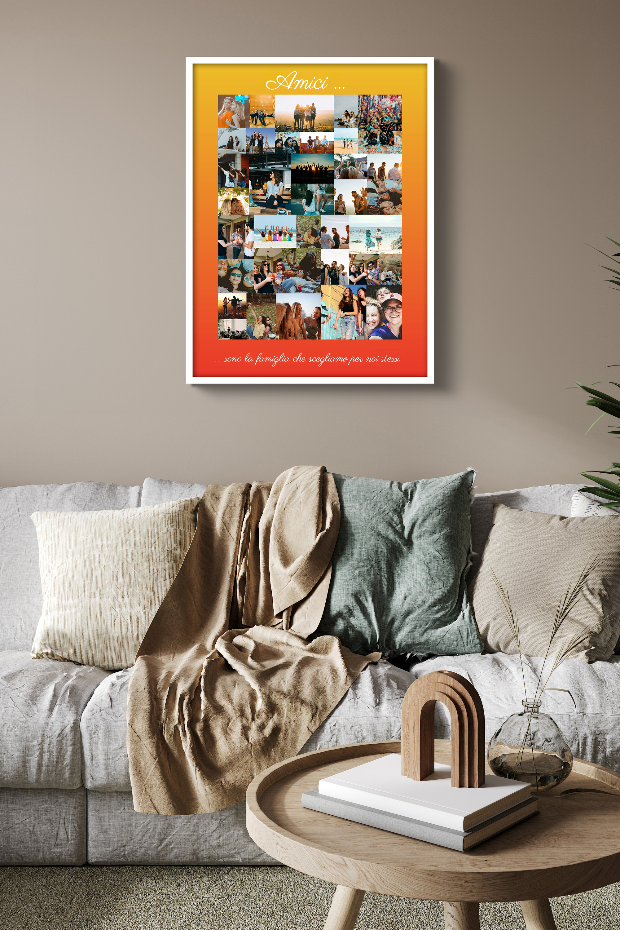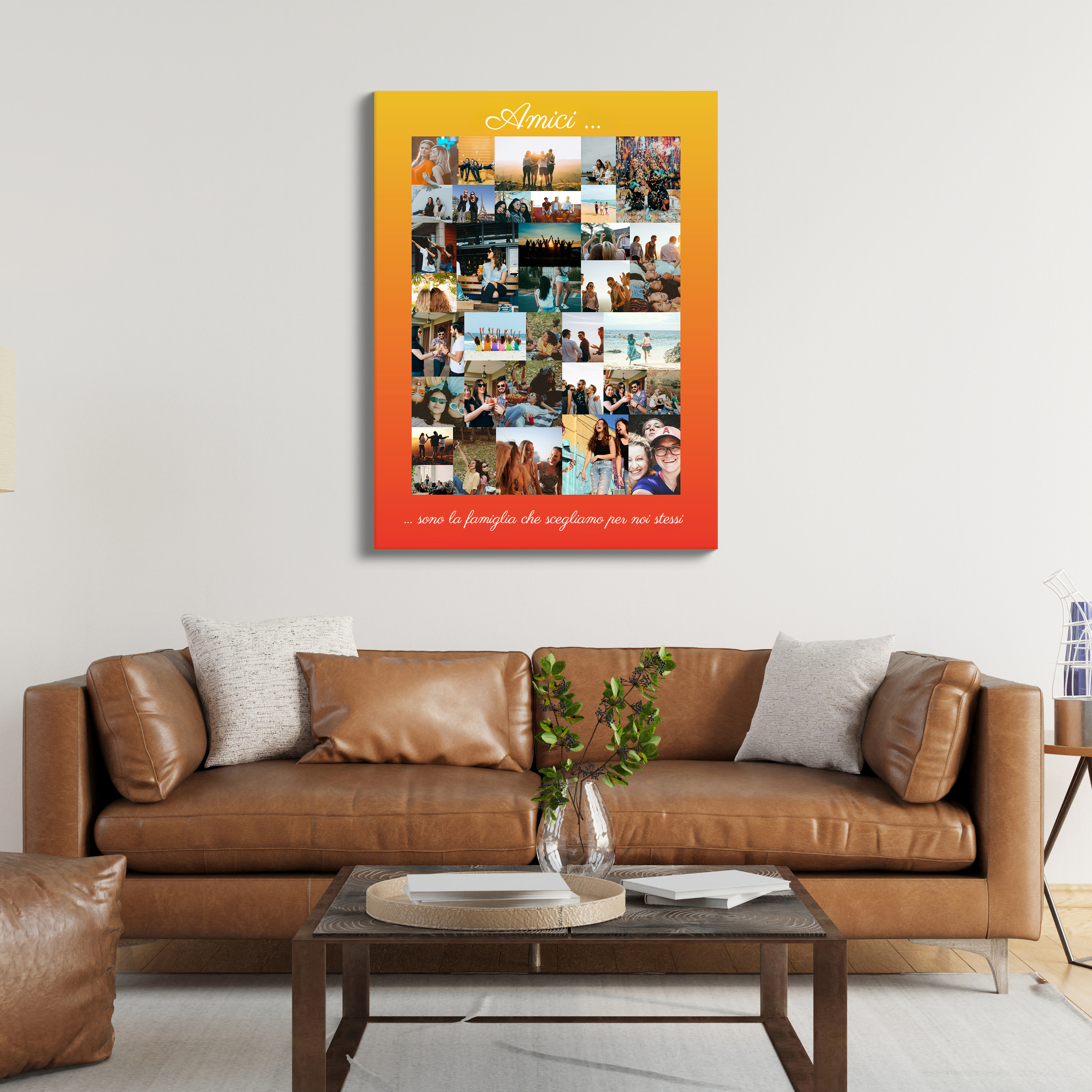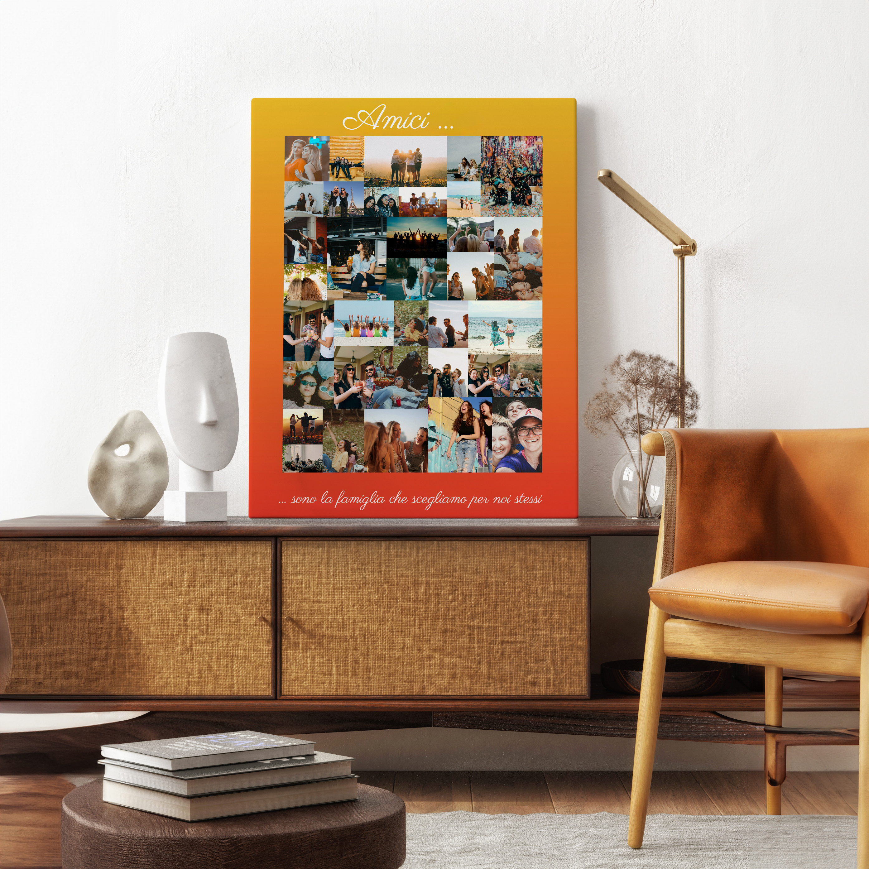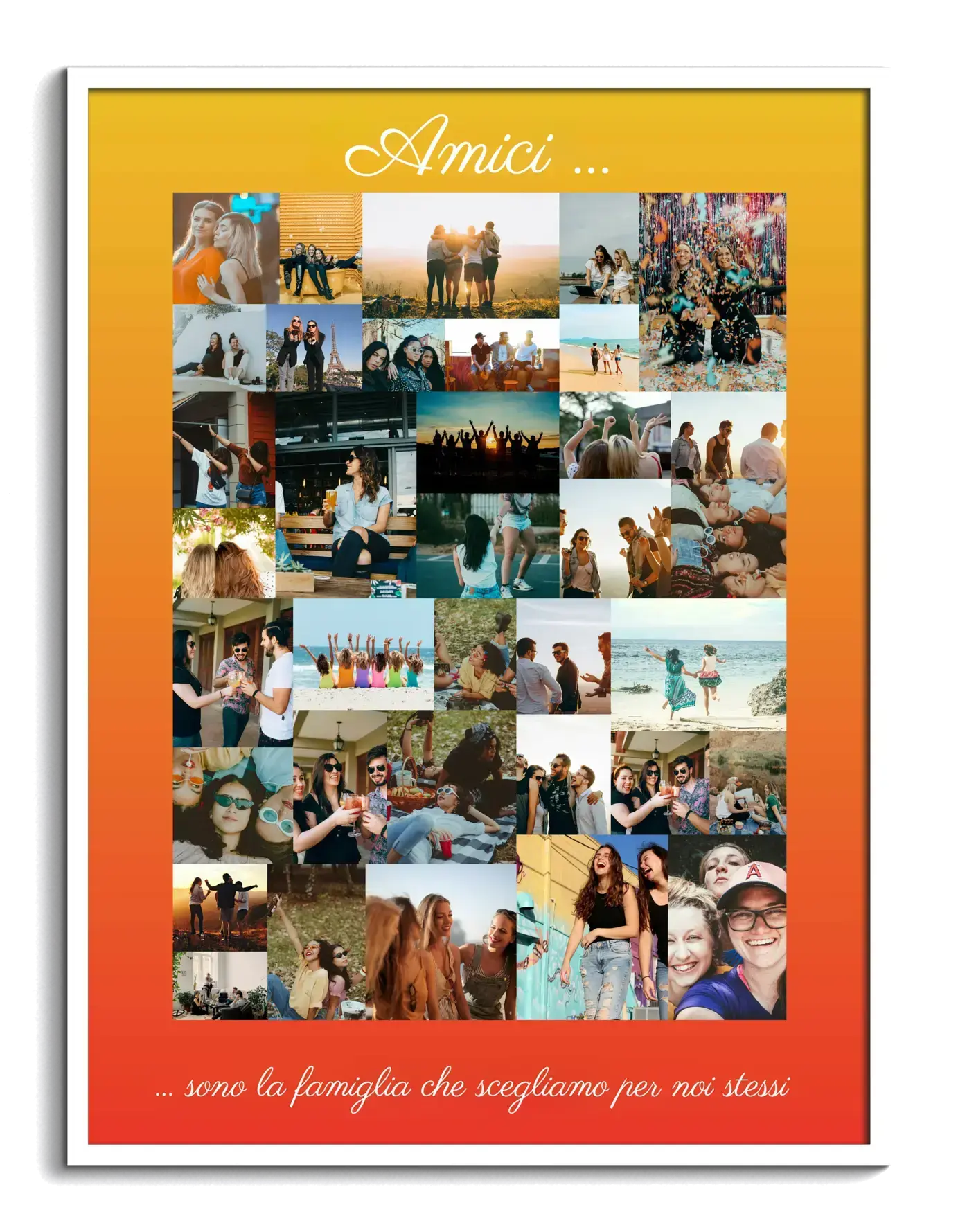 Collage amici personalizzabile: ricordi dinamici e creativi su sfondo giallo-arancio.