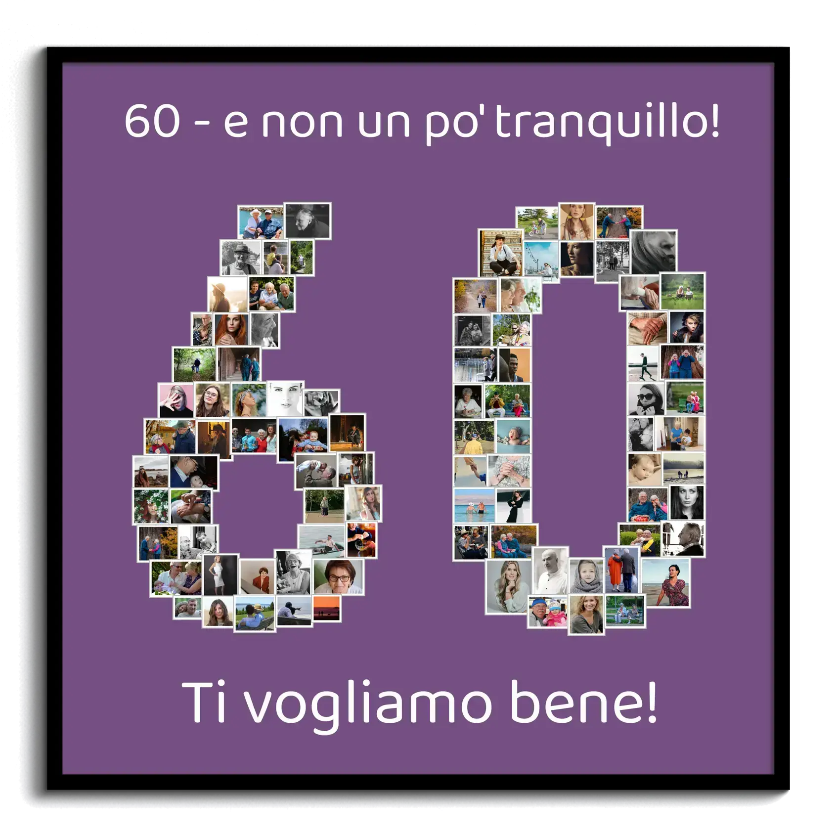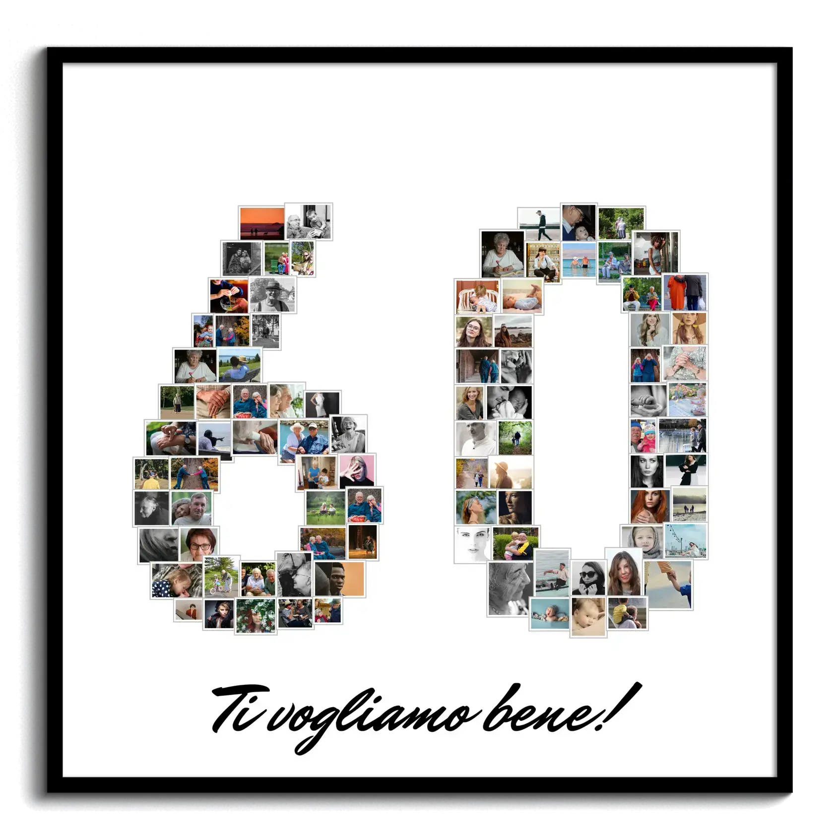 Scopri il modo perfetto per celebrare il sessantesimo compleanno di qualcuno speciale con una fotocollage personalizzabile. La nostra soluzione consente di creare un'immagine unica, in cui il numero '60' è composto da molteplici foto significative. Puoi usare da 1 a 100 immagini in base alla tua selezione, rendendo questo regalo ideale per compleanni e pensionamenti.