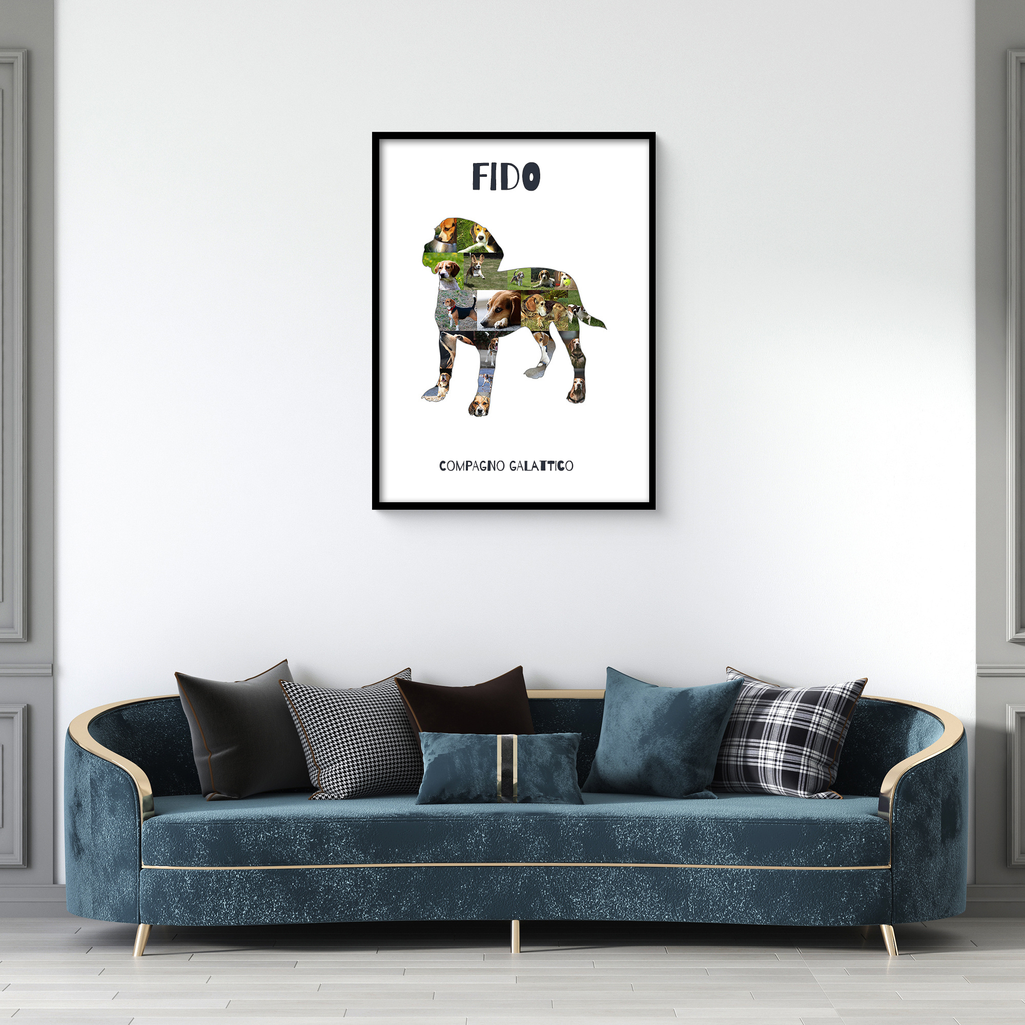 Scatena la tua creatività con la nostra fotocollage personalizzata per Beagle! Progetta una silhouette unica del tuo adorato amico a quattro zampe utilizzando 15-20 delle tue foto preferite. Aggiungi un tocco personale con un testo, come ad esempio "galattico compagno fedele". Perfetto per esprimere l'amore per il tuo Beagle o per sorprendere un amico amante dei cani.