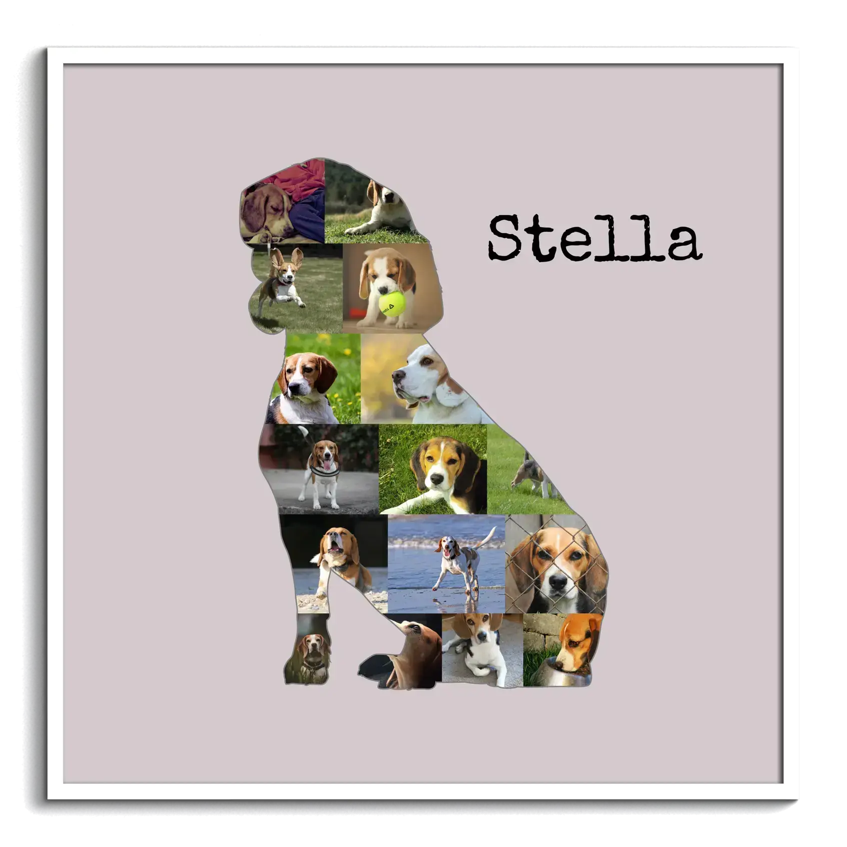 Collage canina personalizzata con foto e testo unico per amanti dei Beagle.