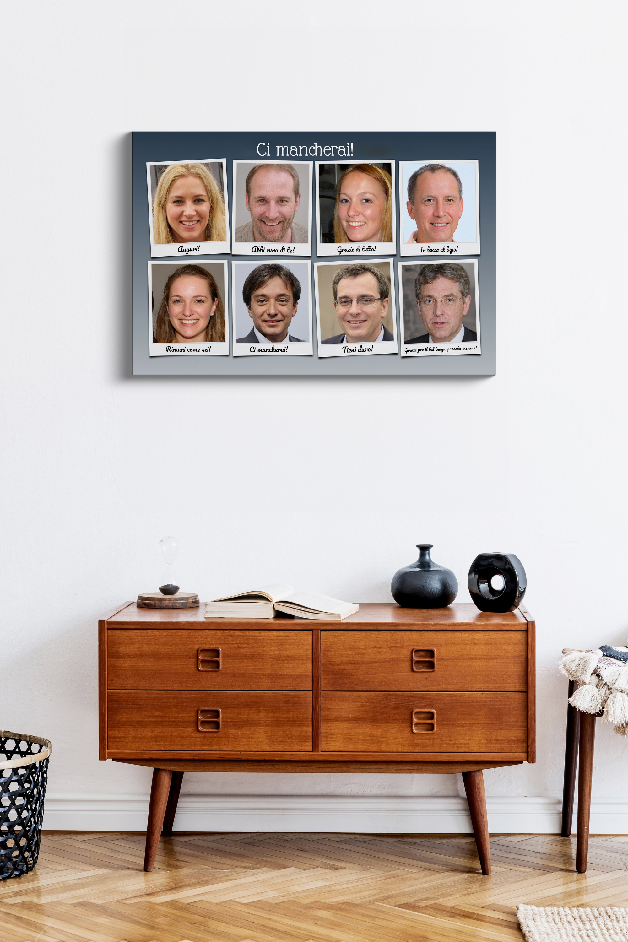 Collage Polaroid con foto e frasi d'addio: "Ci mancherai". Personalizzabile al 100%.