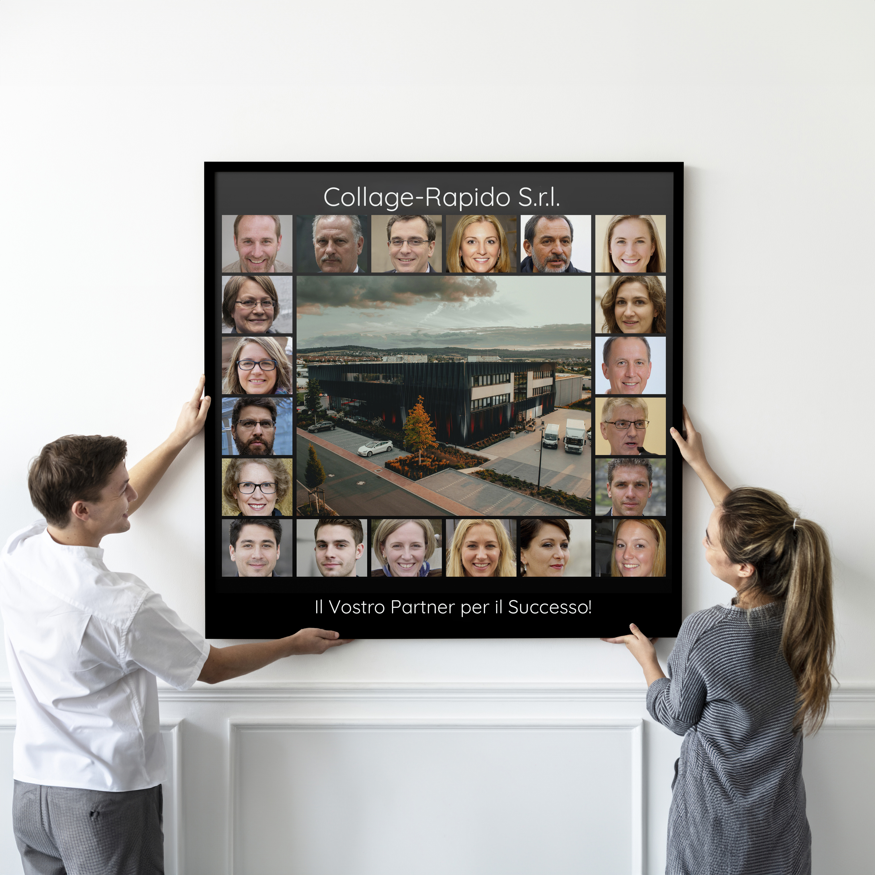 Scopri la bellezza di una fotocollage personalizzata su misura per la tua azienda! Immagina un elegante collage quadrato su acrilico, adornato con le foto dei tuoi collaboratori. Al centro, un'immagine prominente e sopra il nome della tua azienda. Sotto, un motto come 'Il tuo partner per il successo'. È la soluzione perfetta per esaltare il lavoro di squadra e i successi comuni, o per accogliere clienti e fornitori con stile.