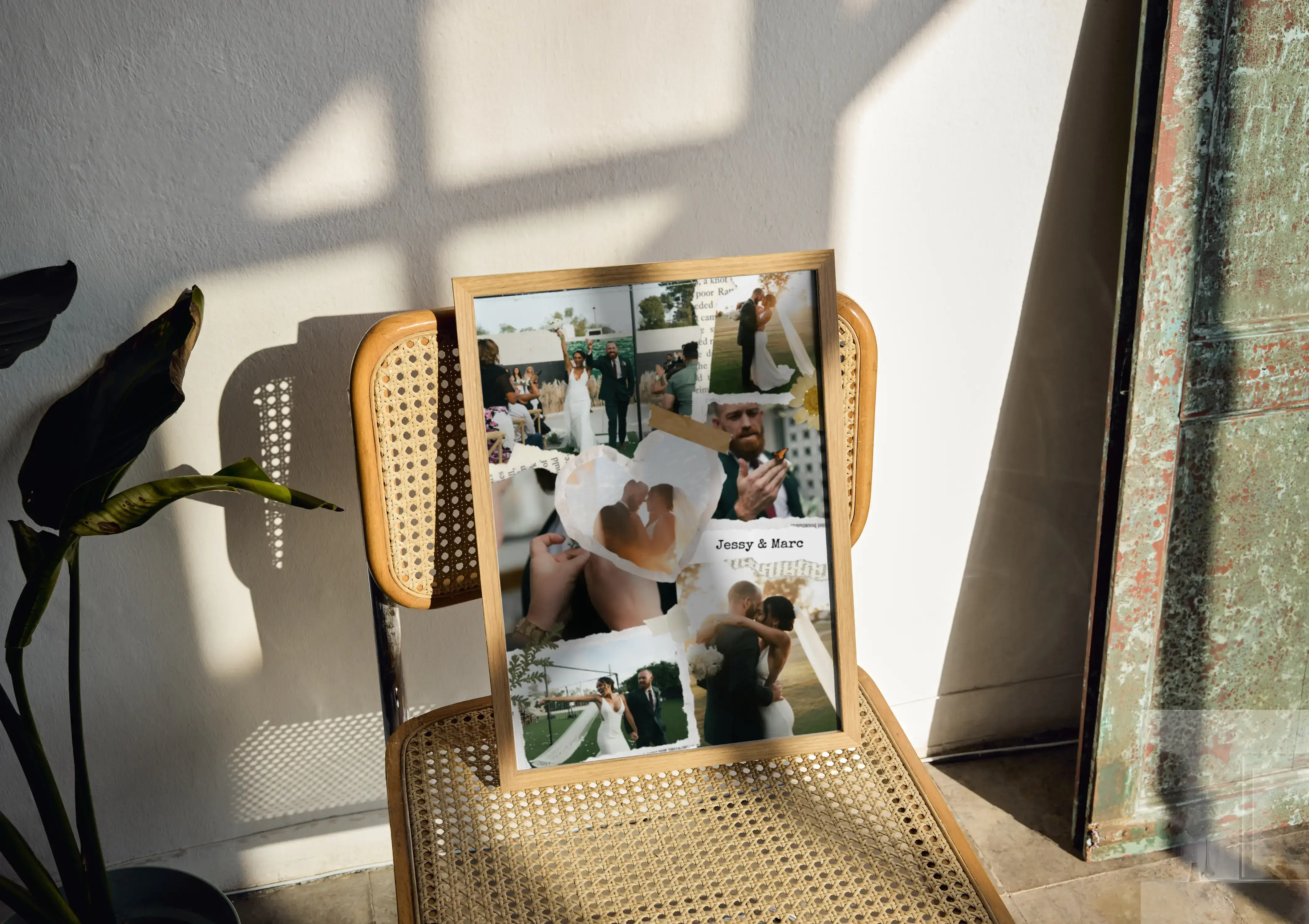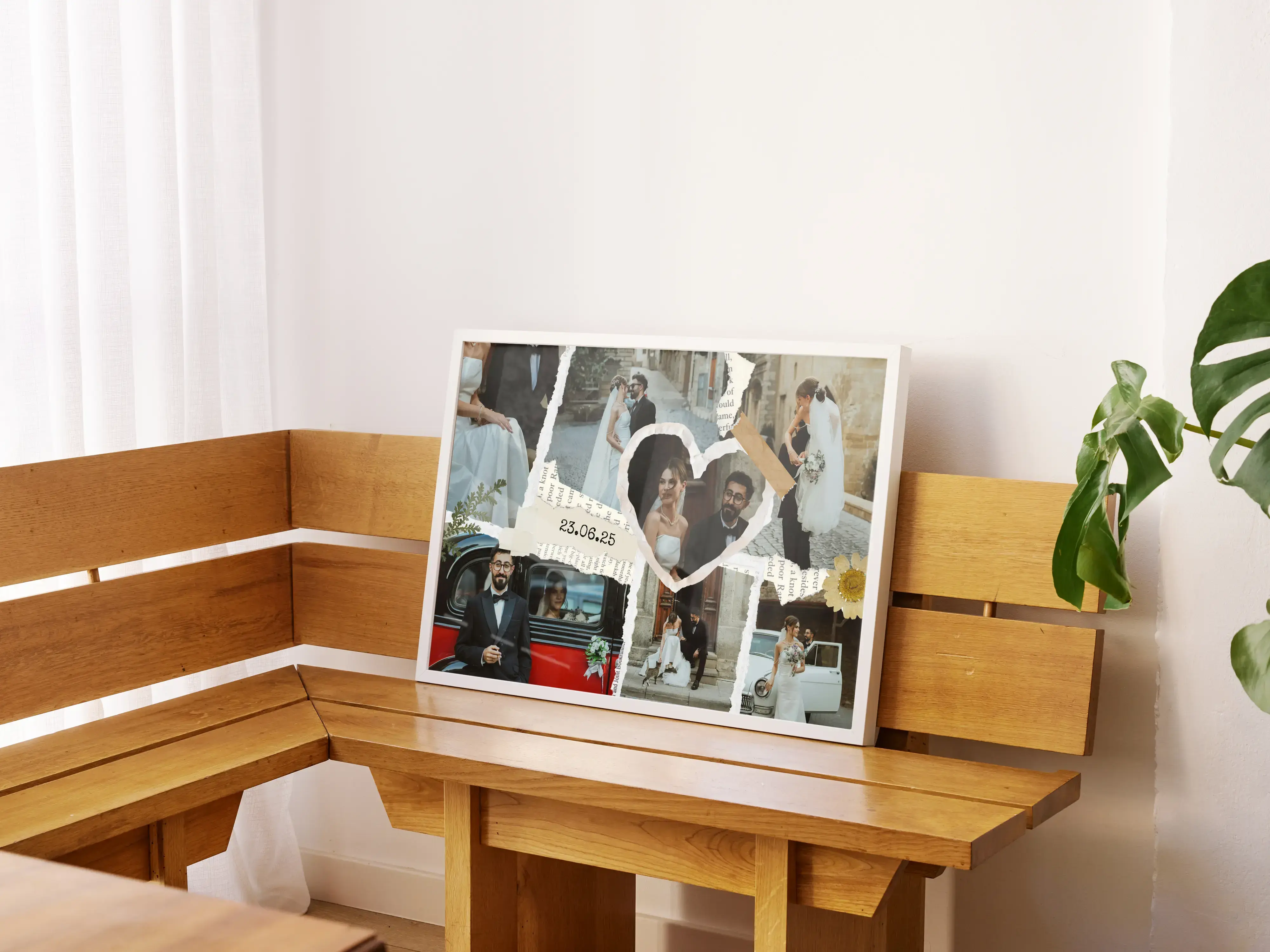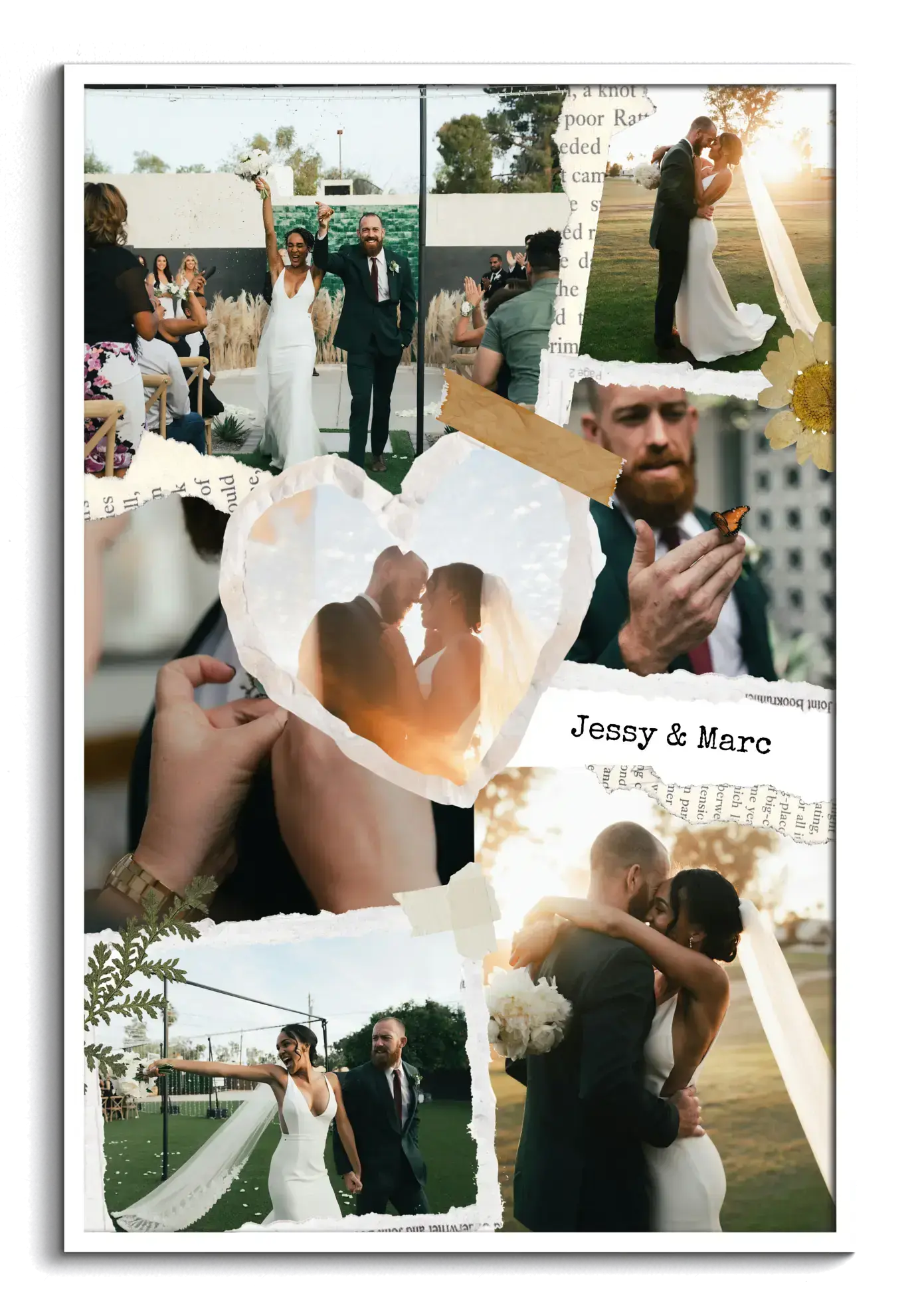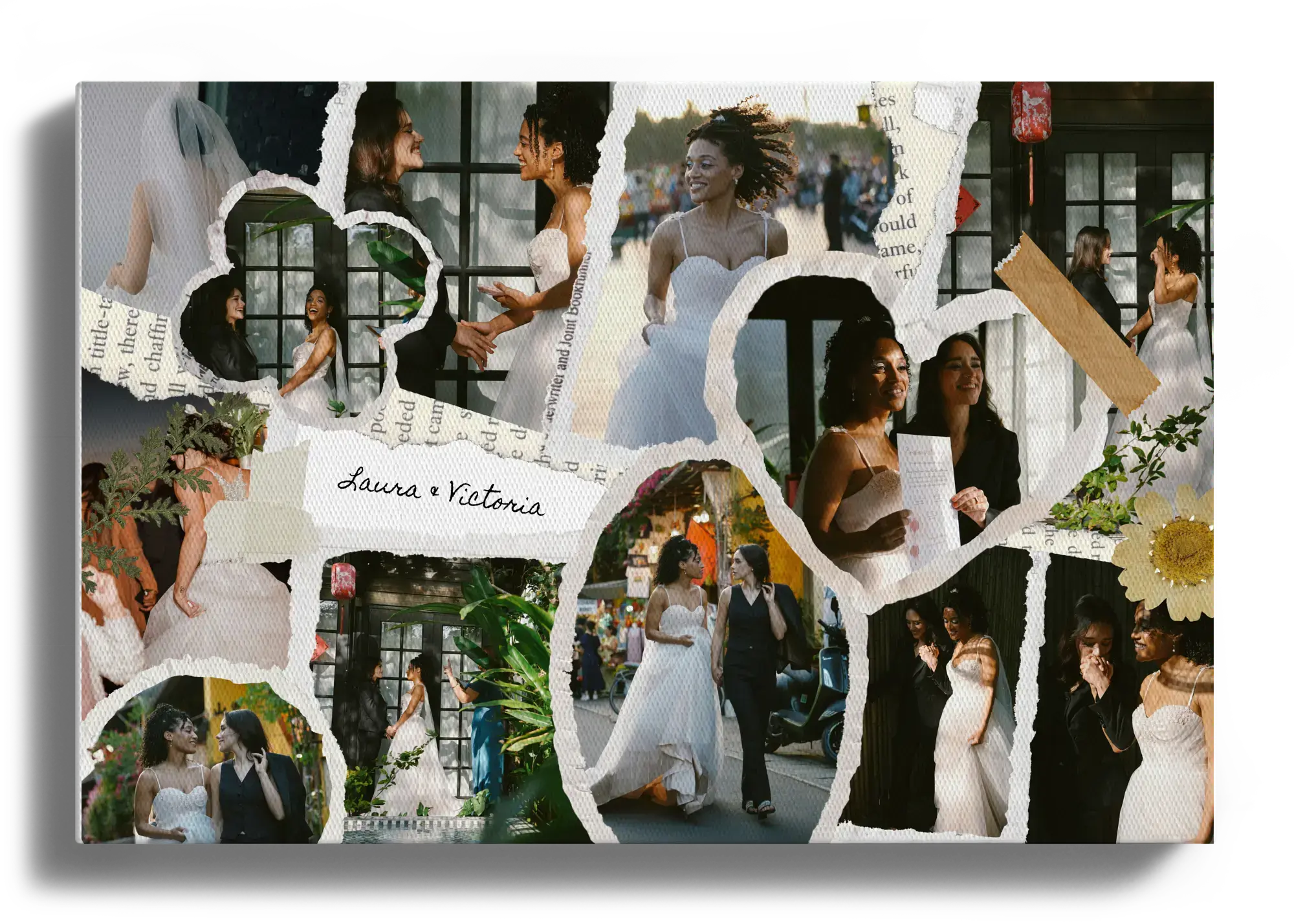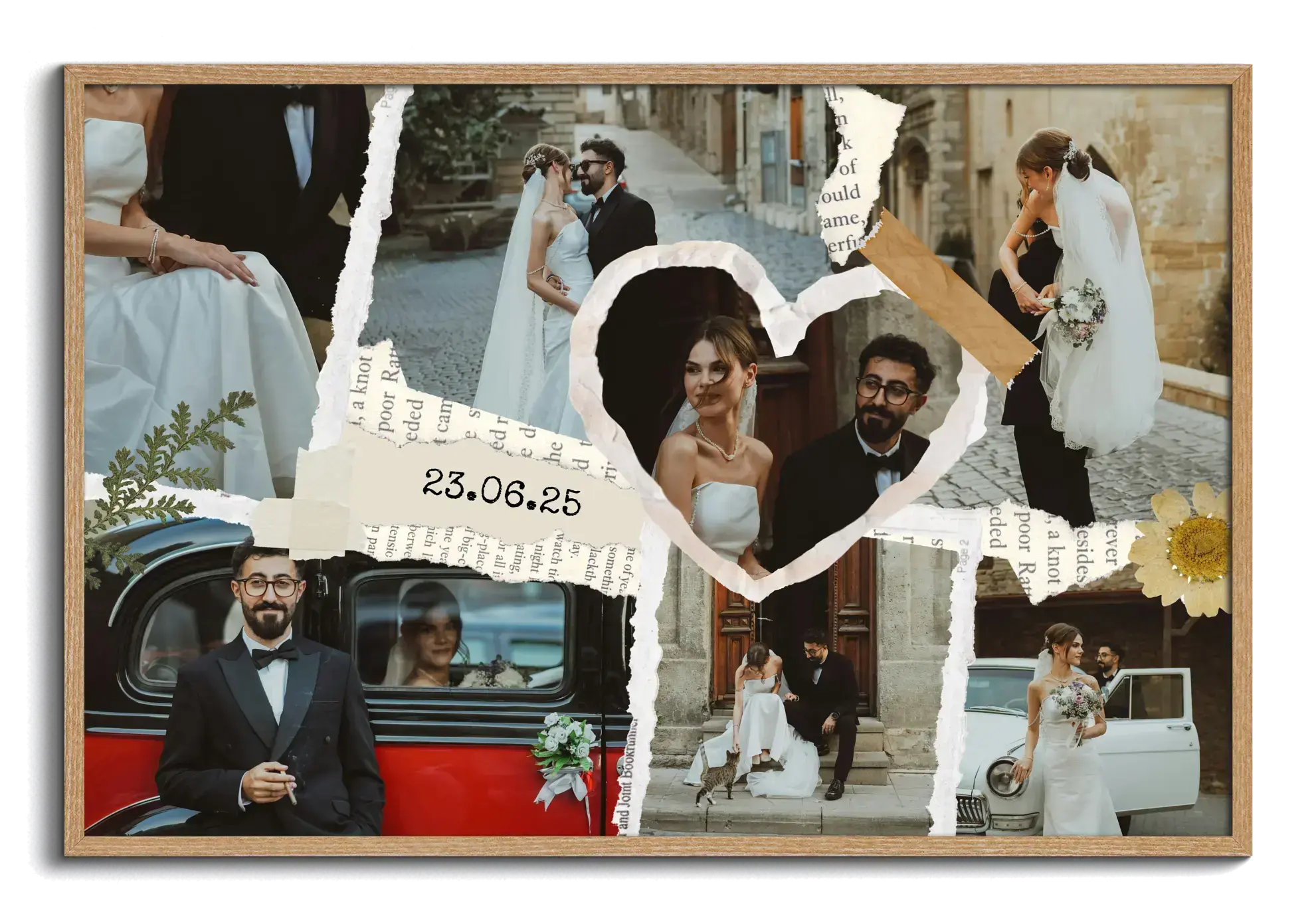 Crea ora la tua stampa in stile scrapbook per matrimonio o fidanzamento: più foto vengono disposte come ritagli di carta, arricchite da nastri adesivi decorativi, piccoli dettagli grafici e testi manoscritti come nomi e data. Un ricordo personale, romantico e originale, in formato orizzontale o verticale.