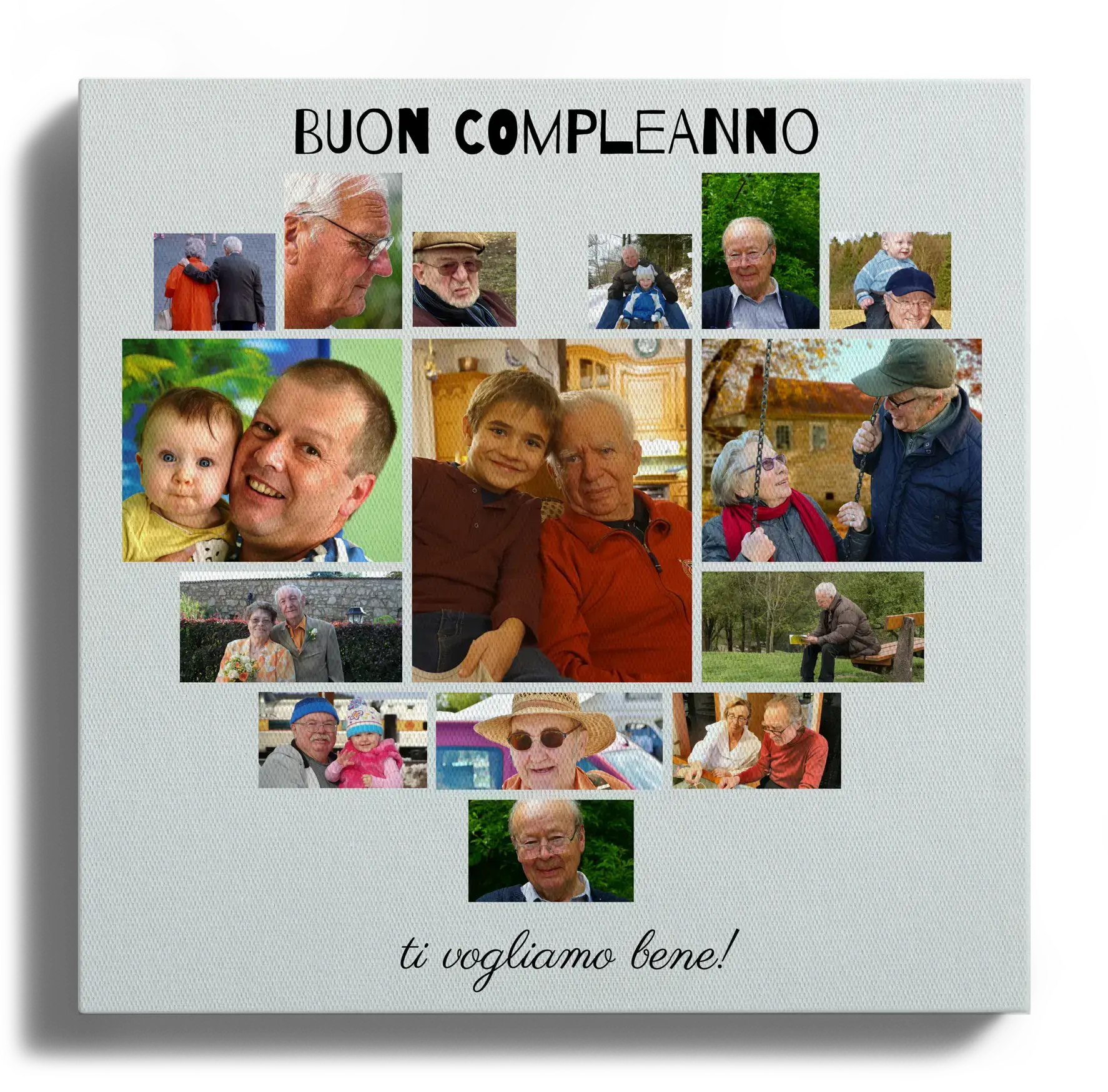 Scopri l'emozione di donare un ricordo prezioso con la nostra fotocollage a forma di cuore. Carica le tue foto e personalizza la tua Collage Cuore, perfetta come regalo per i nonni e per altre occasioni speciali. Con un messaggio speciale come "Happy Birthday, ti vogliamo bene", questo design toccante e creativo diventa una dichiarazione d'amore visiva, pensata per famiglie e amici che desiderano un ricordo unico e significativo. La personalizzazione è totale: dai testo alla scelta dello sfondo.