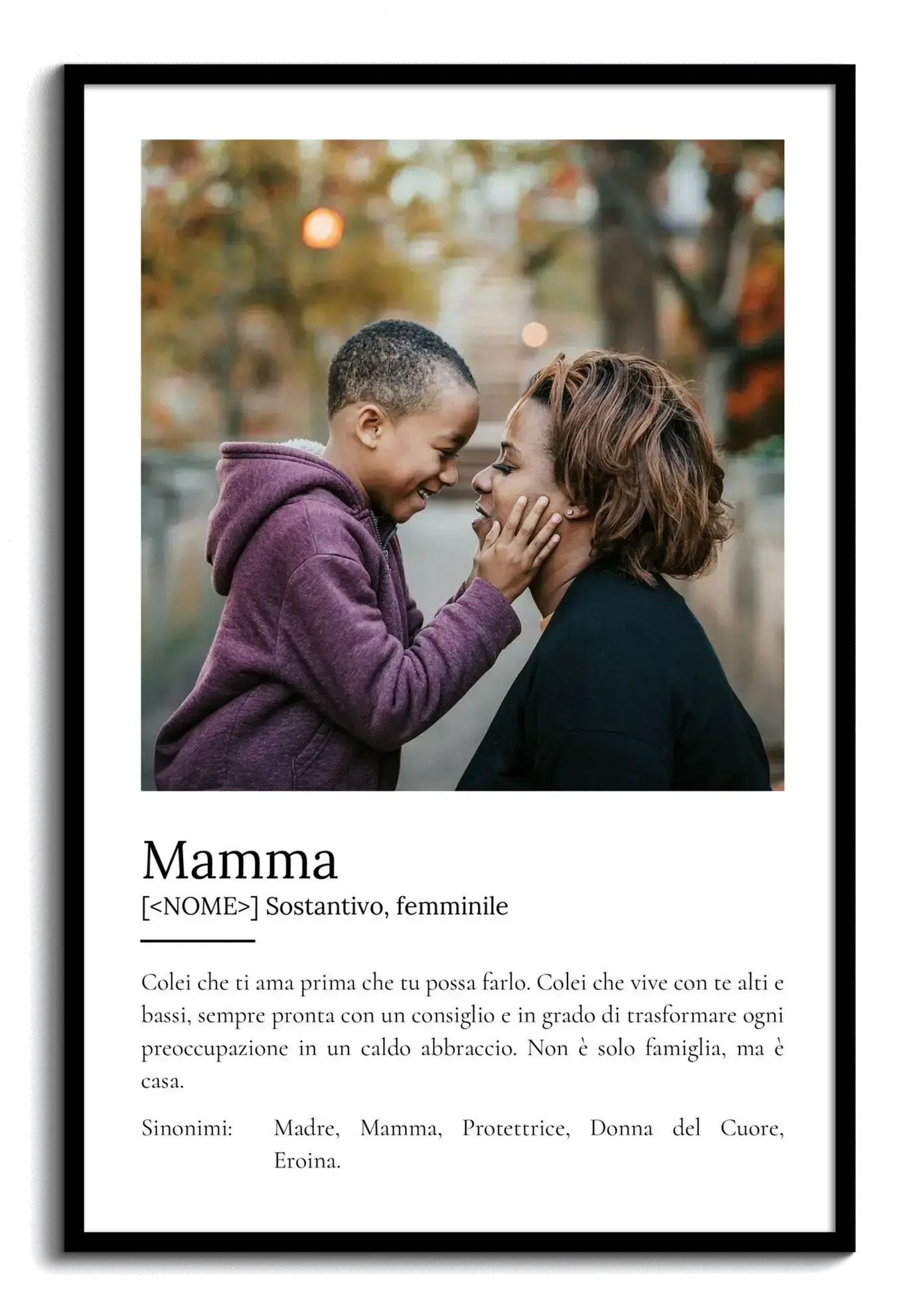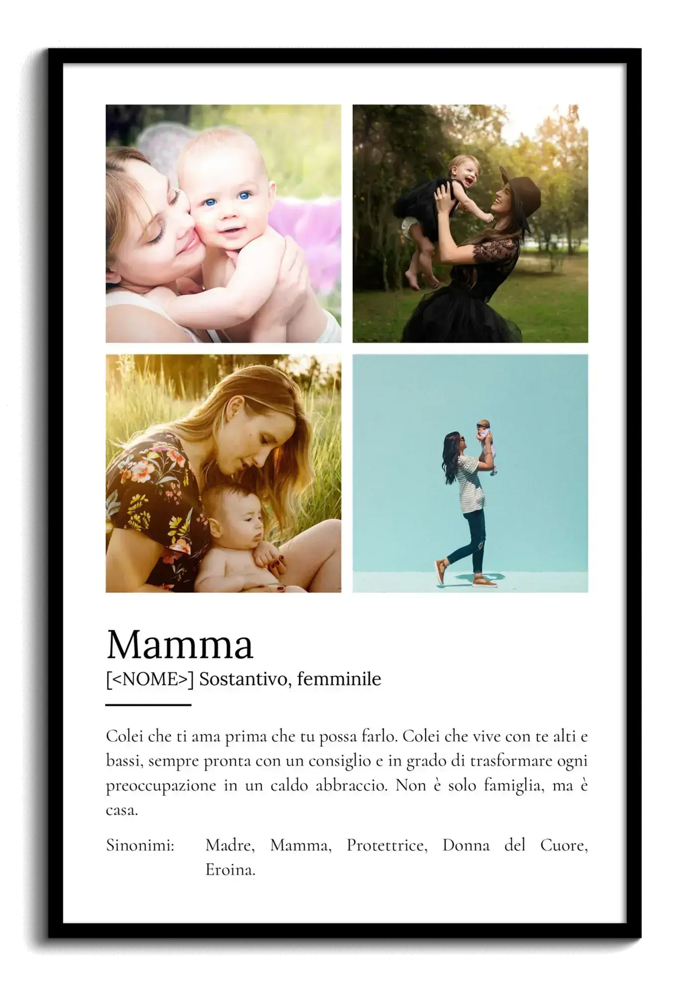 Crea una fotocollage unica per celebrare la tua mamma con un poster definizione nel classico stile Duden! Questo regalo personalizzabile è pensato per esprimere l'amore e la gratitudine verso tua mamma, e può includere da uno a nove delle tue foto preferite. Il testo sottostante offre una definizione speciale: "Colei che ti ama prima ancora che tu possa farlo. Colei che attraversa con te alti e bassi, sempre con un consiglio pronto, capace di trasformare le maggiori preoccupazioni in calde abbracci. Non è solo famiglia, è casa". Personalizza il tutto, dalle parole ai colori, per creare un ricordo indimenticabile.