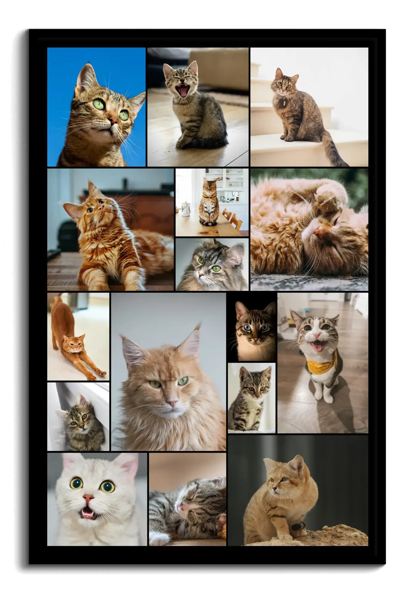 Crea ora la tua stampa personalizzata. Trasforma le foto della tua gatta o del tuo gatto in una composizione unica: griglia ordinata, cuore tenero, numeri o testo creativo. Aggiungi titoli personali come Cuore a 4 zampe o Re del divano, scegli i migliori scatti e impagina tutto in pochi minuti.