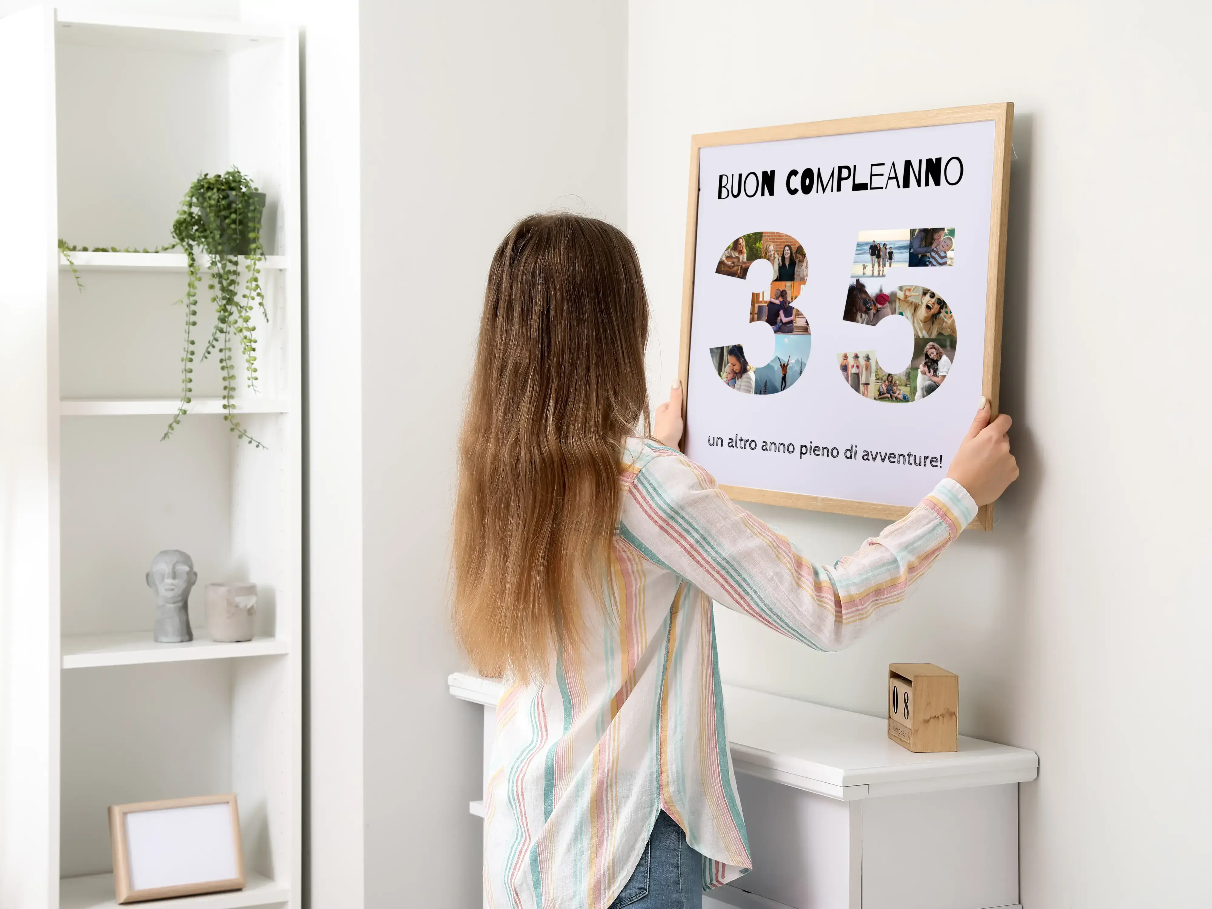 Crea la tua fotocollage personalizzata e rendi speciali i tuoi momenti unici! Immagina una collage in cui i ricordi prendono vita in una suggestiva forma, come nel nostro esempio di collage a forma di numero 35. Con 12 foto che riempiono la cifra, accompagnate dalla scritta "Happy Birthday" e "un altro anno pieno di avventure!", celebrando i tuoi momenti più preziosi.