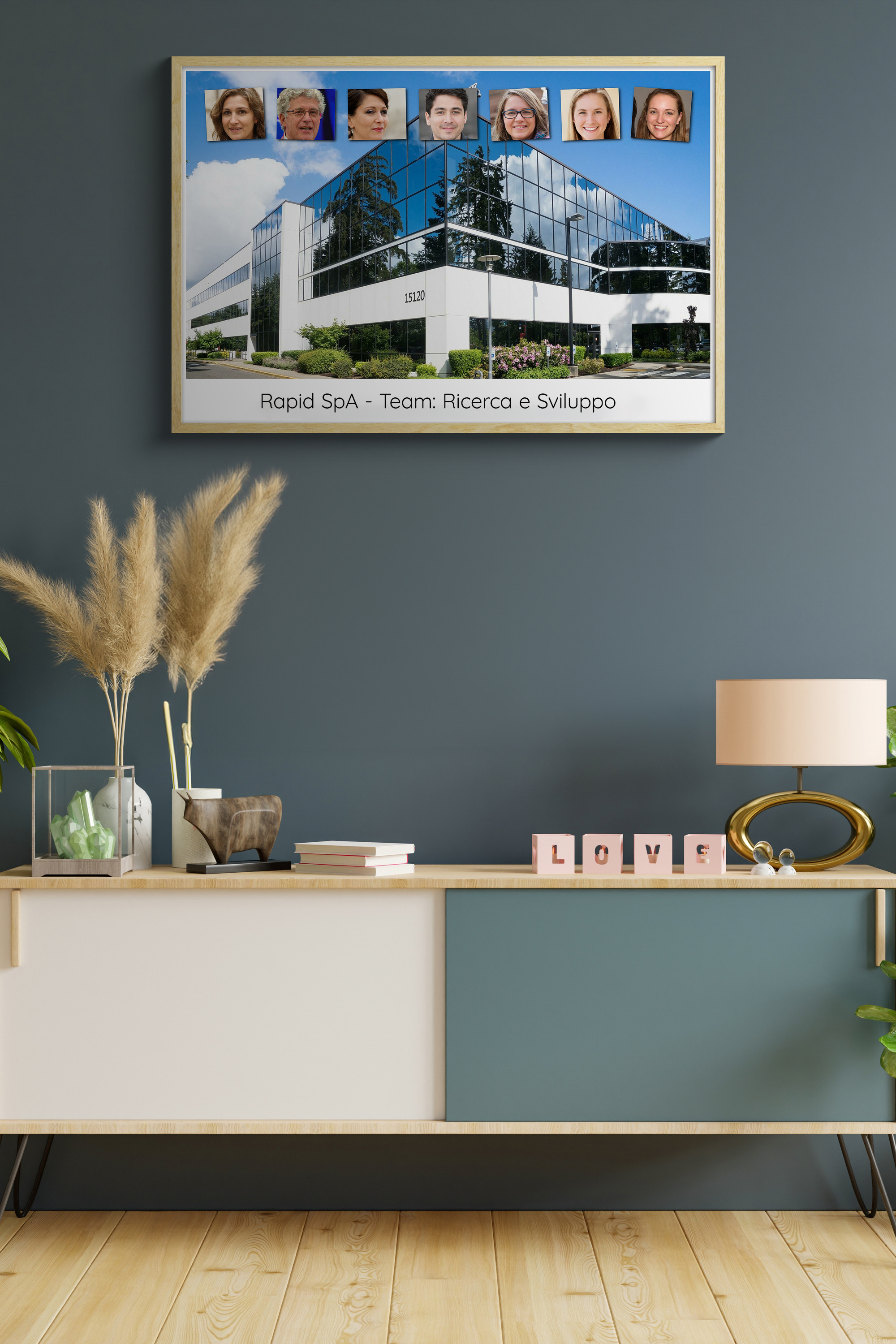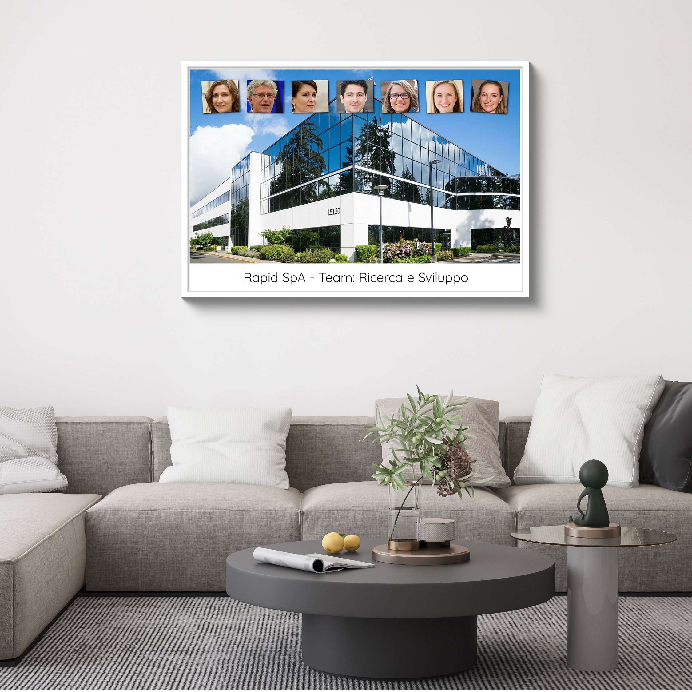 Collage personalizzata su Alu-Dibond per aziende, con foto del team e sfondo aziendale.