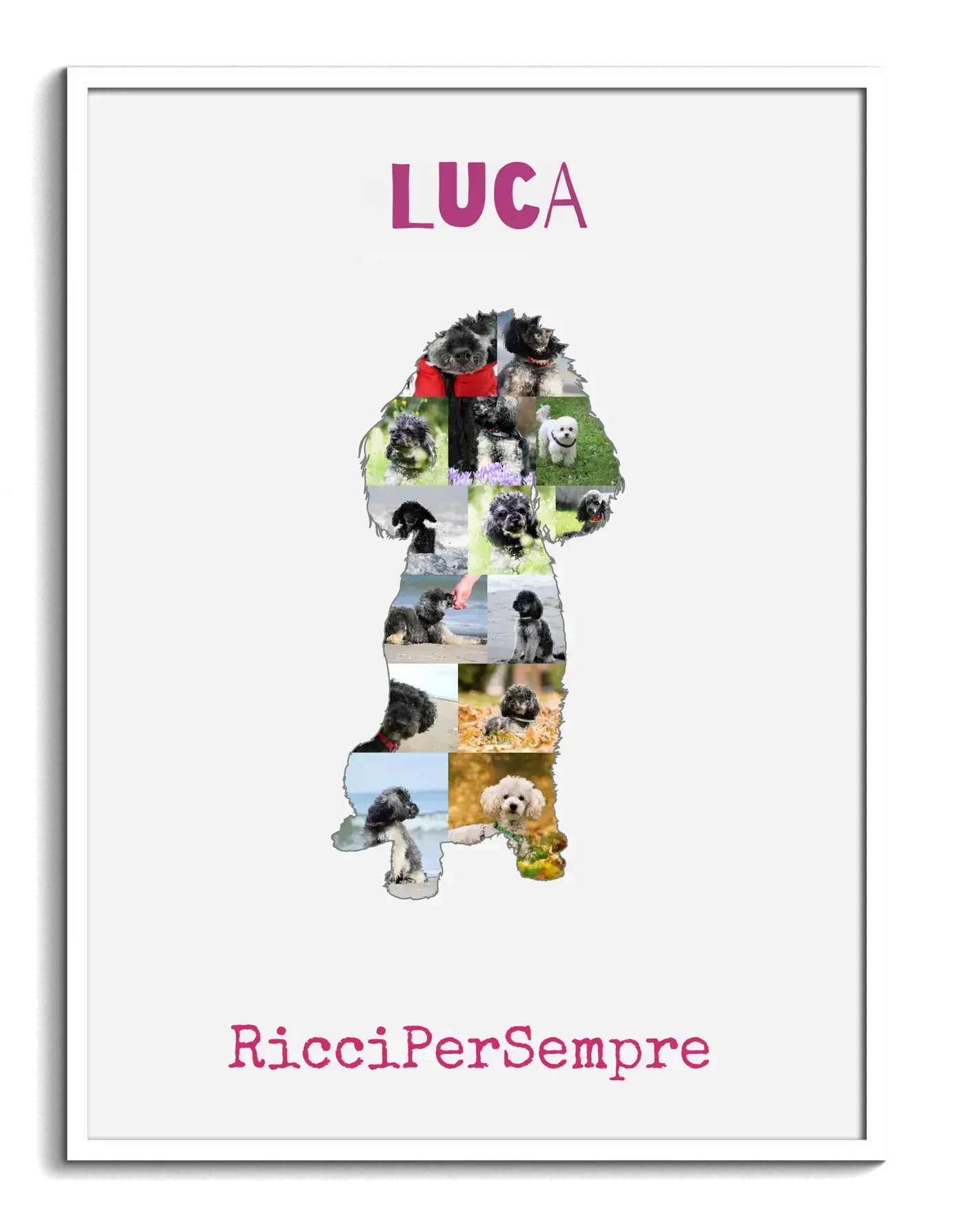Scopri la magia di creare la tua fotocollage personalizzata dedicata agli amanti dei cani. Immagina una silhouette di un barboncino nano, riempita con 15-20 delle tue foto e arricchita con un testo unico come "4ever" o "Locken4Life". Perfetta per custodire ricordi speciali del tuo amico a quattro zampe e ideata sia come elemento decorativo per la tua casa sia come regalo personale per gli amici cinofili.