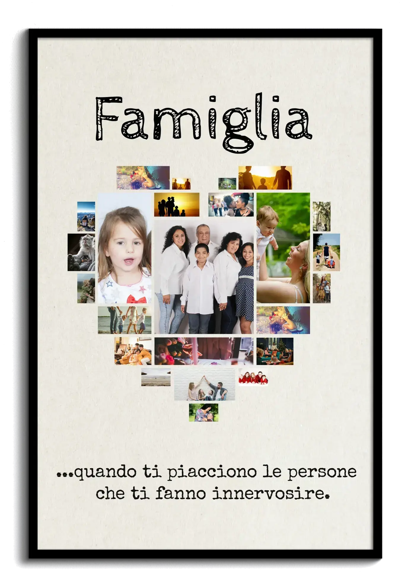 Crea la tua fotocollage personalizzata da esporre con orgoglio! Perfetta come regalo per tutta la famiglia, la nostra Fotocollage "Famiglia" presenta un delizioso cuore composto da foto di momenti felici. Con il testo "Famiglia" in alto e un divertente aforisma in basso "...quando apprezzi chi ti fa arrabbiare" puoi personalizzare queste parole per renderle uniche.