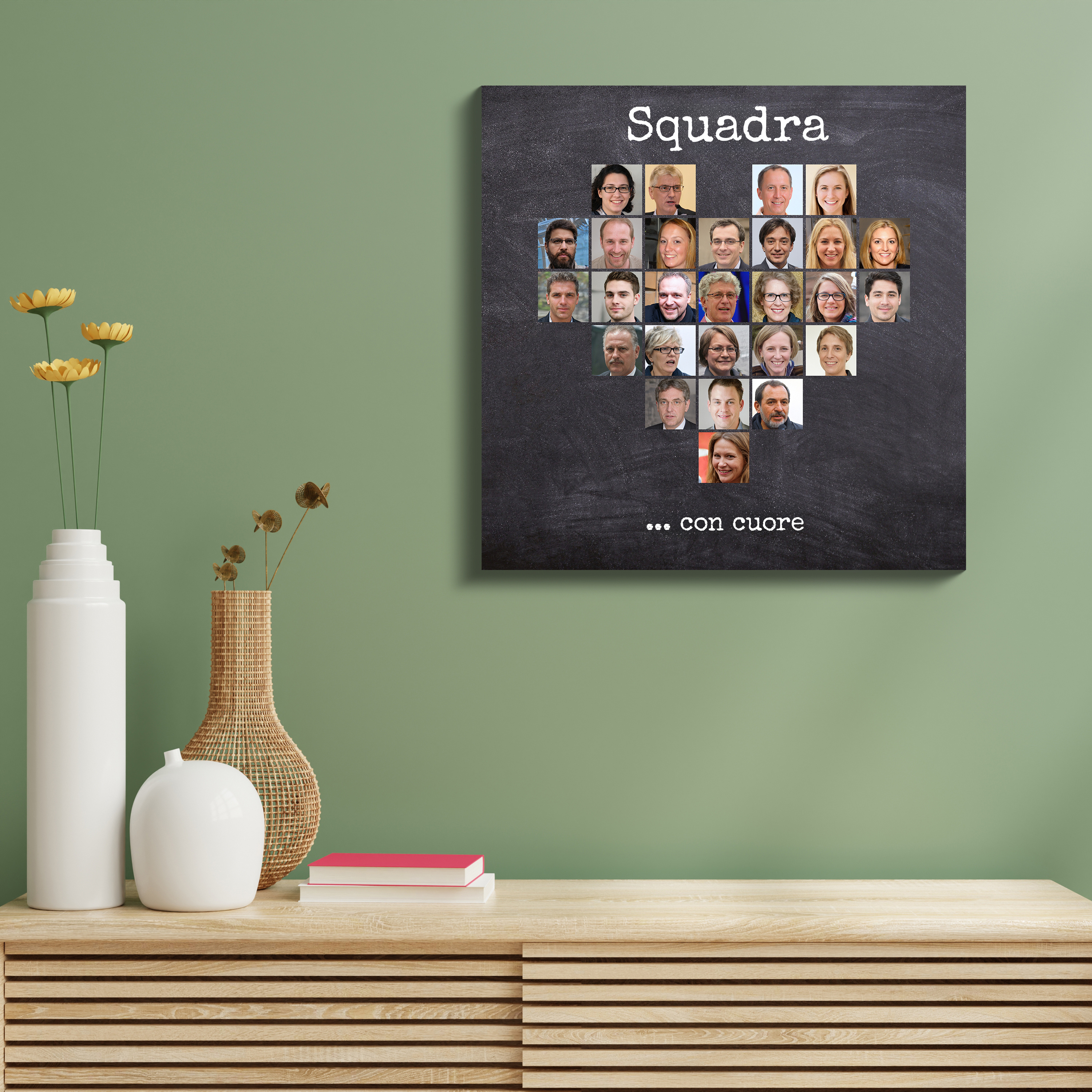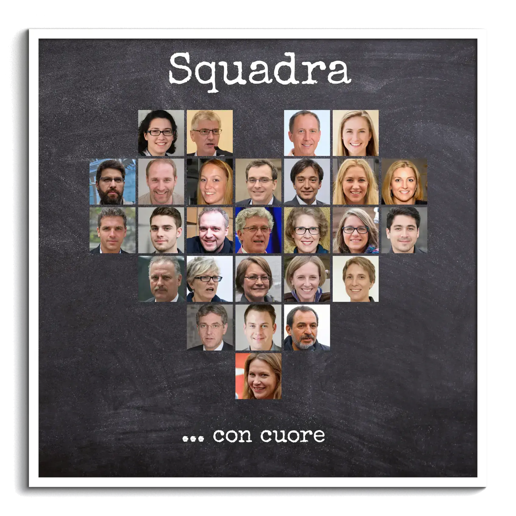 Crea la tua Fotocollage personalizzata e sorprendi chiunque con un regalo unico. Immagina una splendida fotocollage a forma di cuore, creata per un collega in partenza, con le foto del team disposte ordinatamente e arricchita dalla frase "Team con Cuore". Questo è il dono perfetto per un addio, un pensionamento o un cambio di lavoro. Personalizza le foto, la frase, i colori di sfondo, il carattere e il layout.