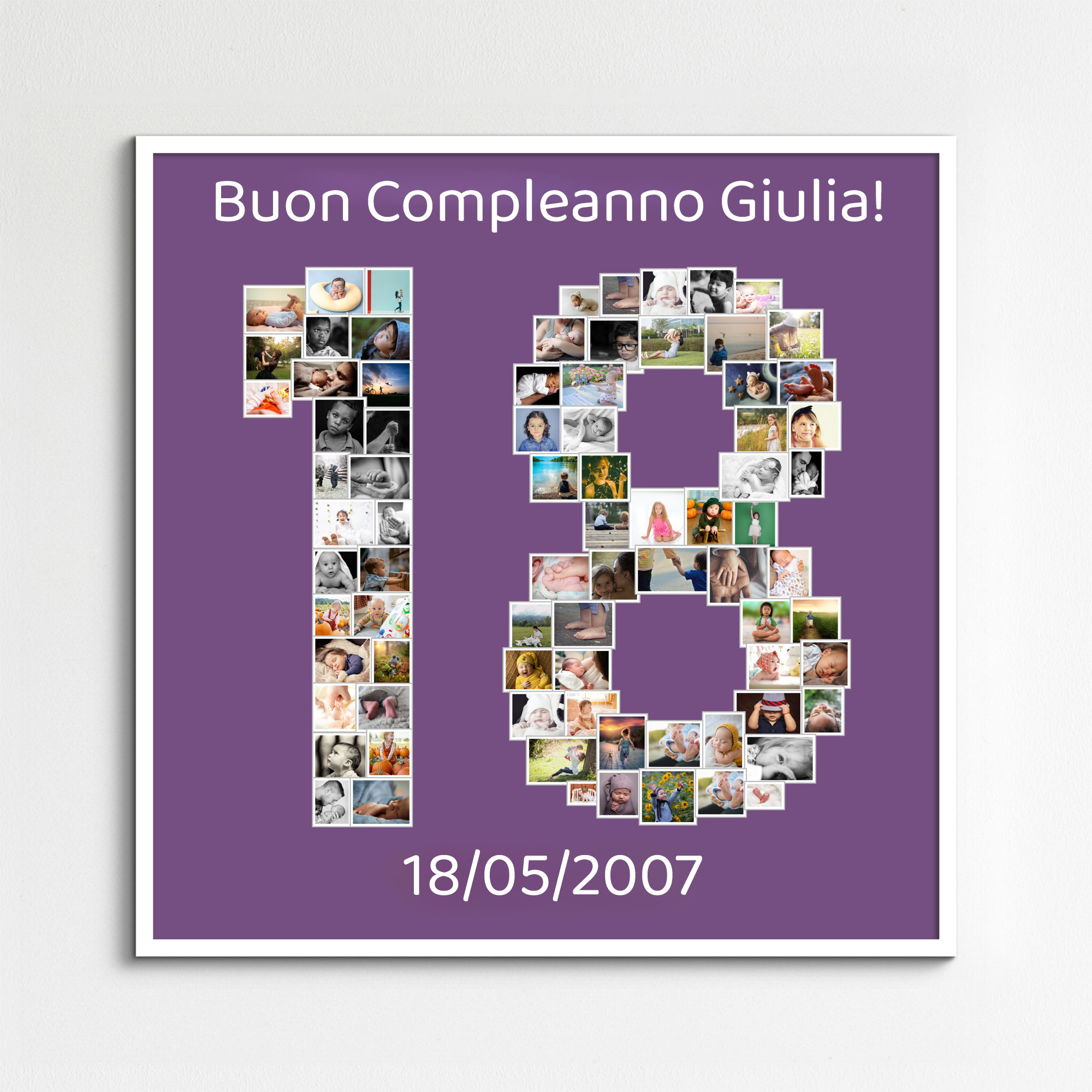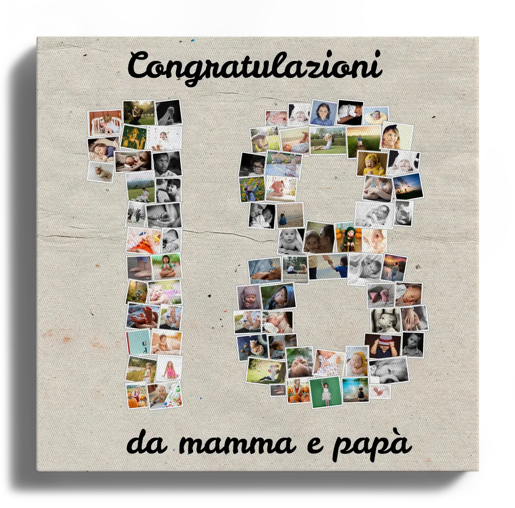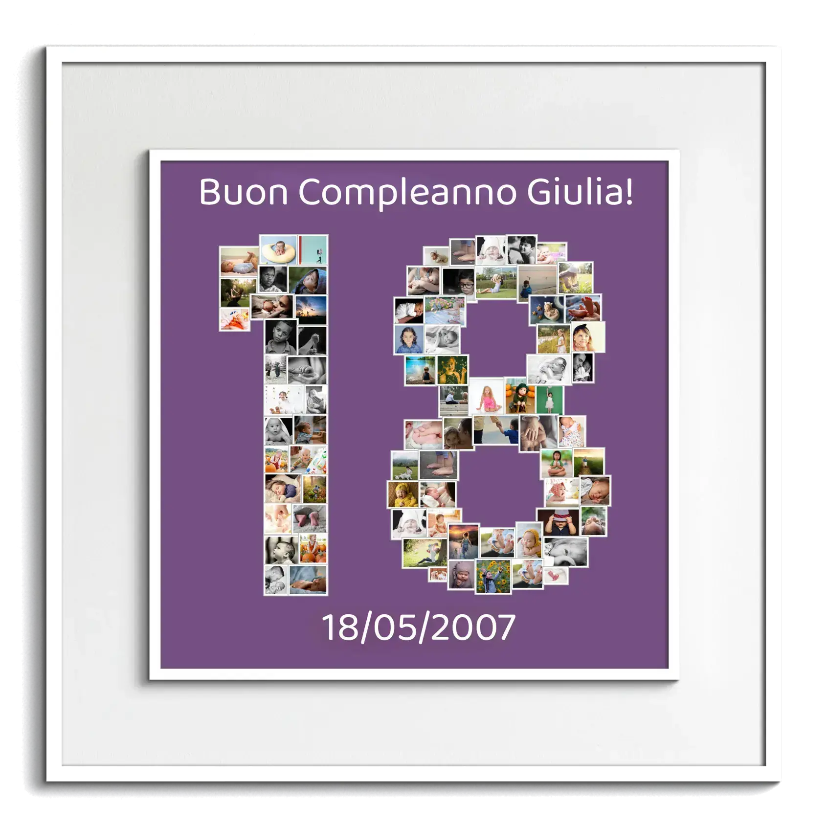 Crea la tua collana di ricordi speciale con la nostra fotocollage personalizzabile. Immagina una fotocollage a forma del numero 18, composta da tantissime immagini che celebrano una tappa importante, come la maggiore età. Puoi utilizzare da 1 a 100 foto, a seconda della tua creatività e della scelta della nostra vasta gamma di modelli. Questo è il regalo perfetto per compleanni significativi o qualsiasi altra occasione speciale.