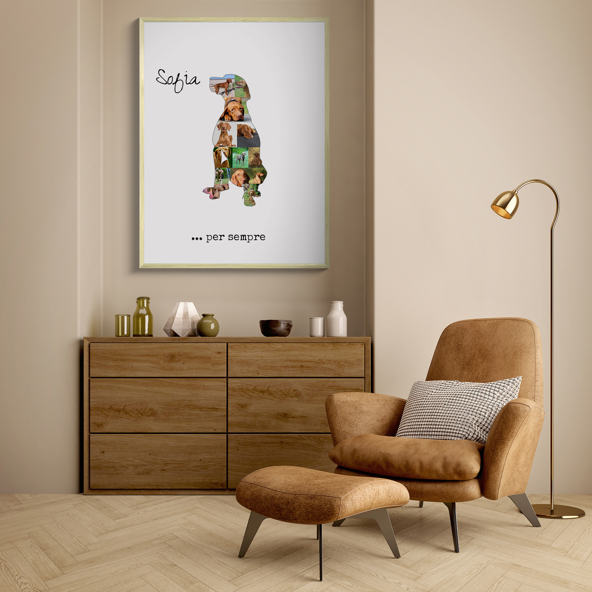 Crea un ricordo indimenticabile del tuo amico a quattro zampe con la nostra fotocollage personalizzata. Immagina la sagoma di un Magyar Vizsla, composta da 15-20 delle tue foto preferite, arricchita da un testo personalizzato come "per sempre" o "love". Perfetta per gli amanti dei cani che desiderano un tocco unico e personale per decorare la casa o come regalo speciale per amici e famiglia.