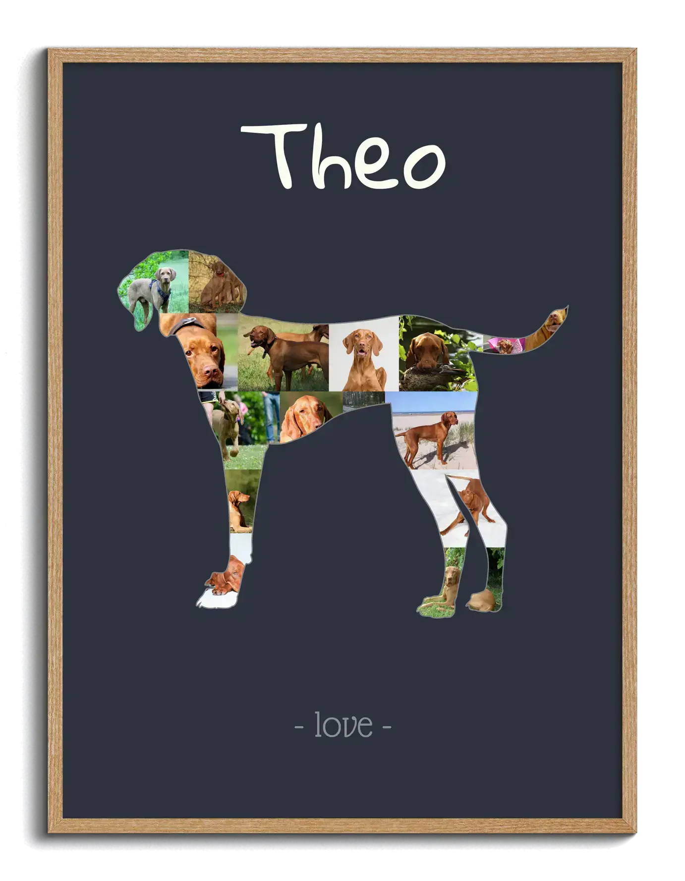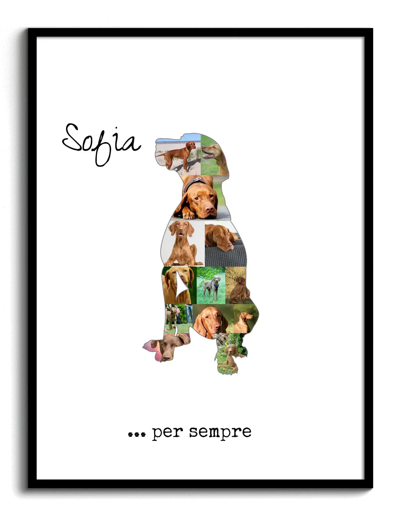 Creare la tua fotocollage è semplice e veloce. Scegli la sagoma del Vizsla, carica le tue foto nella web-app e posizionale all'interno della sagoma. Personalizza ulteriormente con un testo e scegli i colori che preferisci. Una volta soddisfatto, puoi scegliere di ordinare il tuo capolavoro nei vari formati disponibili, o scaricarlo direttamente.