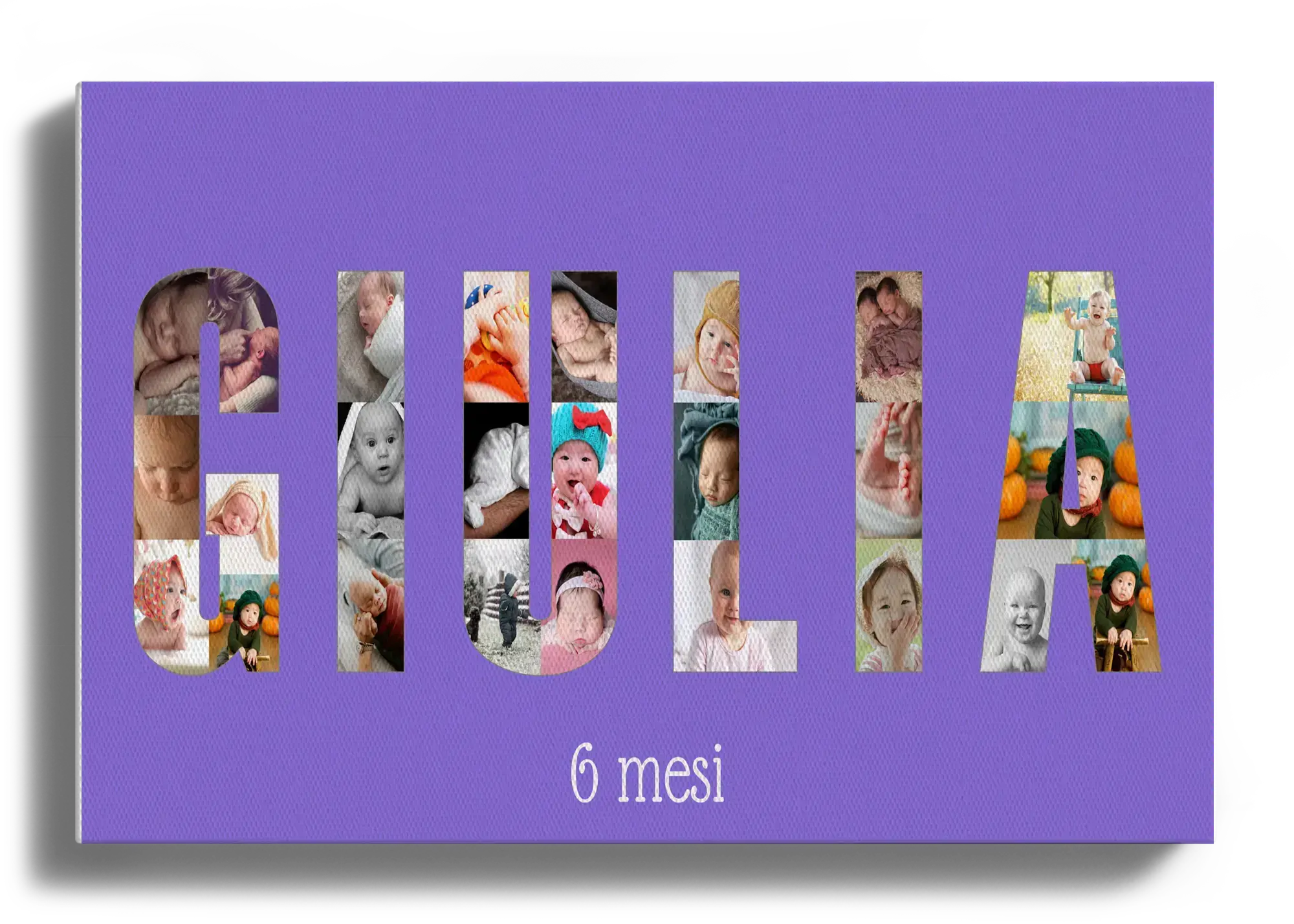 Scopri la magia di creare una fotocollage personalizzata direttamente dal tuo browser. Immagina il nome del tuo bambino composto da foto su uno sfondo lilla, arricchito dal testo 6 mesi. È un regalo ideale per la nascita, il battesimo o per decorare la cameretta. Puoi personalizzare la collaga con le tue foto preferite, colori di sfondo, font e testi.