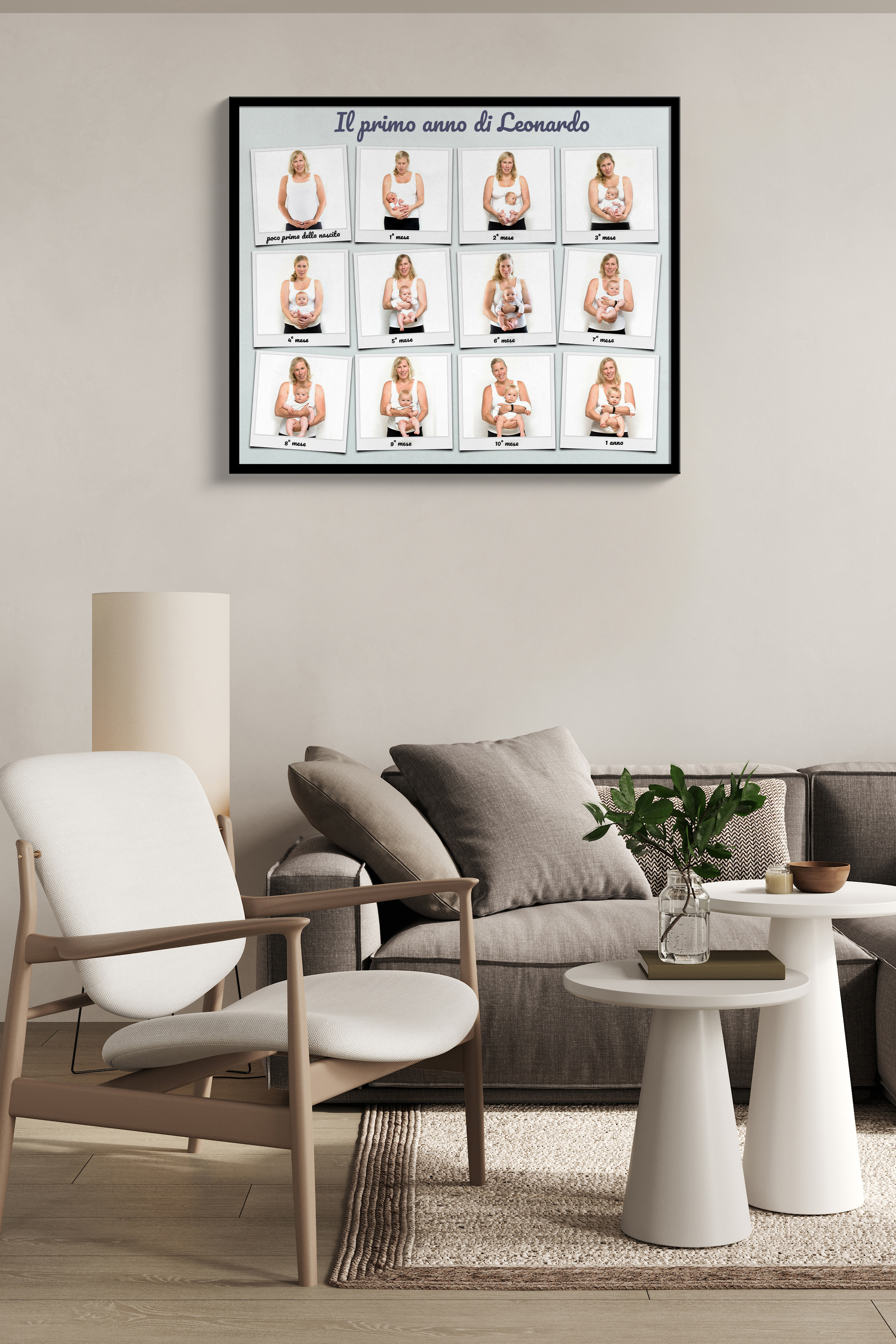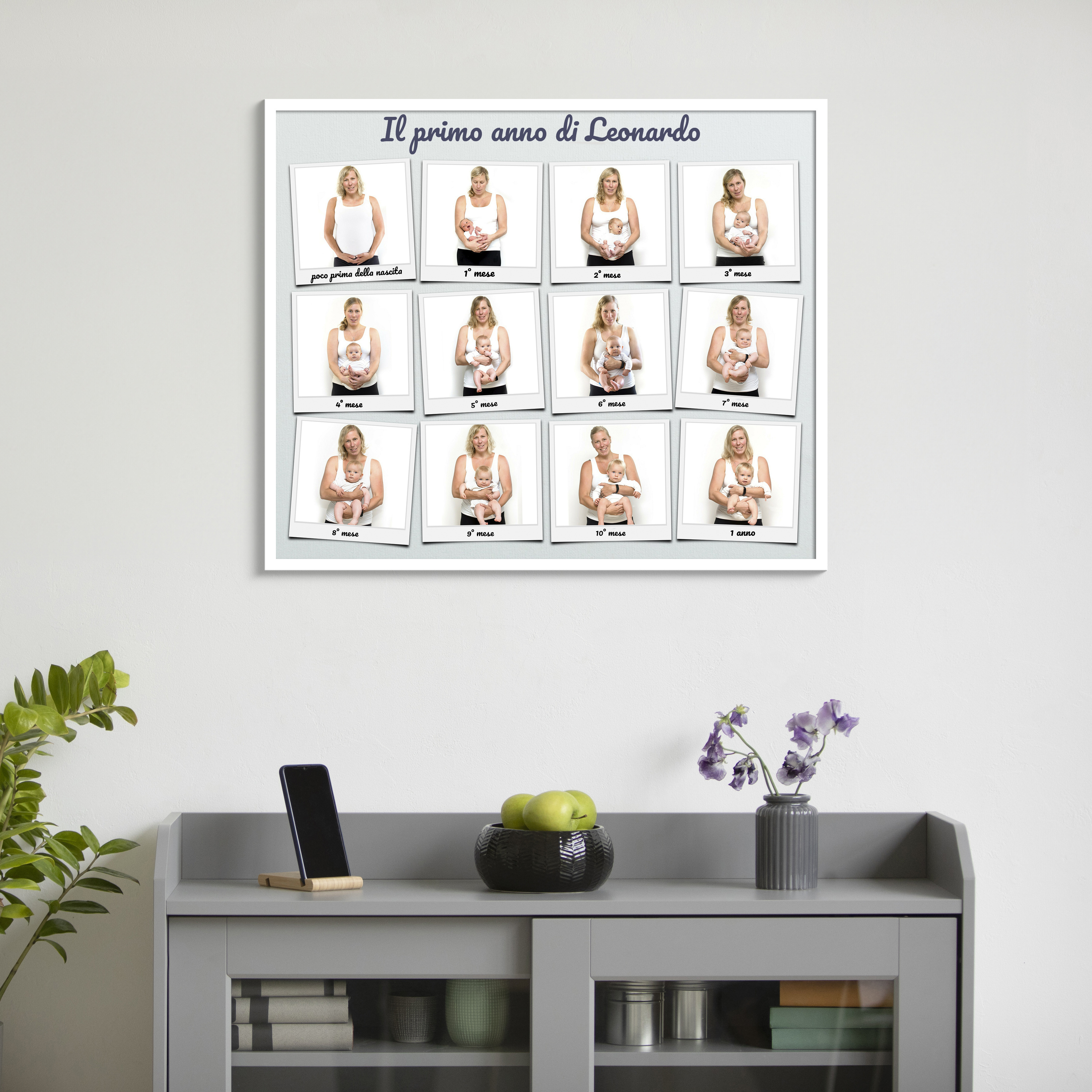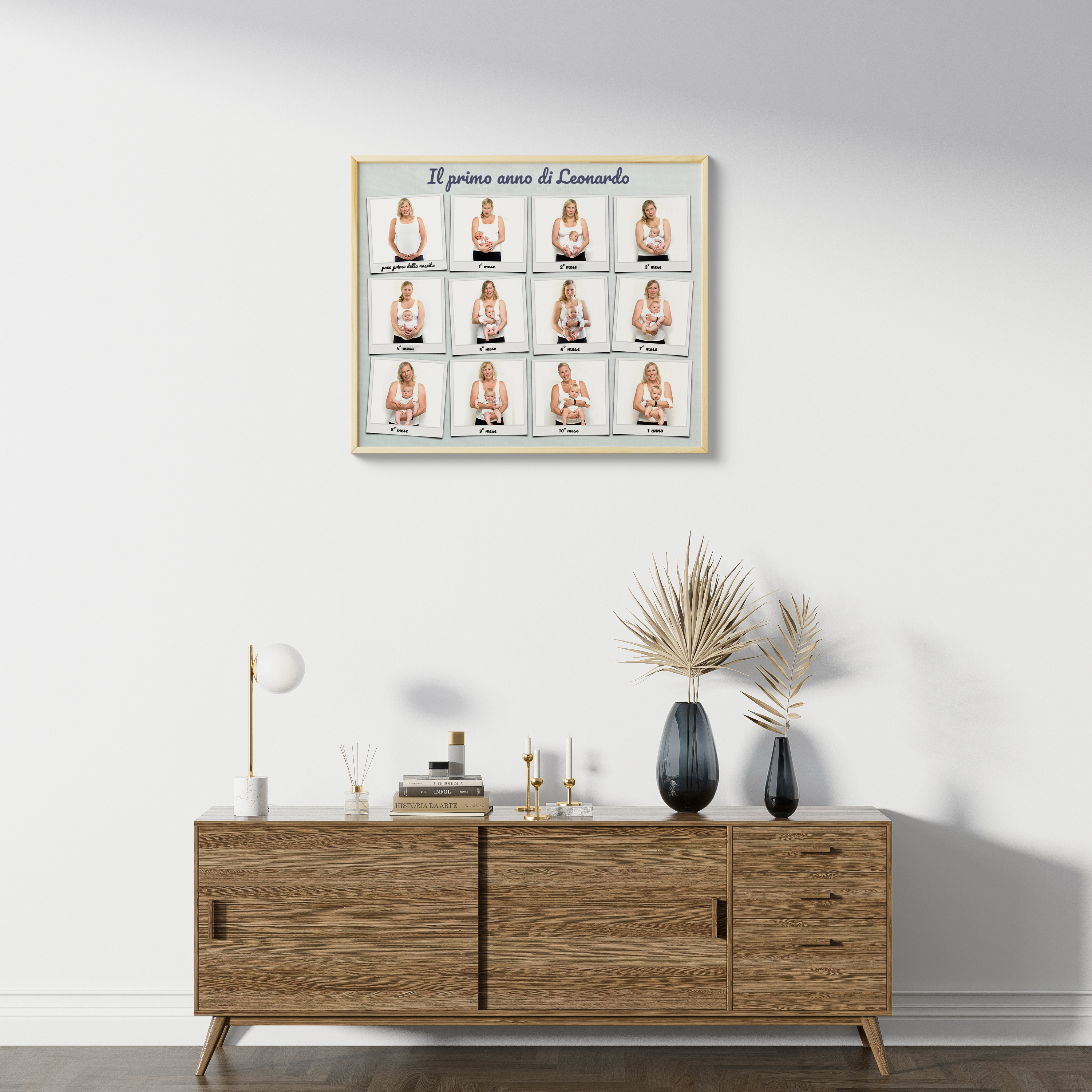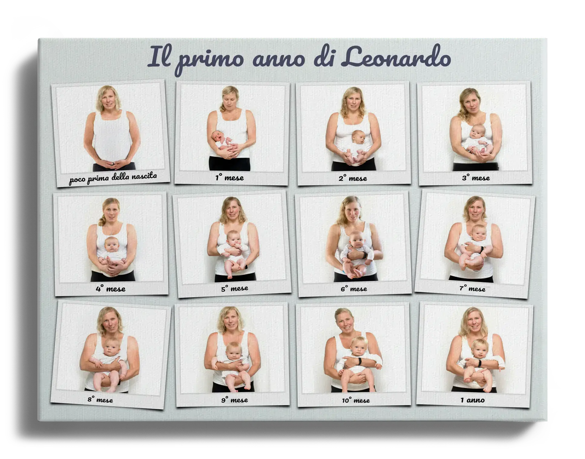 Scopri la nostra fotocollage personalizzabile in stile Polaroid. Perfetta come poster, puoi inserire fino a 12 foto, una per ogni mese nel primo anno di vita di un bambino. Aggiungi un tocco personale con la frase "Jonas primo anno" sopra le immagini. Personalizza ogni foto con una didascalia unica. Ideale per genitori, nonni o come regalo per una nascita o il primo compleanno.