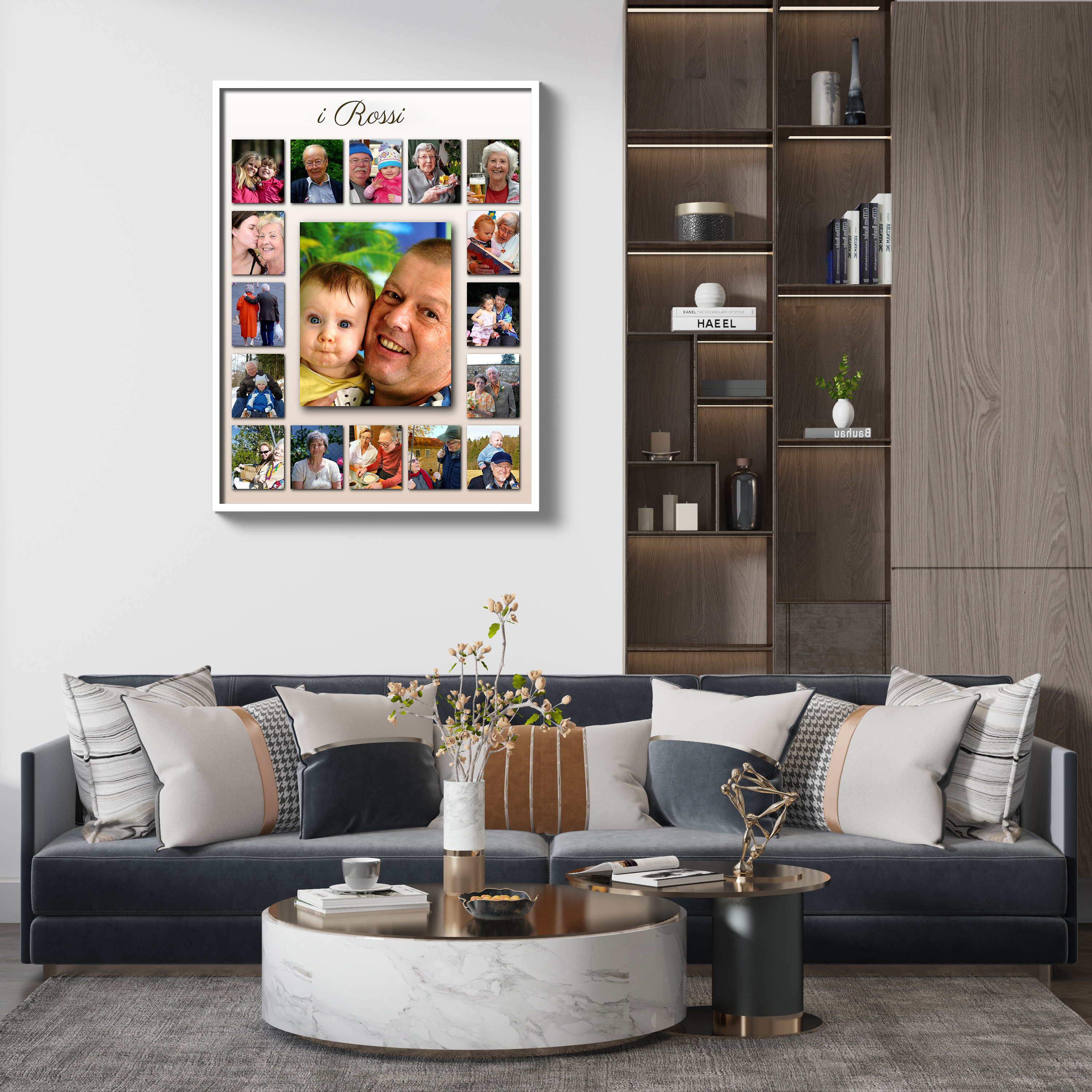 Crea la tua personale opera d'arte! Con il nostro servizio, puoi trasformare i tuoi ricordi in una splendida fotocollage, ideale come poster o stampa su materiali di alta qualità. Immagina un grande foto centrale di te e la tua famiglia, circondata da altre piccole immagini affettuose dei tuoi cari. Un tocco personale con la scritta "i Müller", rendendo il tutto un regalo perfetto o un elemento decorativo per la tua casa.