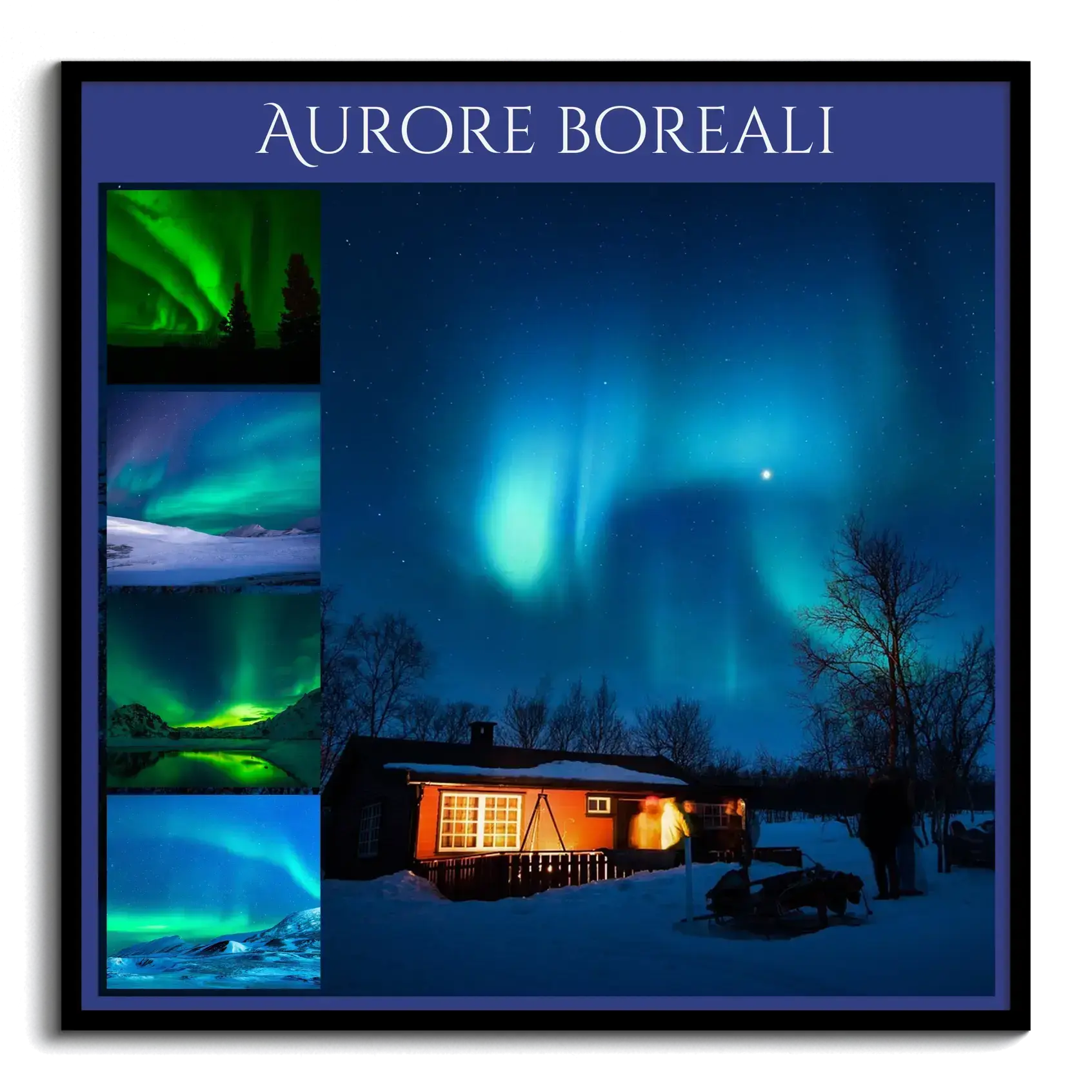 Fenomeni naturali in collage: aurore, cascate, arcobaleni e temporali in stampa premium.