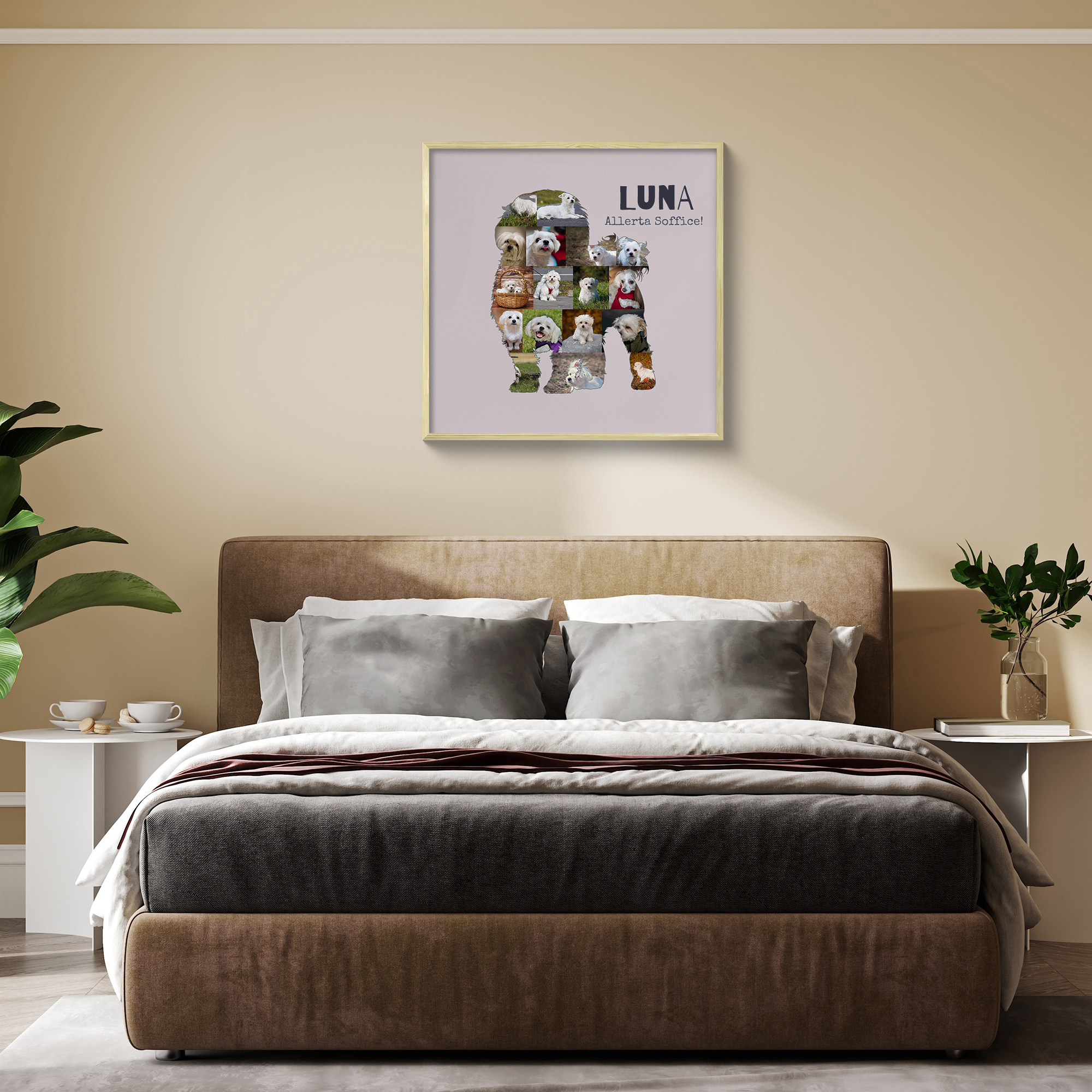 Scatena la tua creatività e crea un'opera personalizzata unica: una fotocollage dal tema canino. La sagoma di un Malteser in posizione seduta o in piedi prende vita con 15-20 foto dei tuoi momenti speciali. Personalizza ulteriormente con testi dolcissimi come Flauschalarm o Zuccherwatte mit Augen, per un ricordo vivace e unico del tuo fedele amico a quattro zampe.