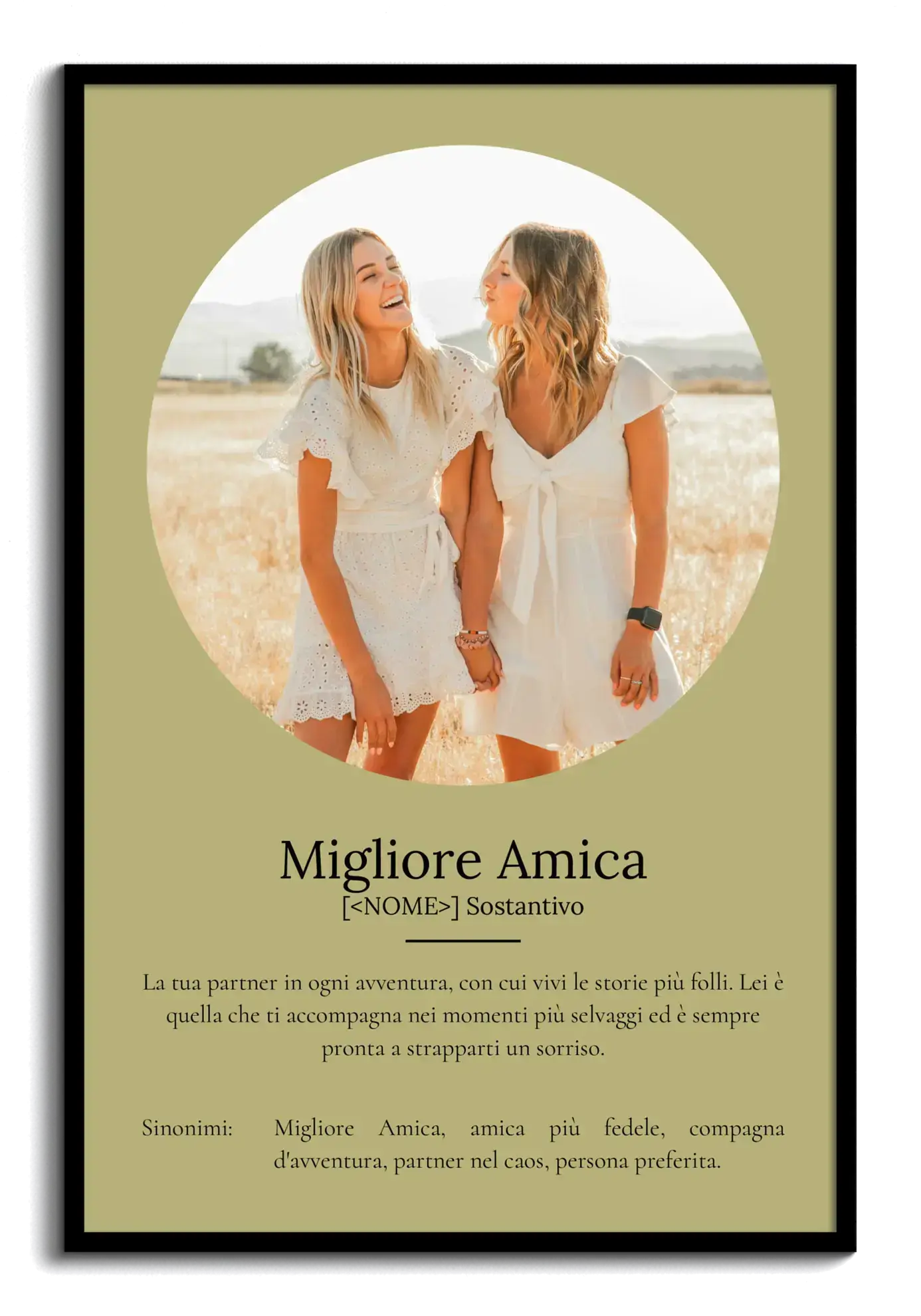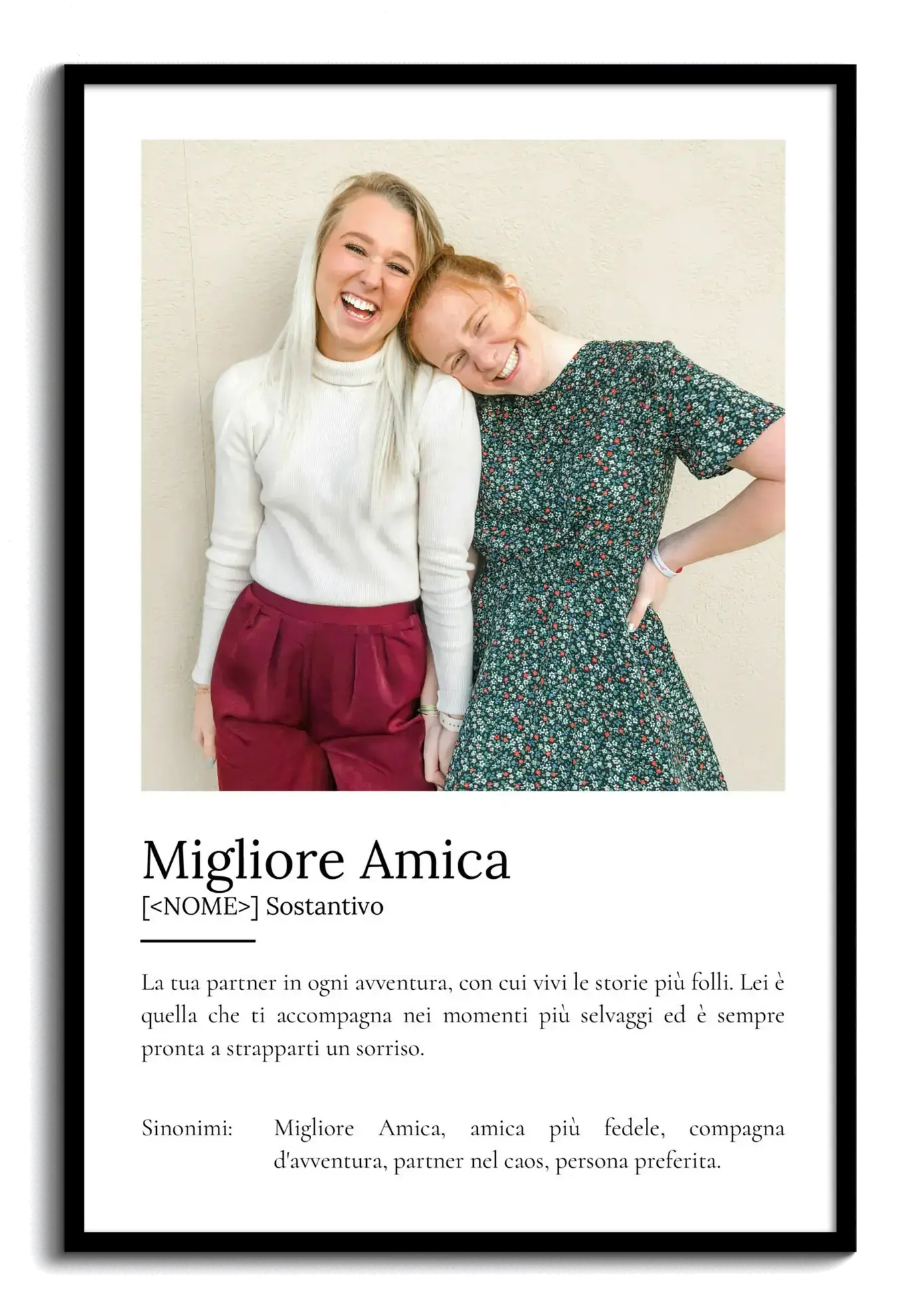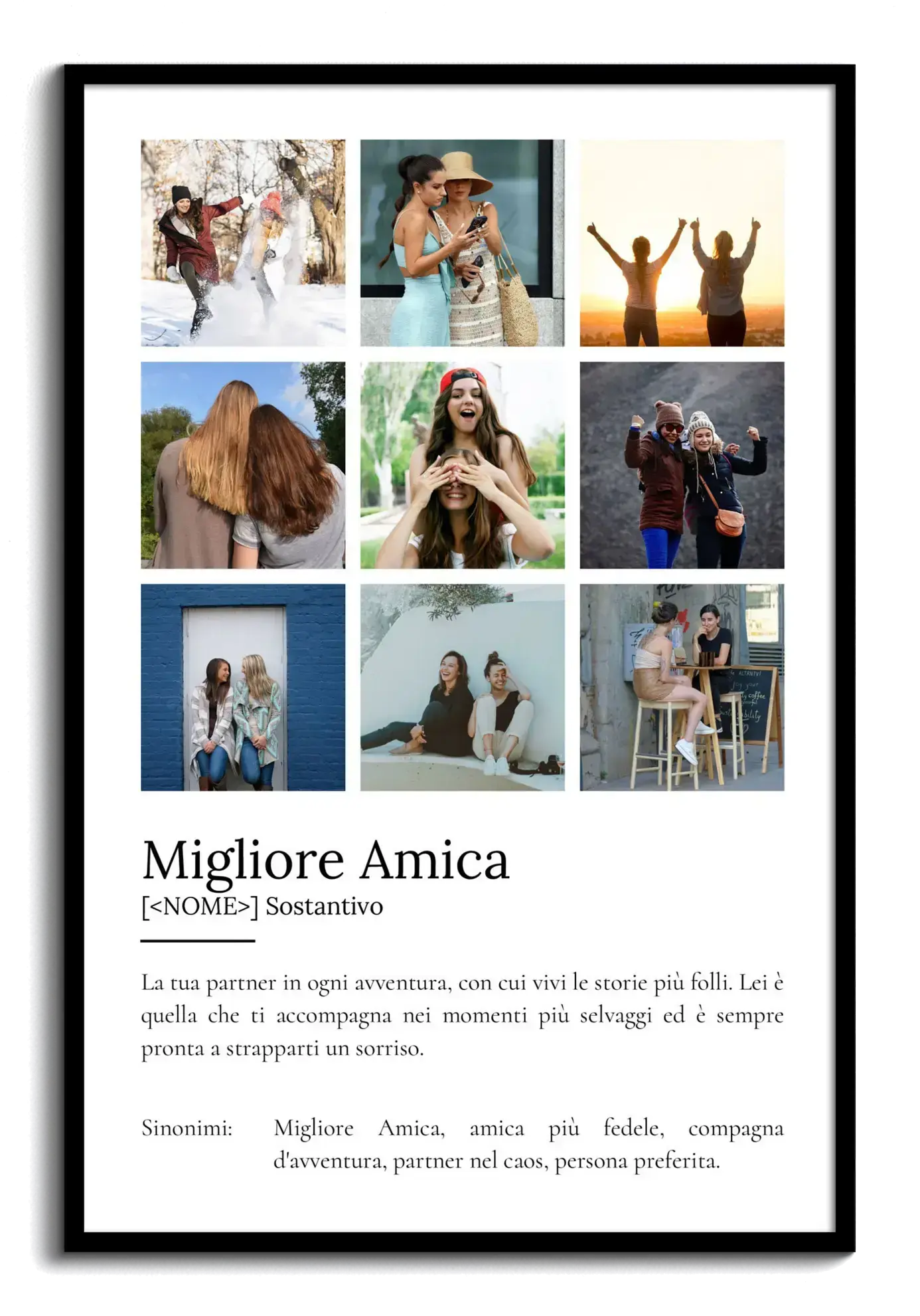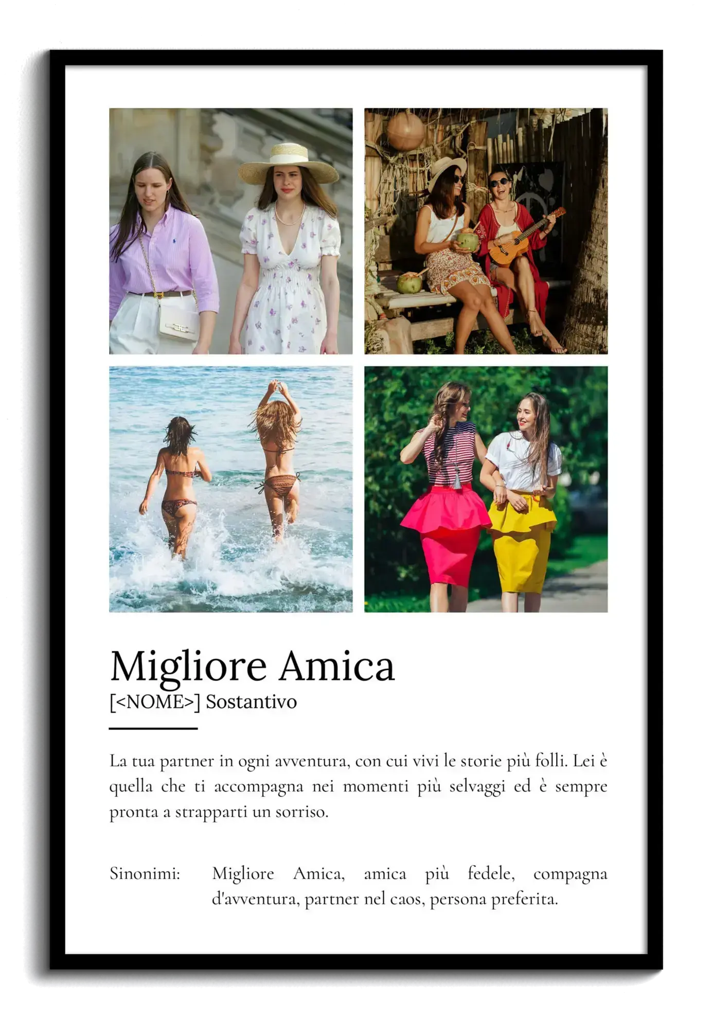 "Celebra la tua 'Bestie': personalizza con foto e testi per raccontare la vostra avventura unica."
