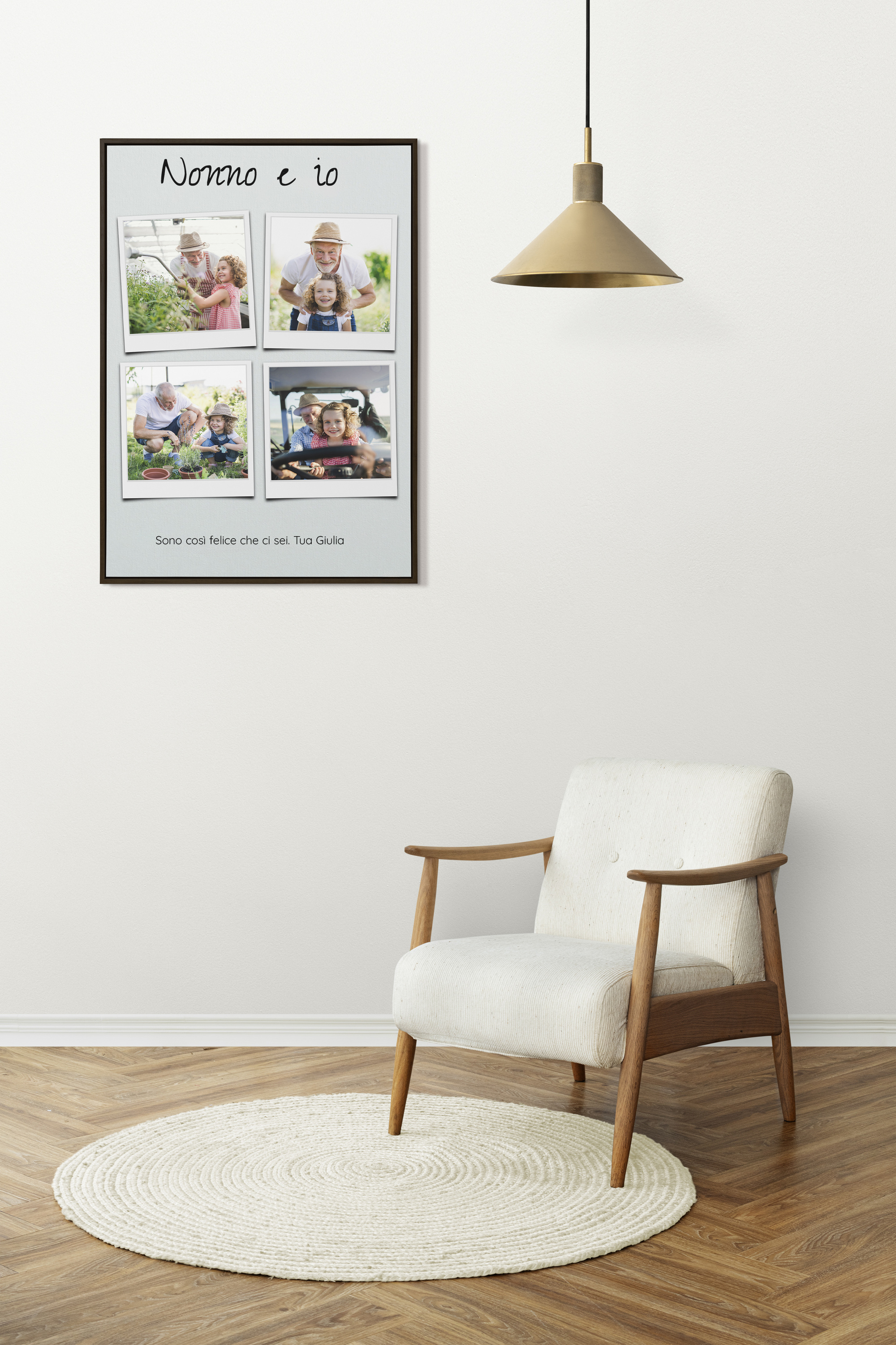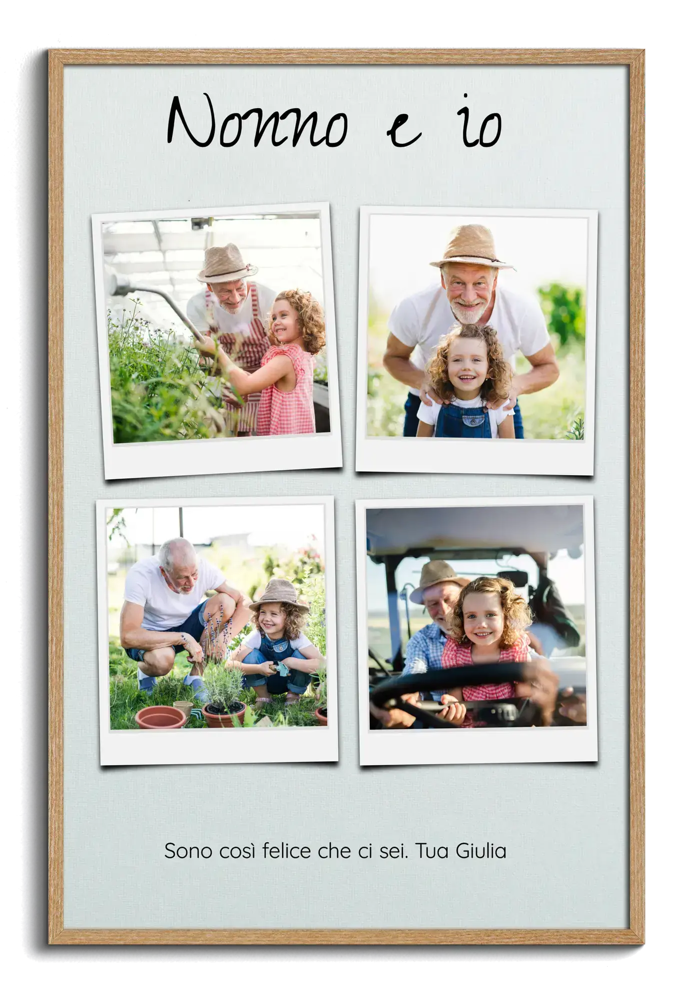 Inizia ora e crea la tua stampa personalizzata. Ecco un esempio: stile Polaroid pensato per il nonno, con quattro foto di nonno e nipotina e una dedica tipo Nonno e io, sono così felice che tu ci sia, tua NOME. Perfetto per compleanni, festività o come gesto affettuoso. Foto, testo e impaginazione sono tutti personalizzabili.